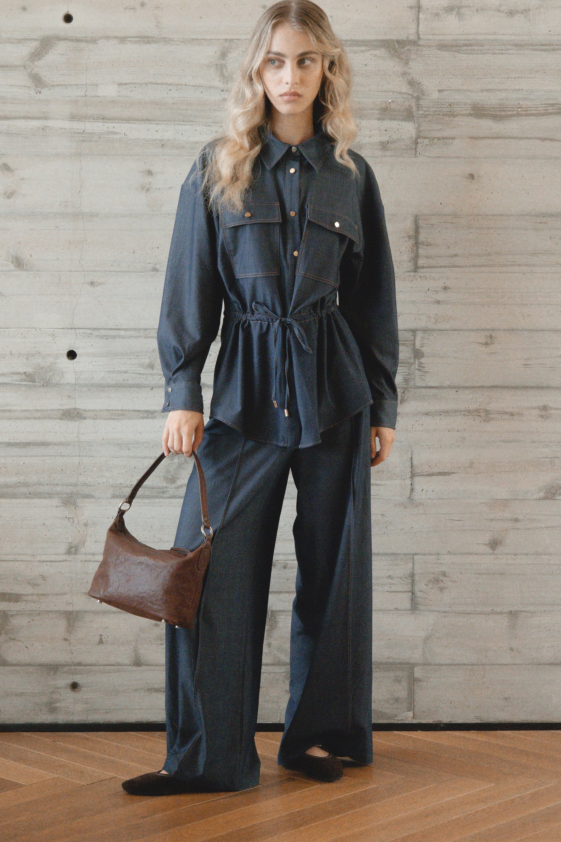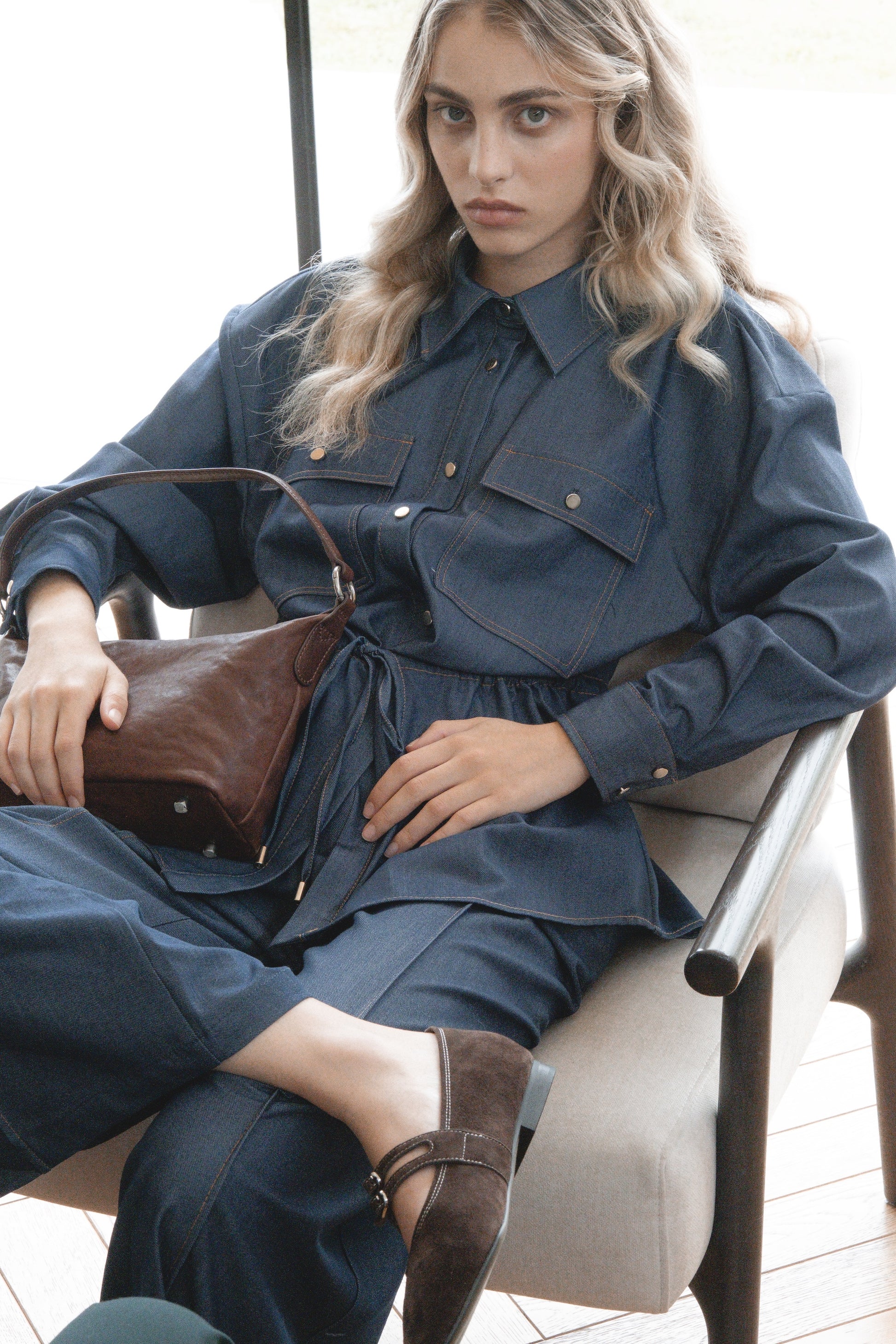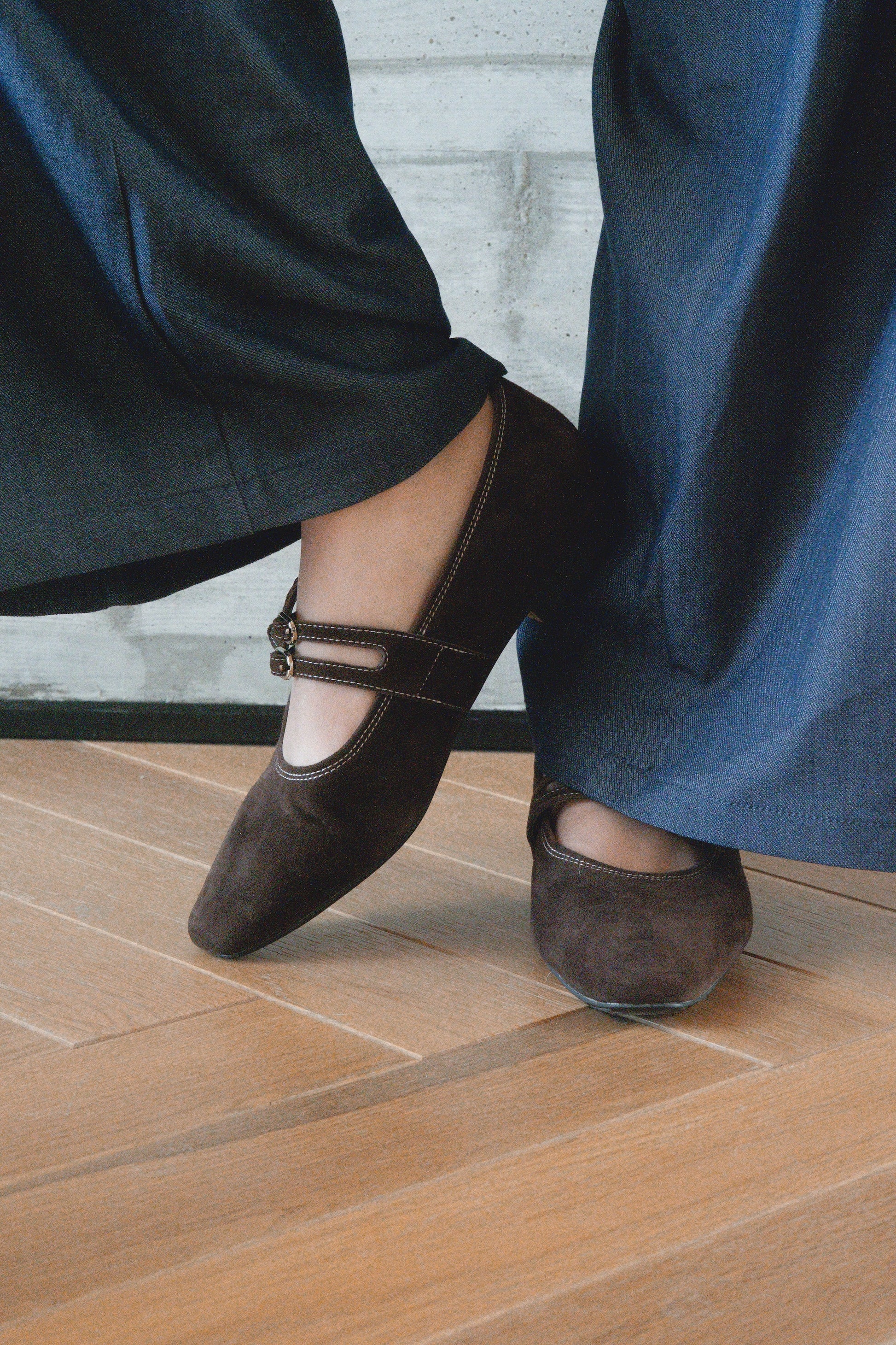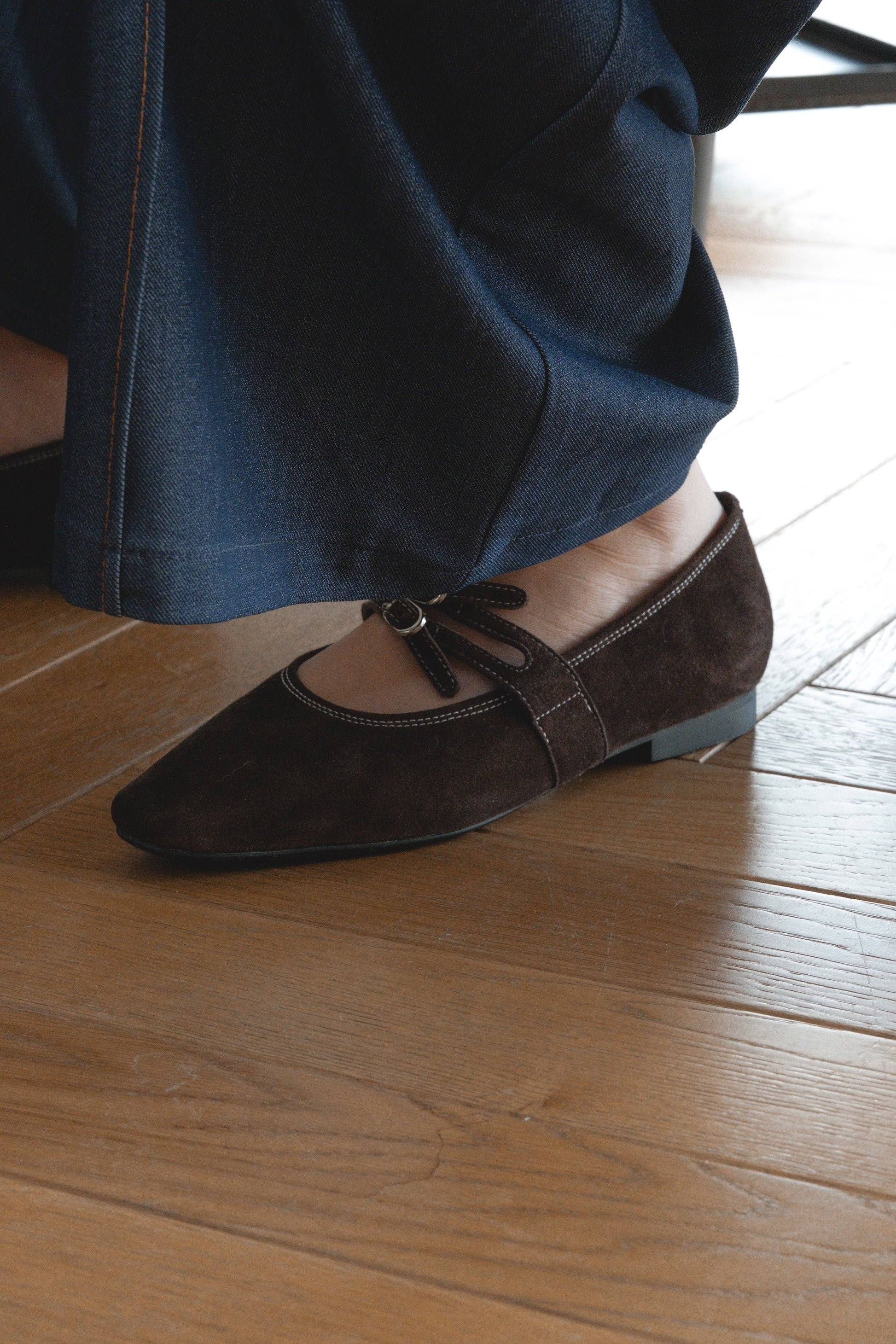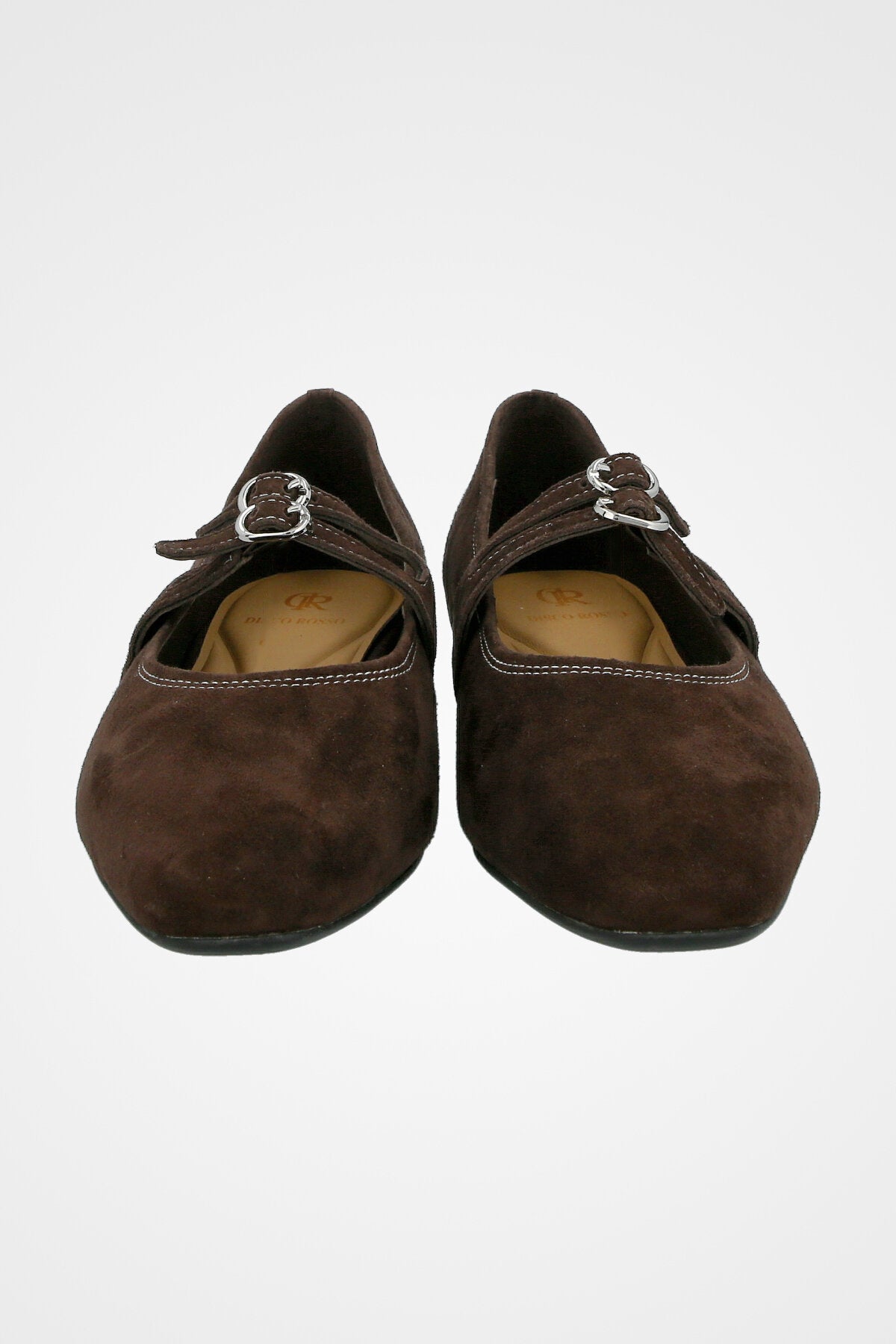 נעל בלרינה חומה זמש, עם שתי רצועות וסוגרי אבזם כסף כפולים לעיטור אלגנטי