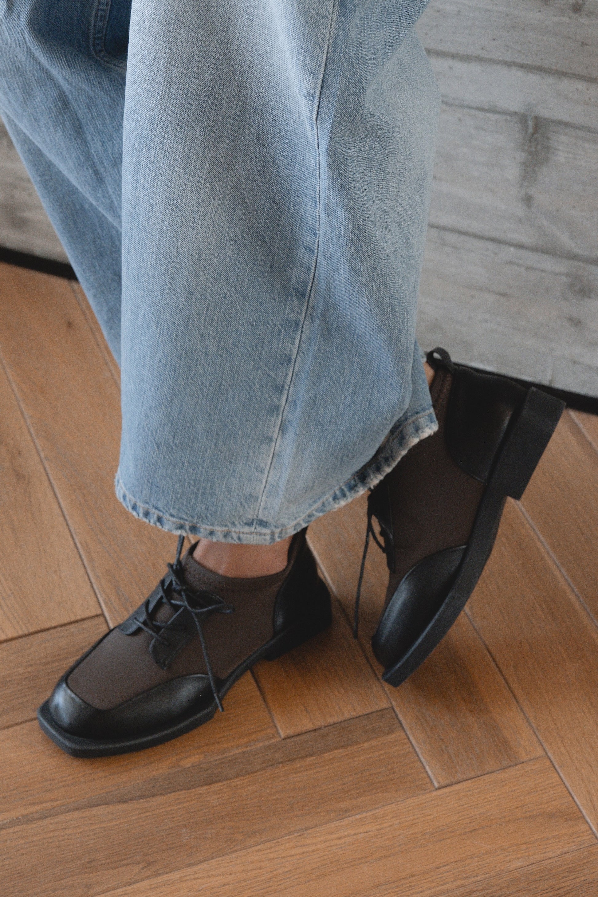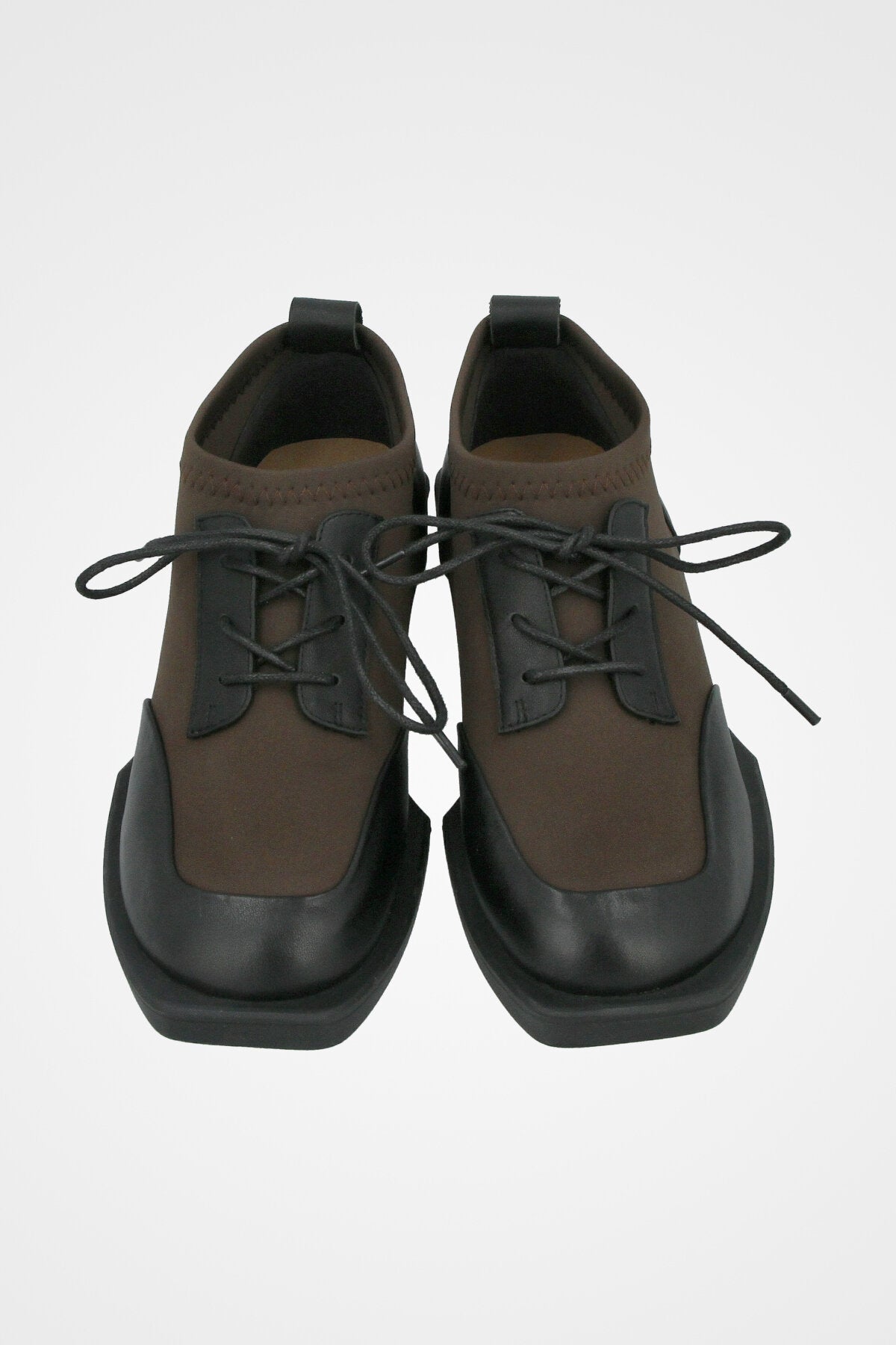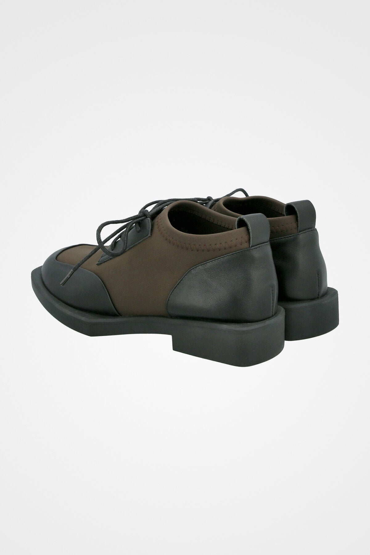 נעל בד בצבע חום כהה בעלת שרוכים קדמיים ,עיטורי עור שחורים וסוליה דקה בצבע שחור