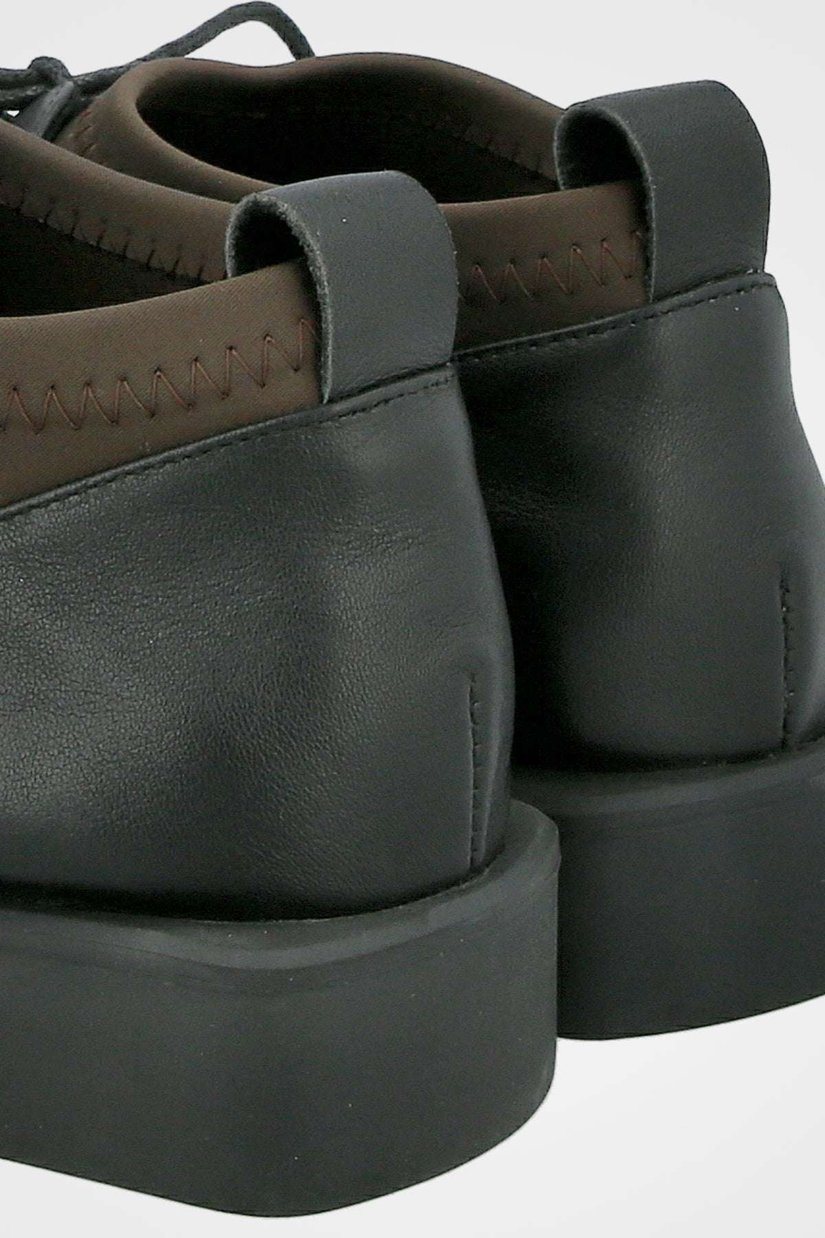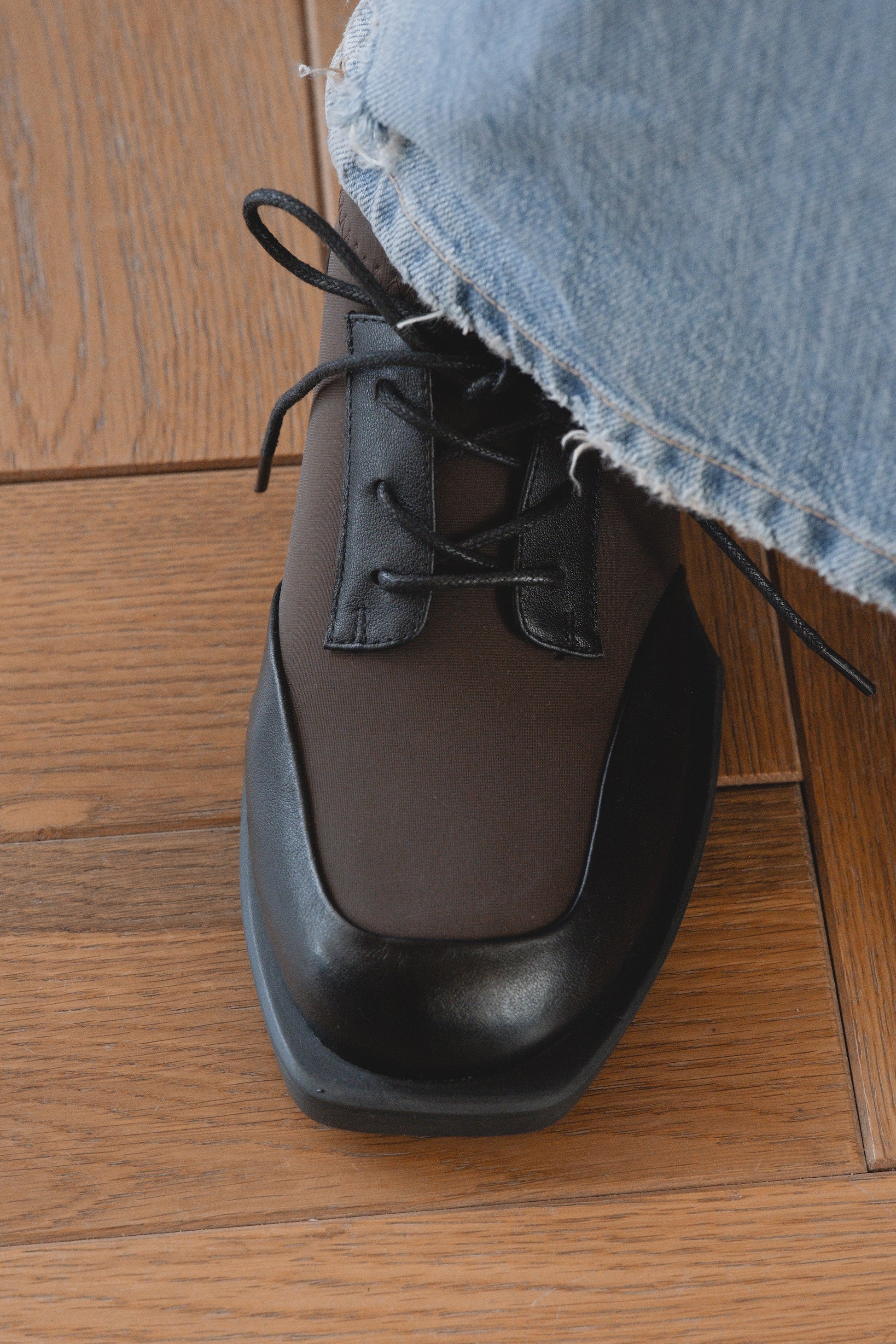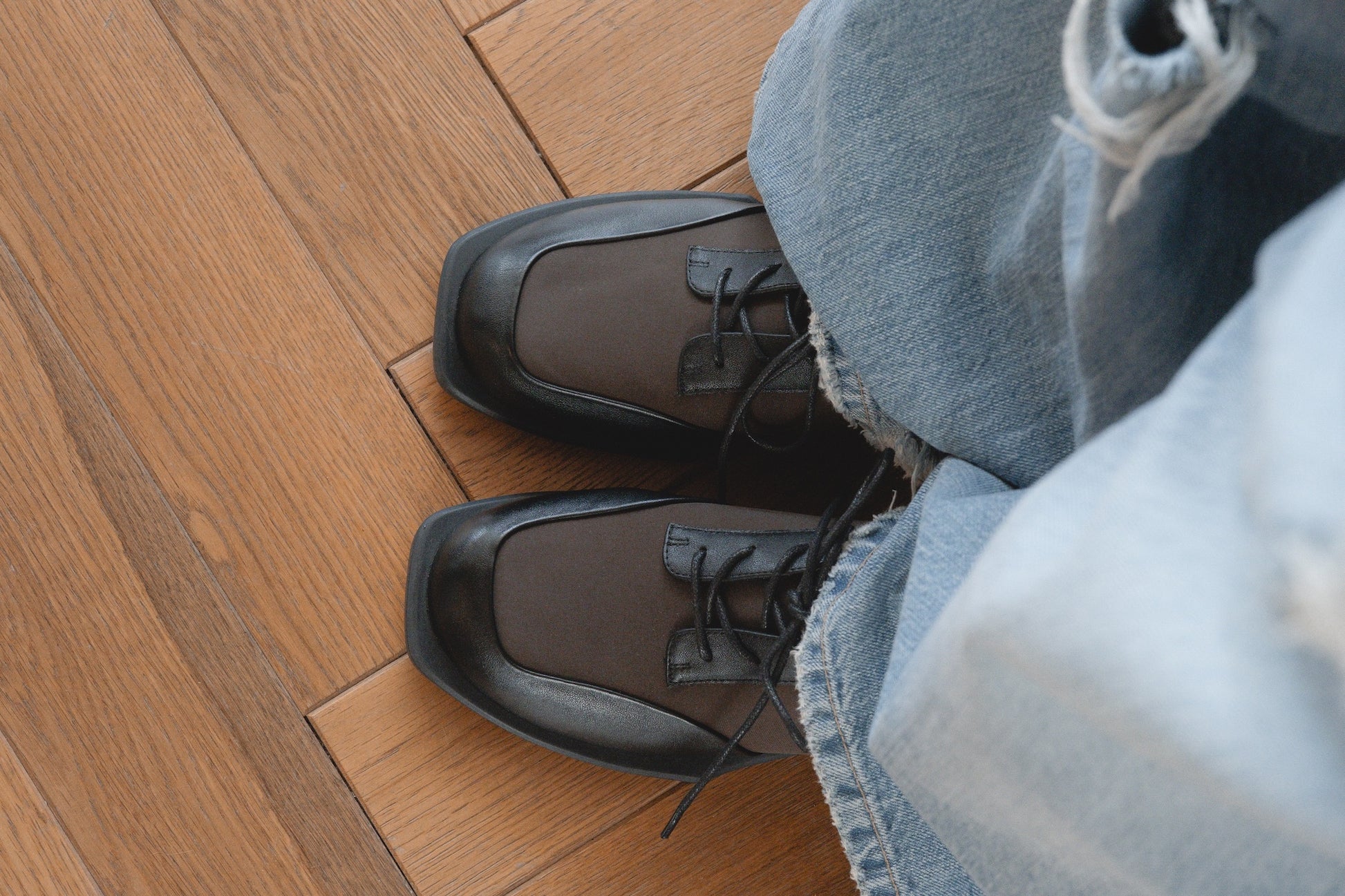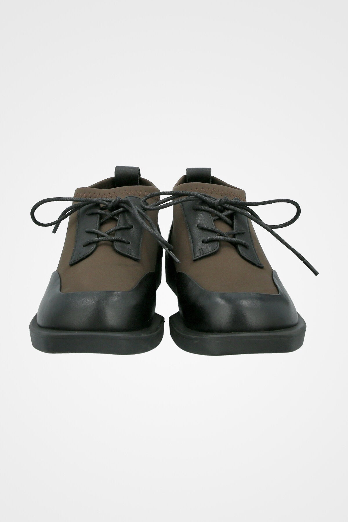 נעל בד בצבע חום כהה בעלת שרוכים קדמיים ,עיטורי עור שחורים וסוליה דקה בצבע שחור