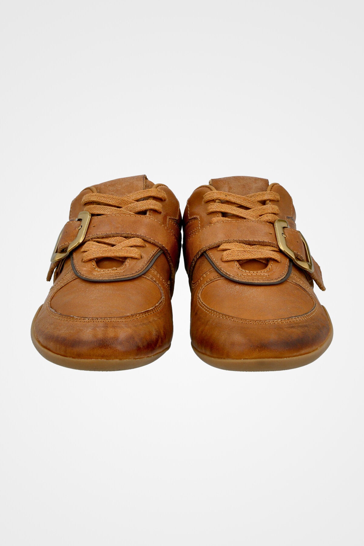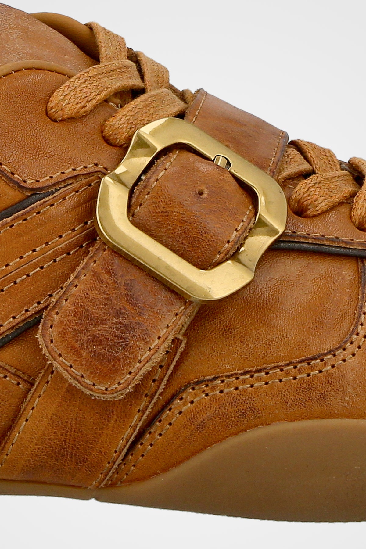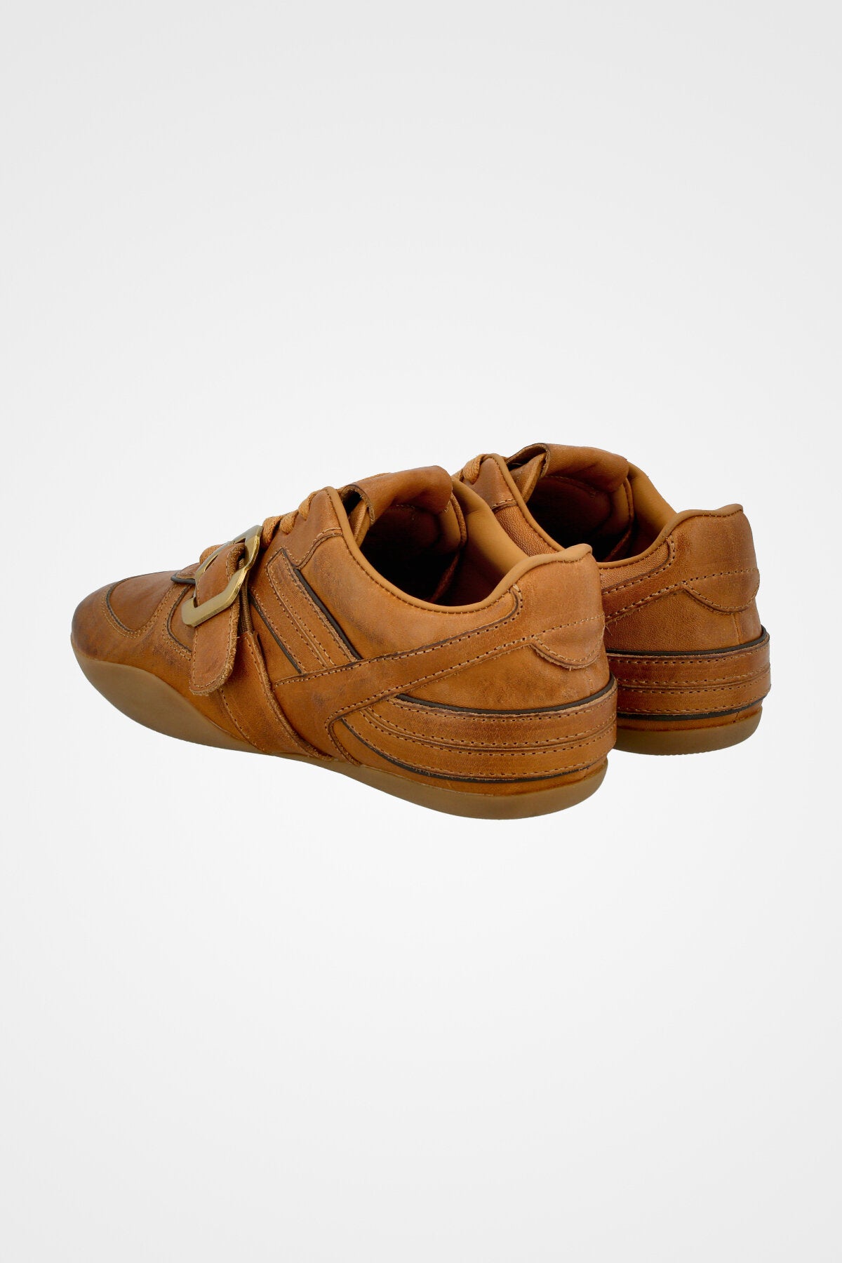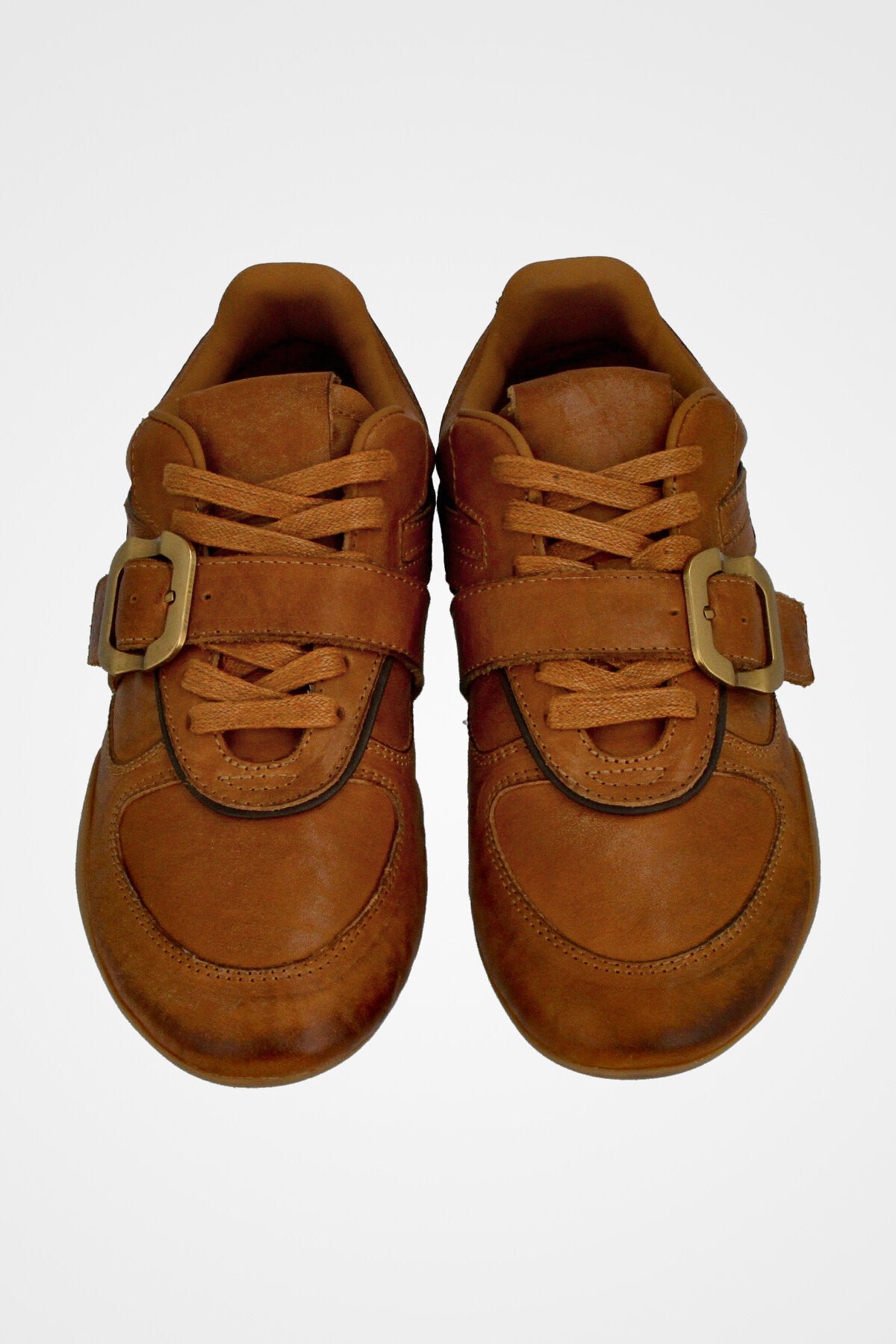 נעלי סניקרס בצבע חום דבש בעלות חגורת אבזם בצבע זהב וסולייה דקה ותואמת בצבע דבש