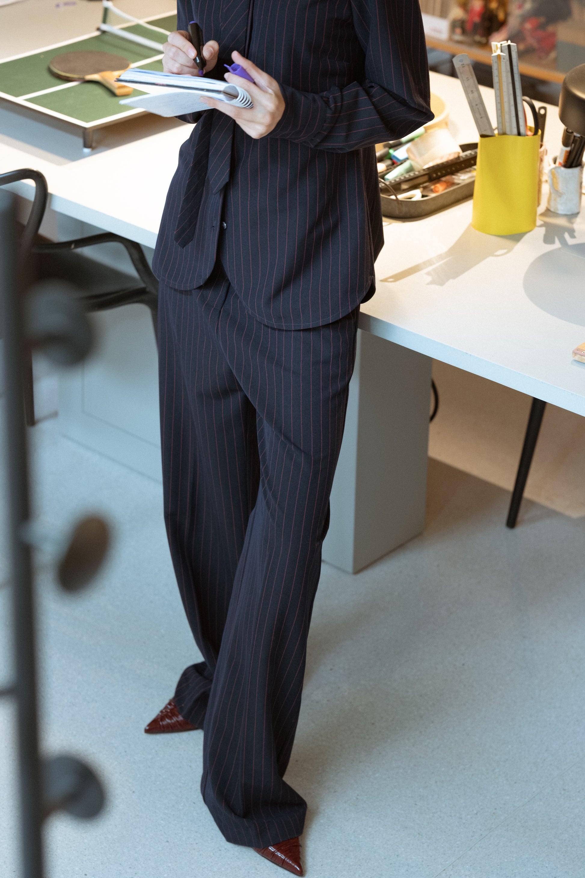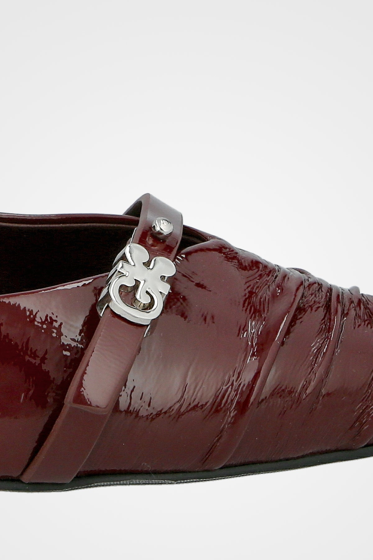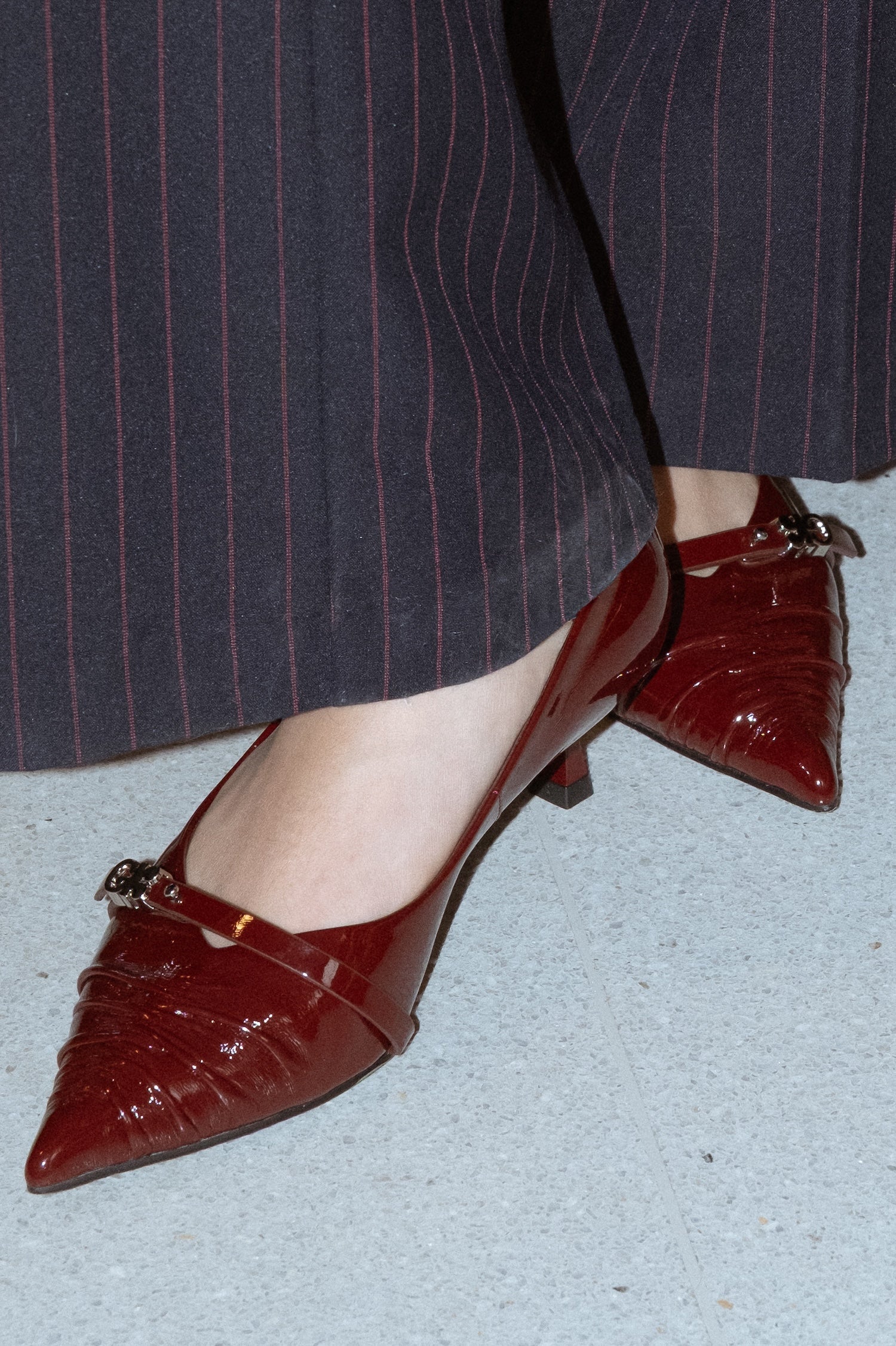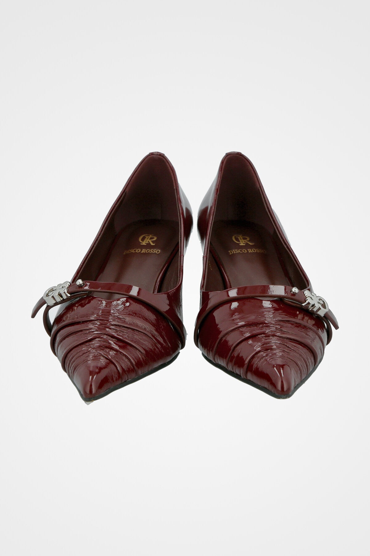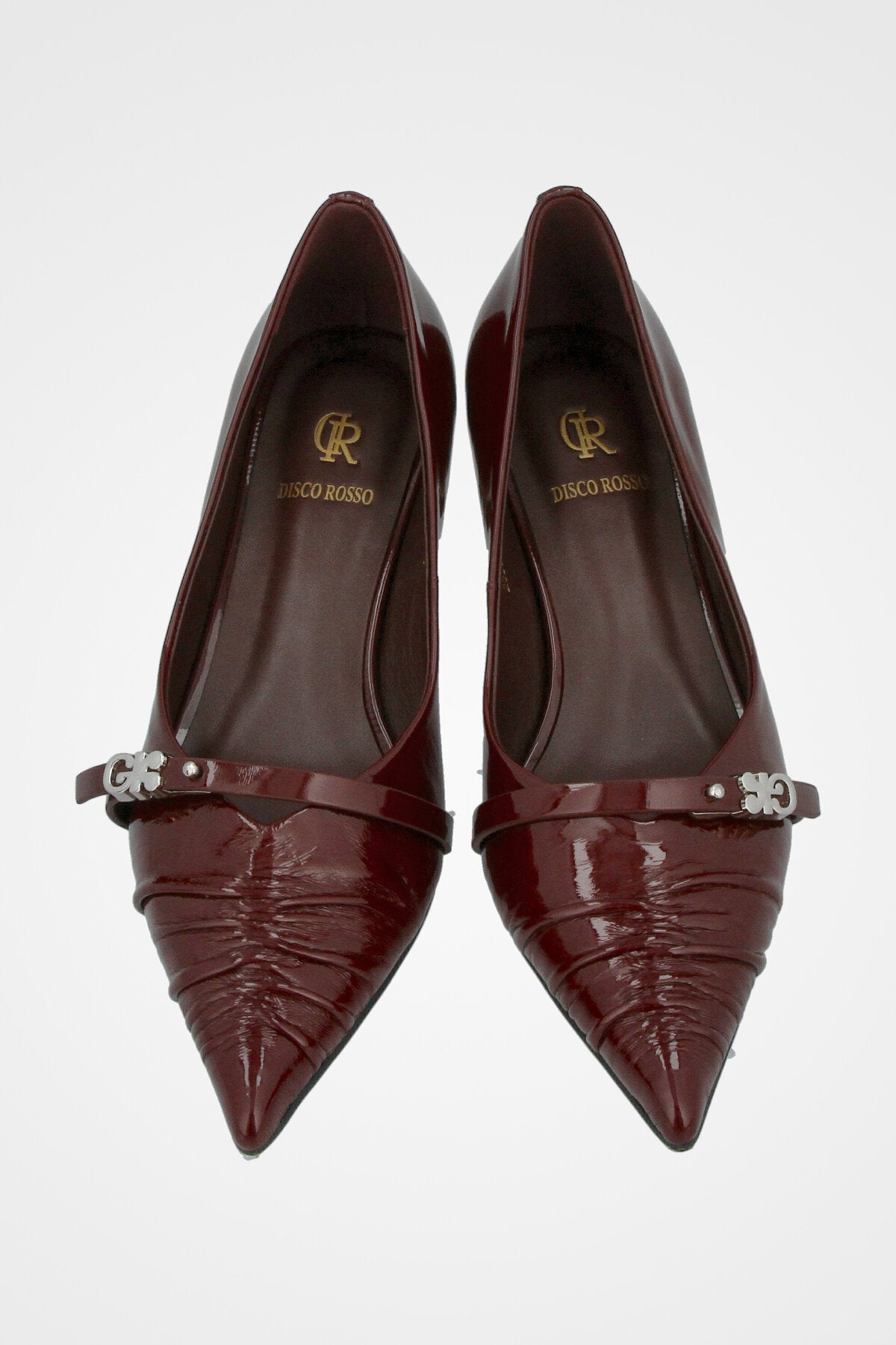 נעלי עקב שפיץ בצבע בורוד לק , עם כיווץ עדין בחזית ורצועת קרסול דקה עם אבזם מתכתי קטן.