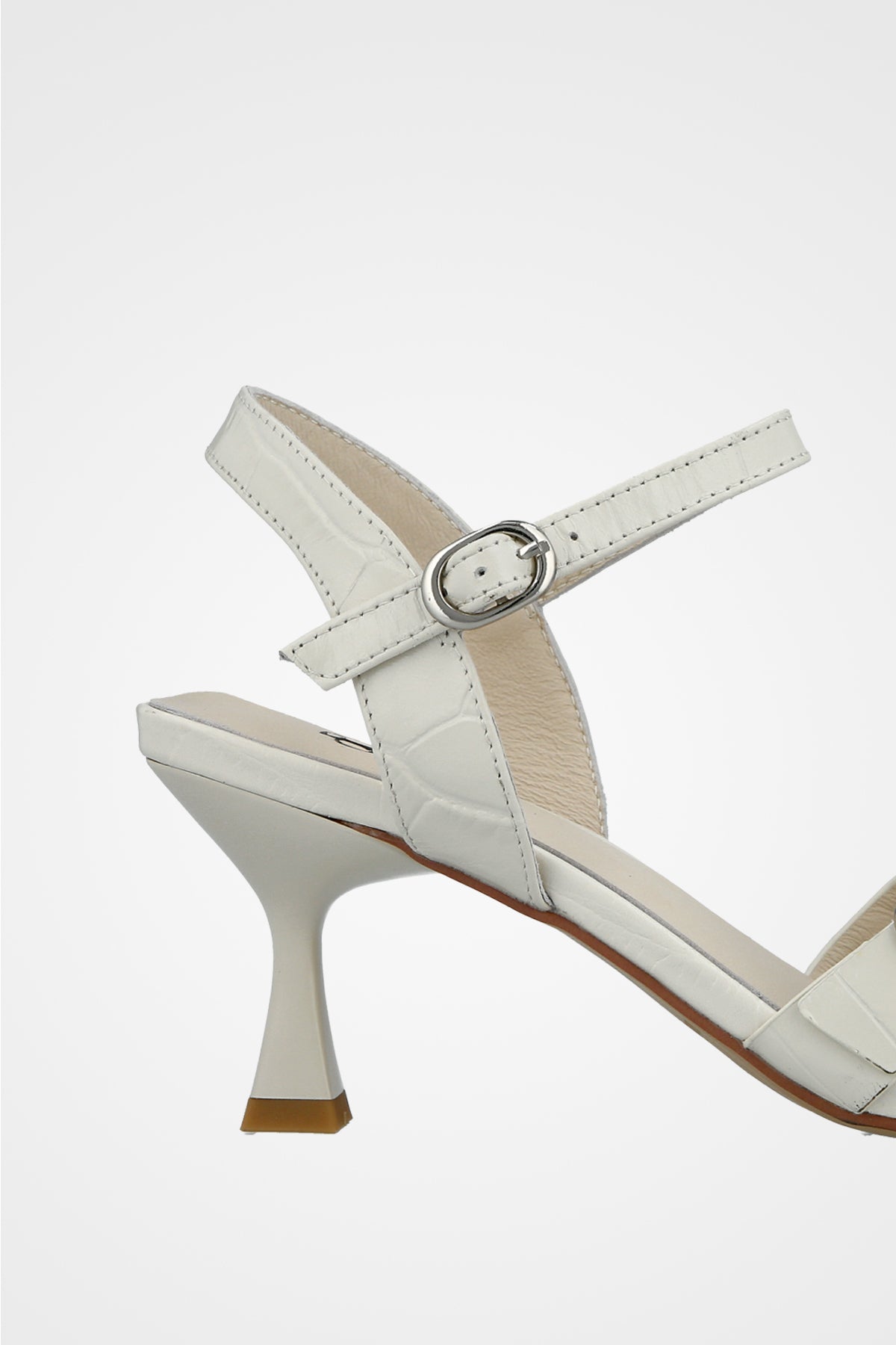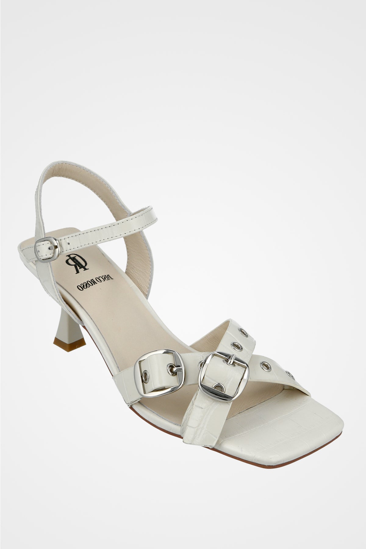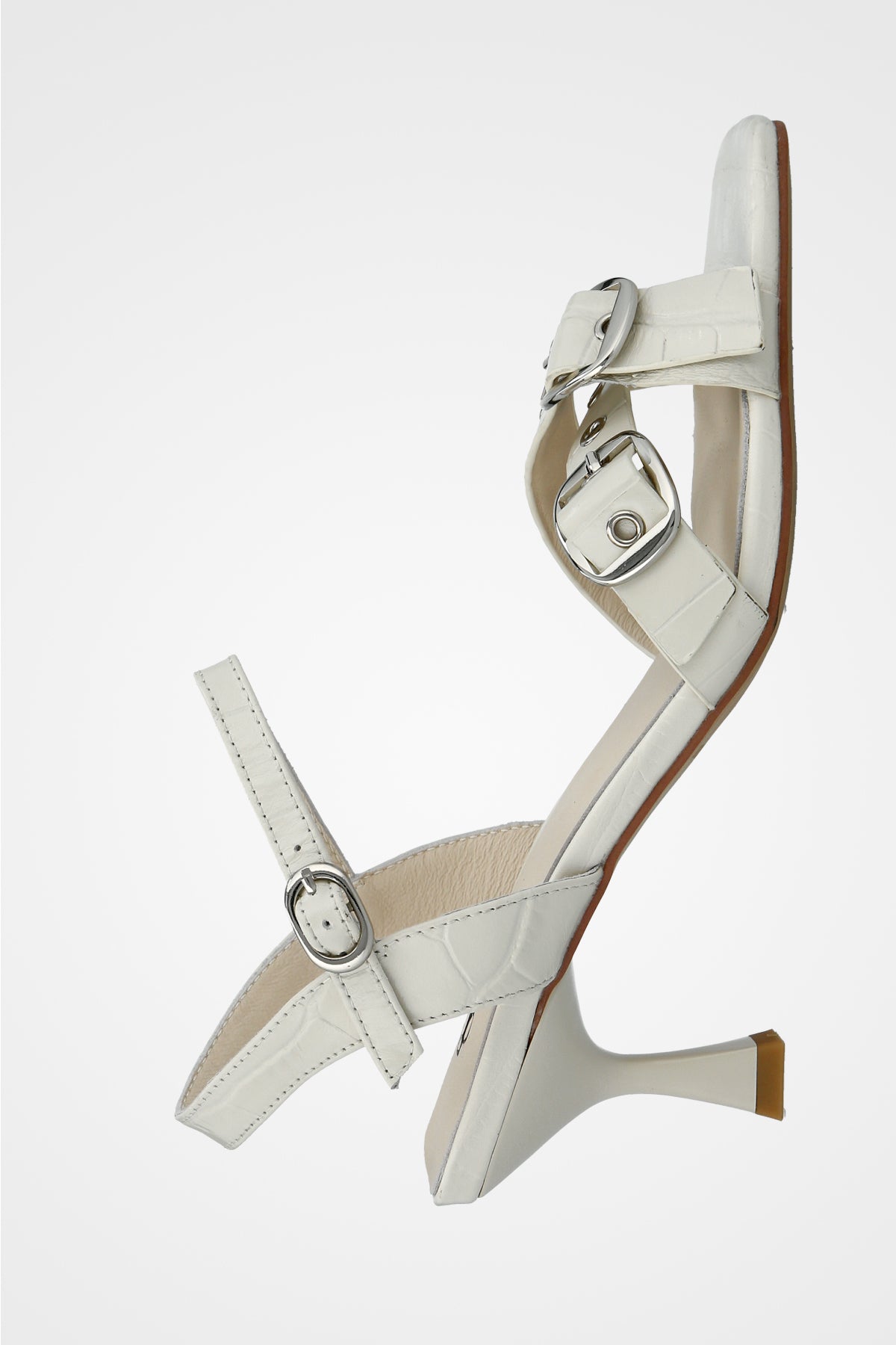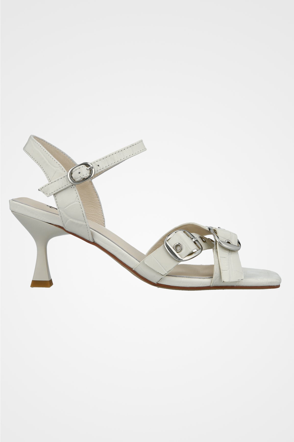 סנדל עקב בצבע לבן, עם רצועות רחבות ו-2 אבזמי מתכת כסופים, עקב דק בעל עיצוב מודרני
