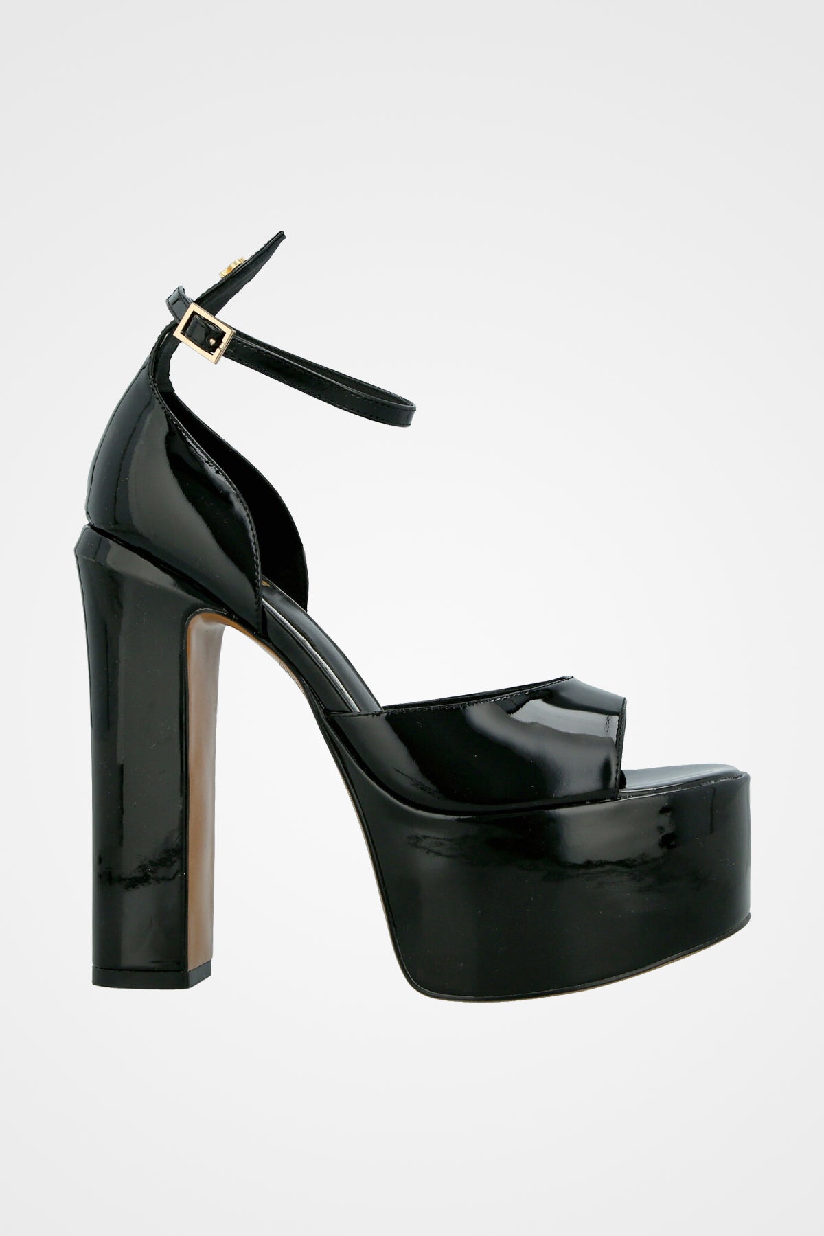 סנדל עקב שחור עם פלטפורמה גבוהה, עקב רחב ורצועת קרסול דקה עם אבזם זהוב.