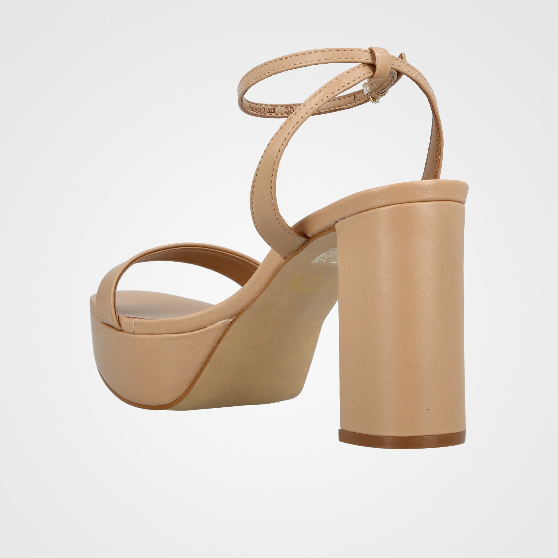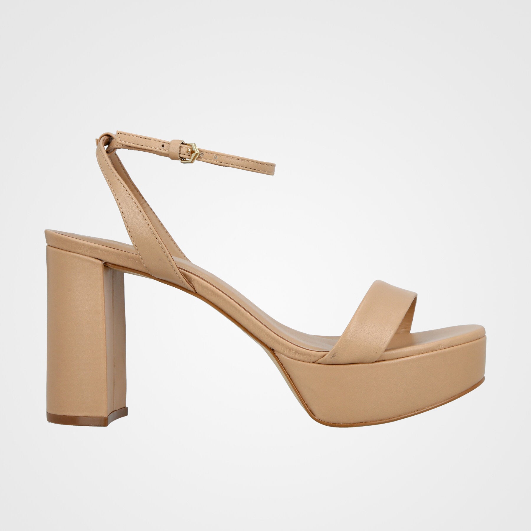 סנדל עקב פלטפורמה בצבע לבן, בעל עקב רחב ורצועה דקה בחזית למראה קלאסי