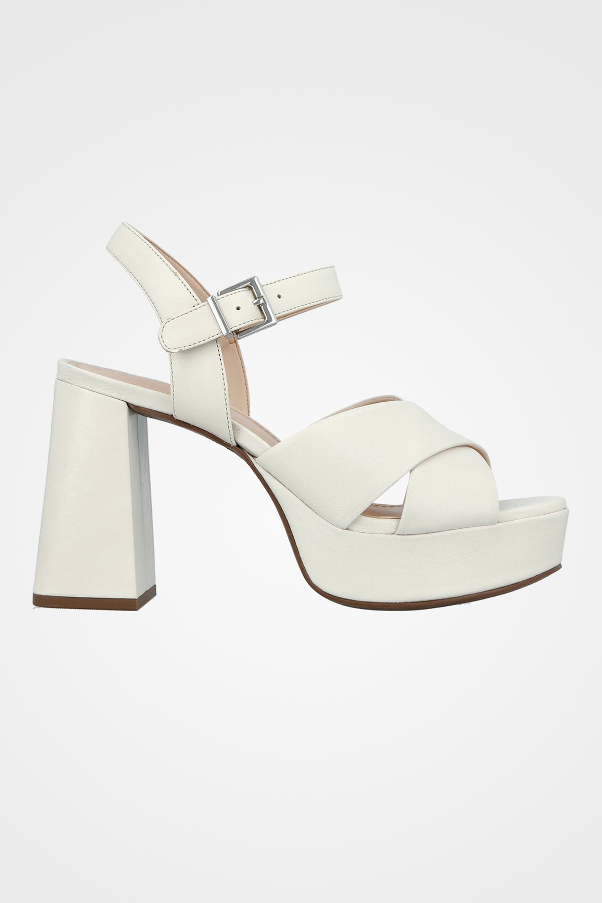סנדל עקב פלטפורמה בצבע לבן, עם רצועות מוצלבות ועקב רחב וגבוה