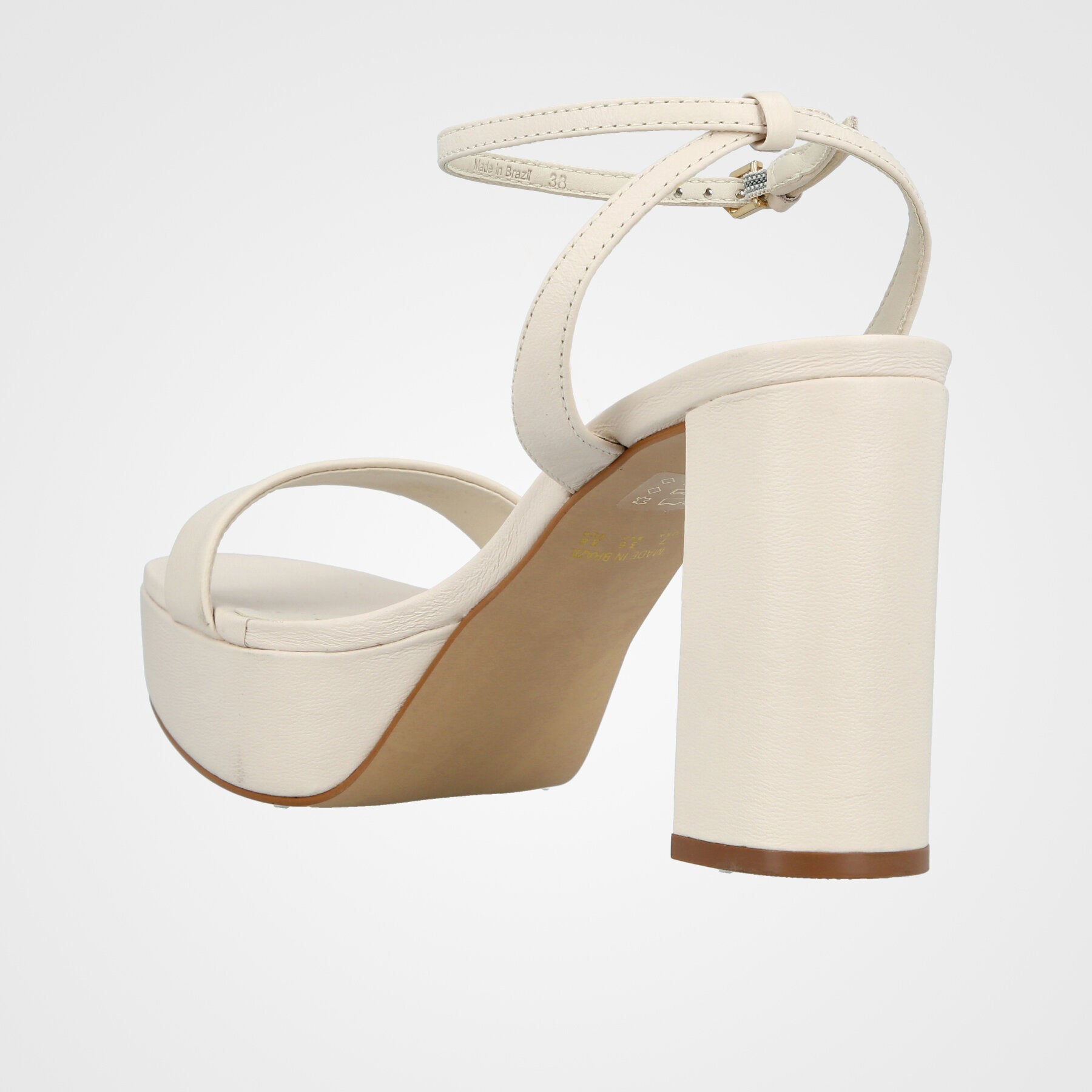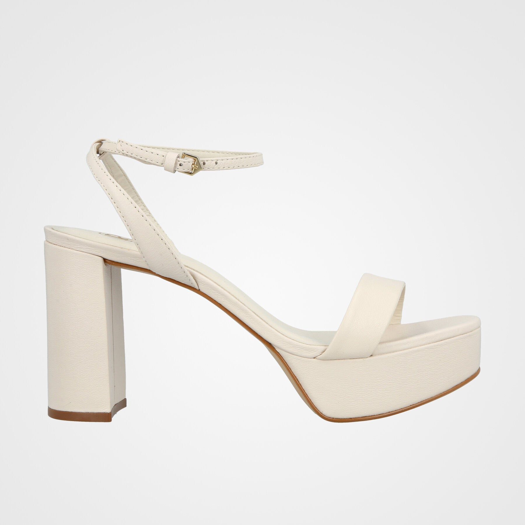 סנדל עקב פלטפורמה בצבע לבן, בעל עקב רחב ורצועה דקה בחזית למראה קלאסי