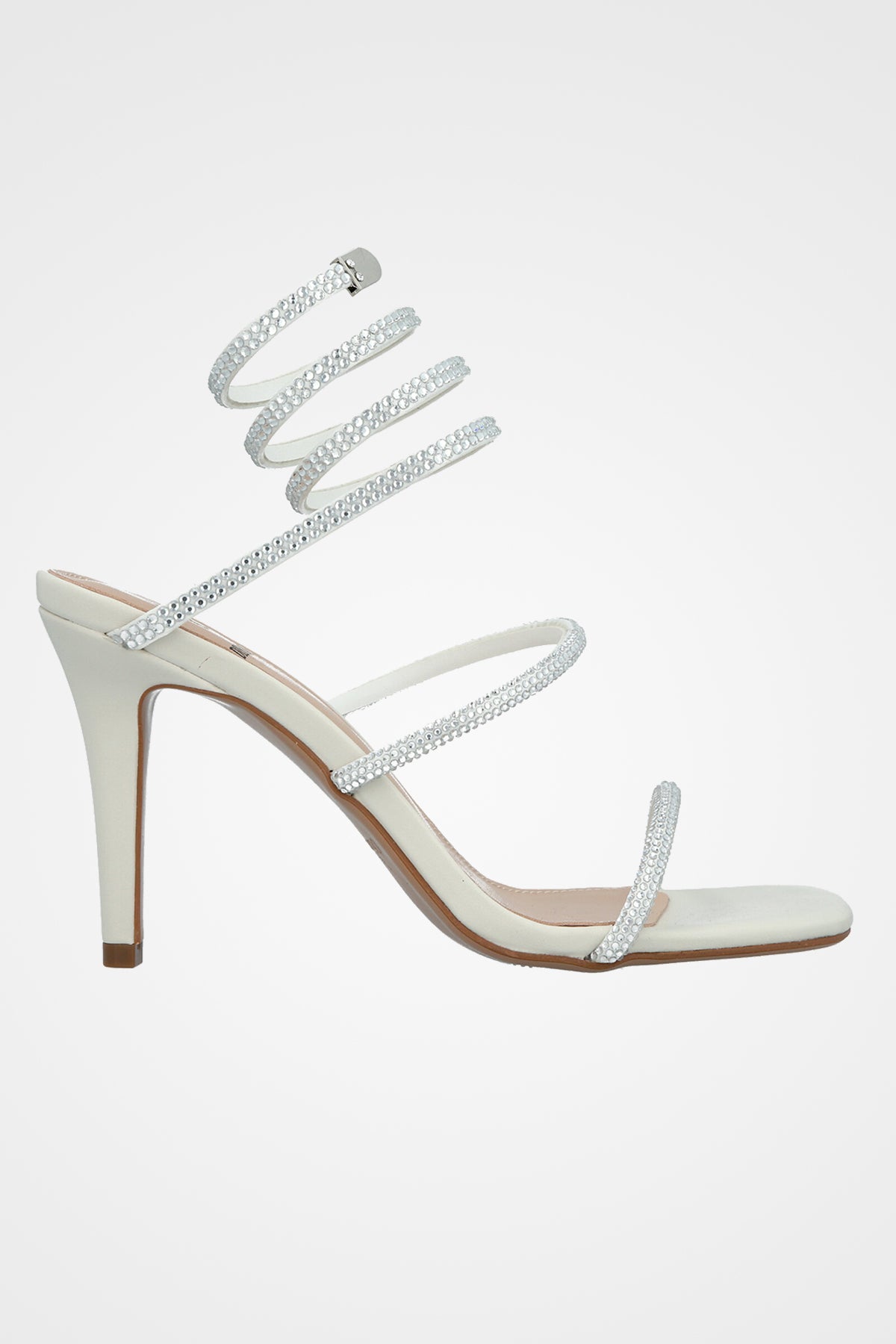 עקב סנדל בצבע לבן עם רצועות דקות בצורת ספירלה מעניק מראה אלגנטי ומואר לרגל