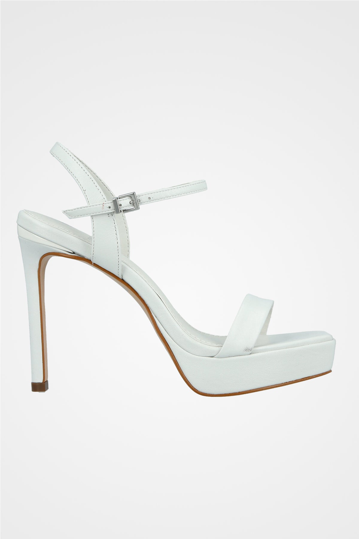 סנדל פלטפורמה בצבע לבן , עם עקב רחב, קידומת מרובעת ורצועת קרסול מתכווננת עם אבזם קטן