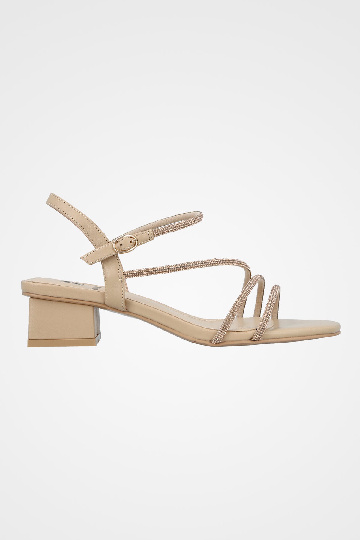 עקב סנדל בצבע ניוד , עם רצועות דקות וחזית מרובעת בעל עקב נמוך ורחב