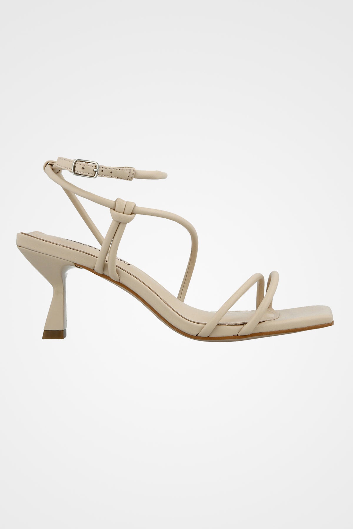 סנדל עקב דק בצבע ניוד, עם רצועות אלכסוניות דקות בעיצוב מינימליסטי, רצועת קרסול וסגירה באבזם תואם