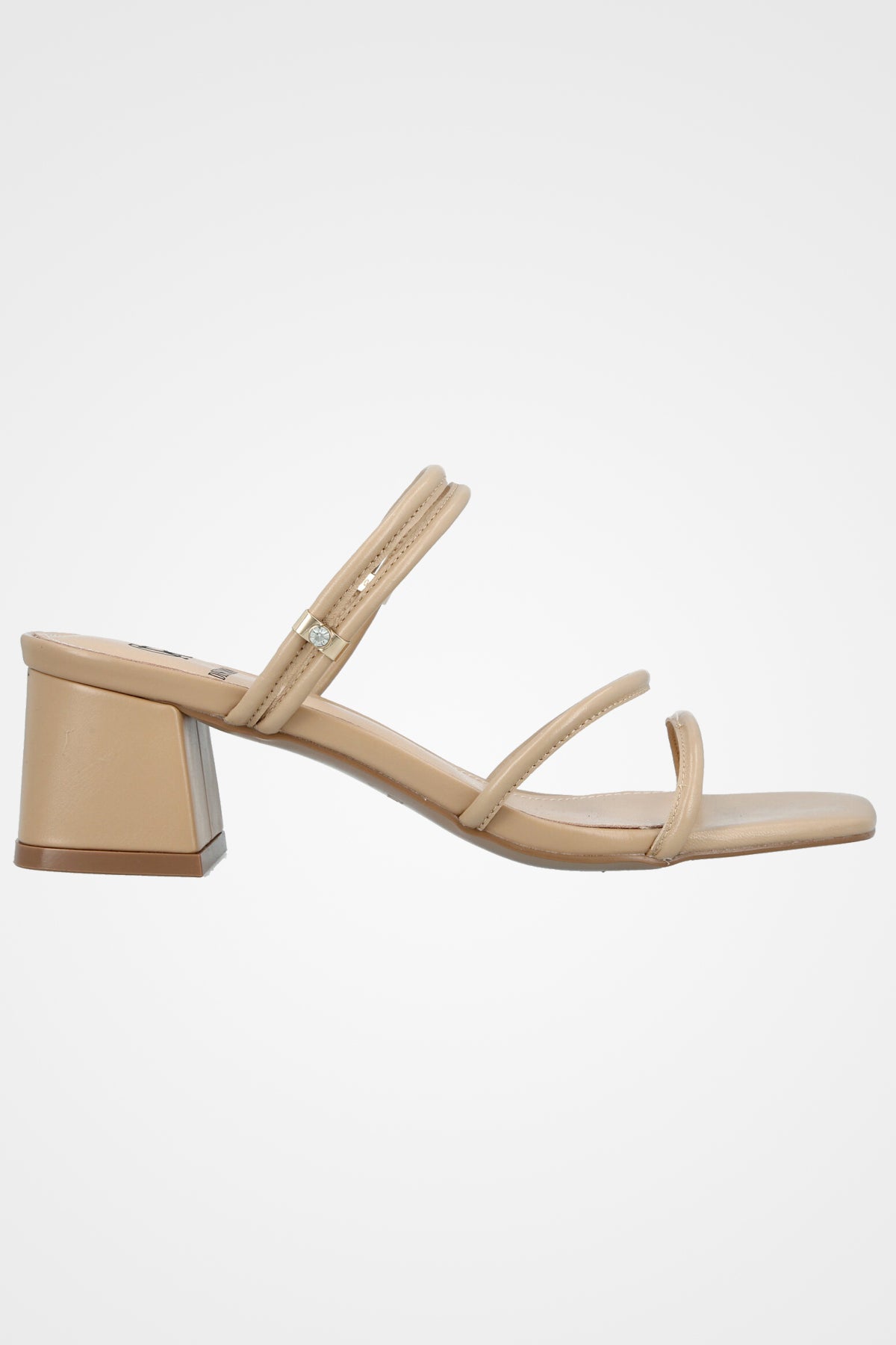 סנדל עקב בינוני בצבע ניוד, עם רצועות דקות ומינימליסטיות ועקב רחב ליציבות ונוחות