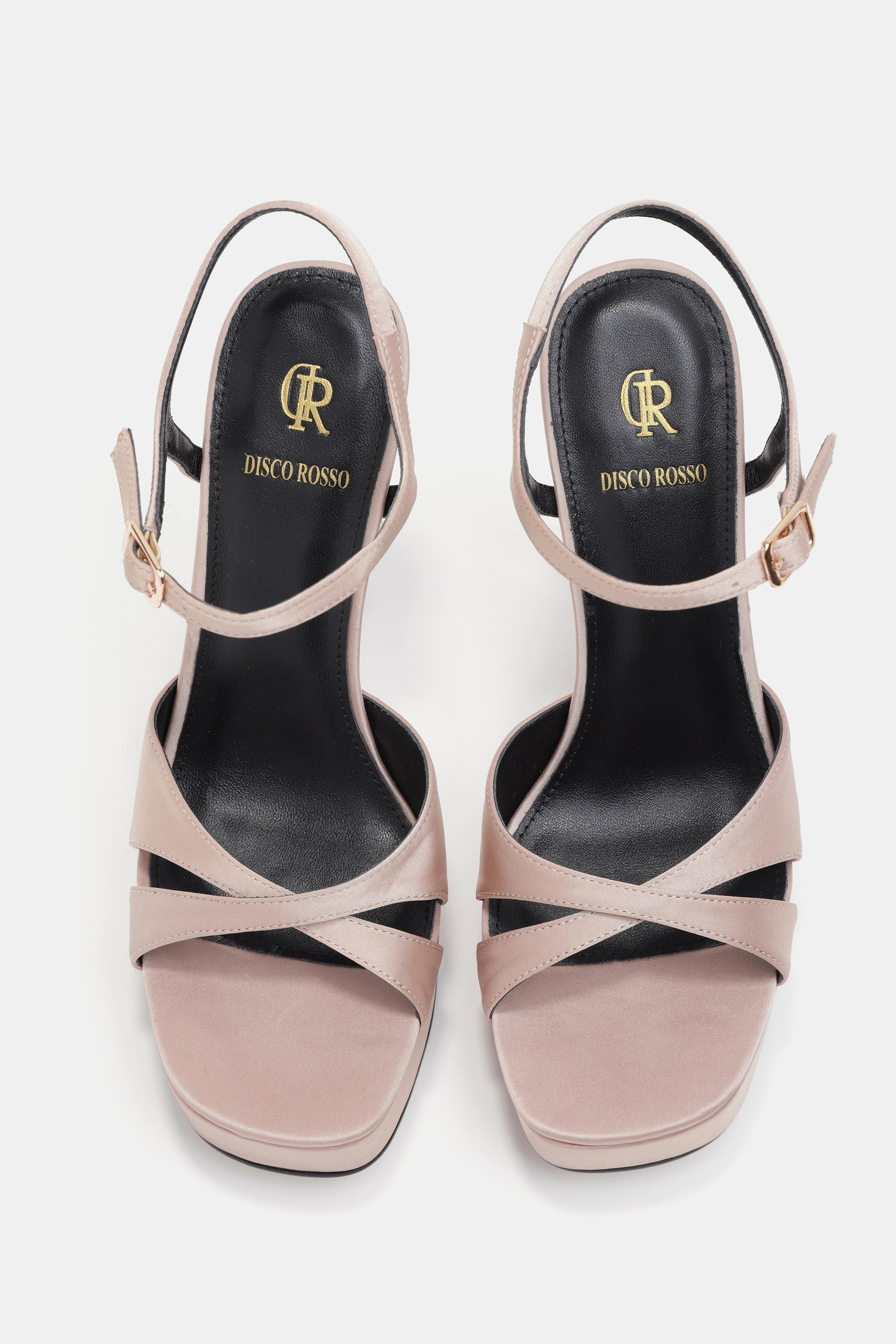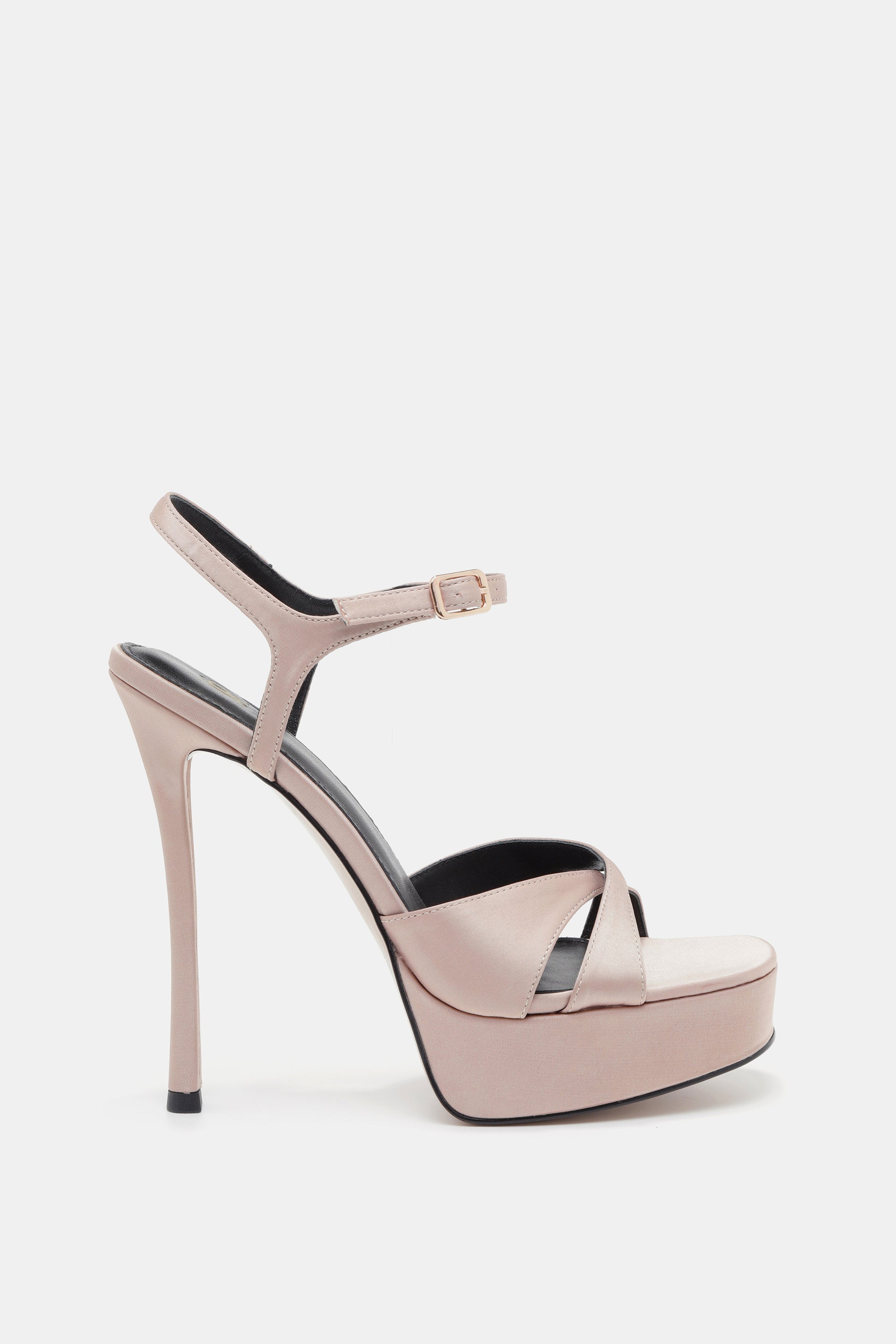 סנדל פלטפורמה בצבע טבעי סטן, רצועות מצטלבות, רצועת קרסול עם אבזם ועקב גבוה ומרשים