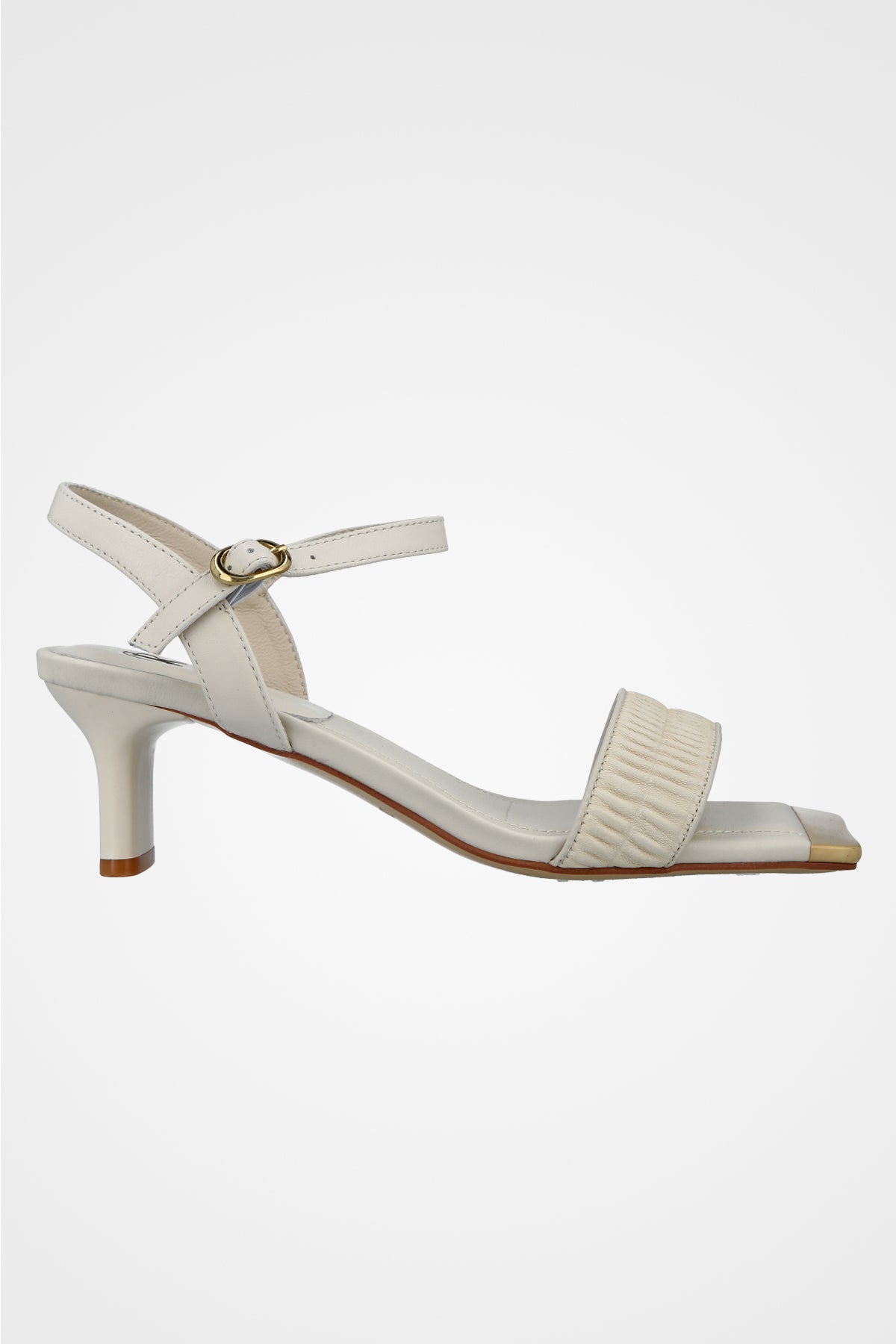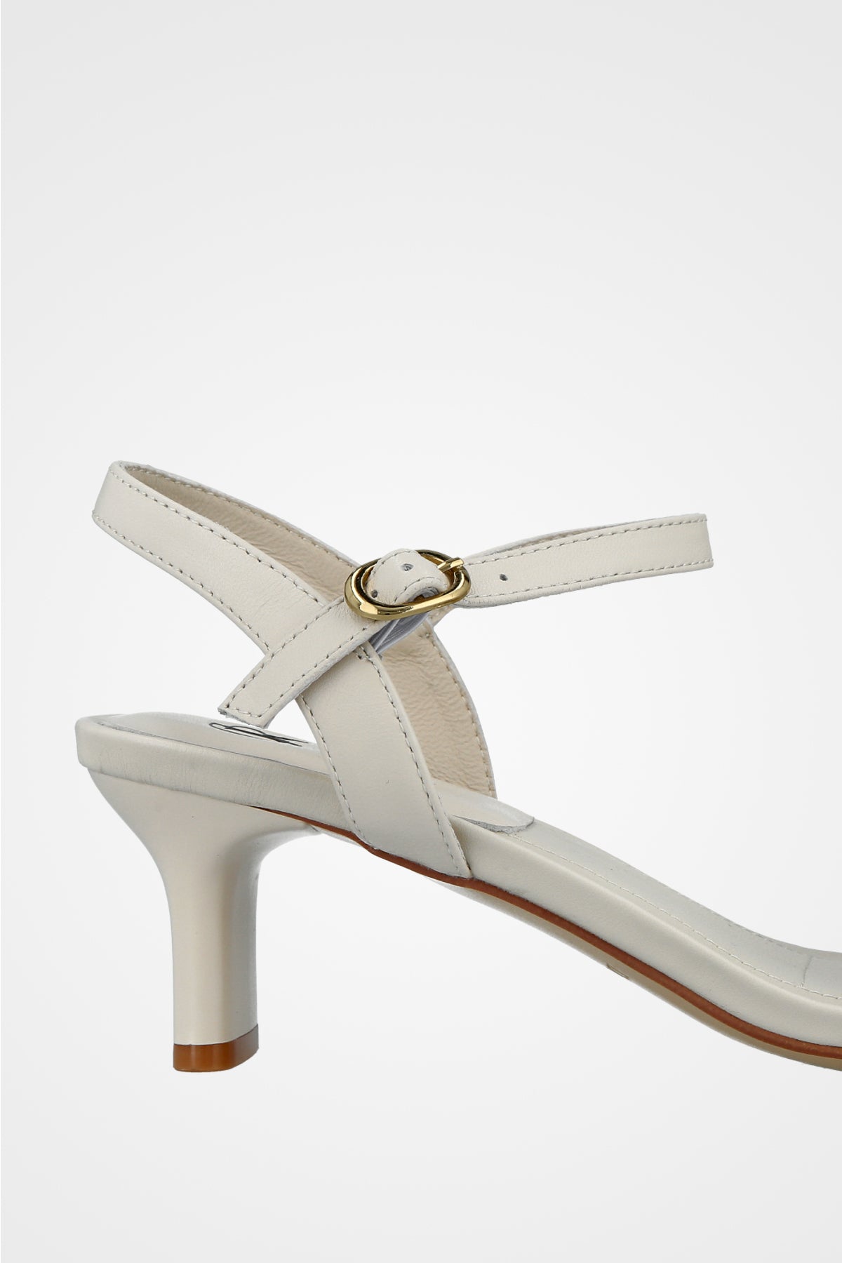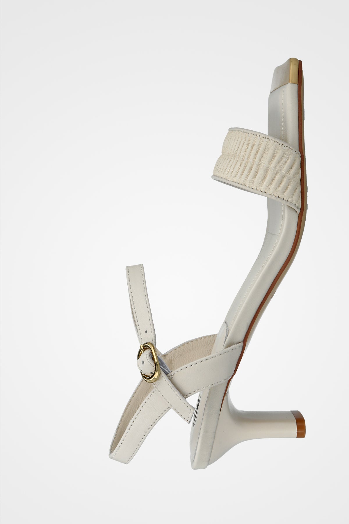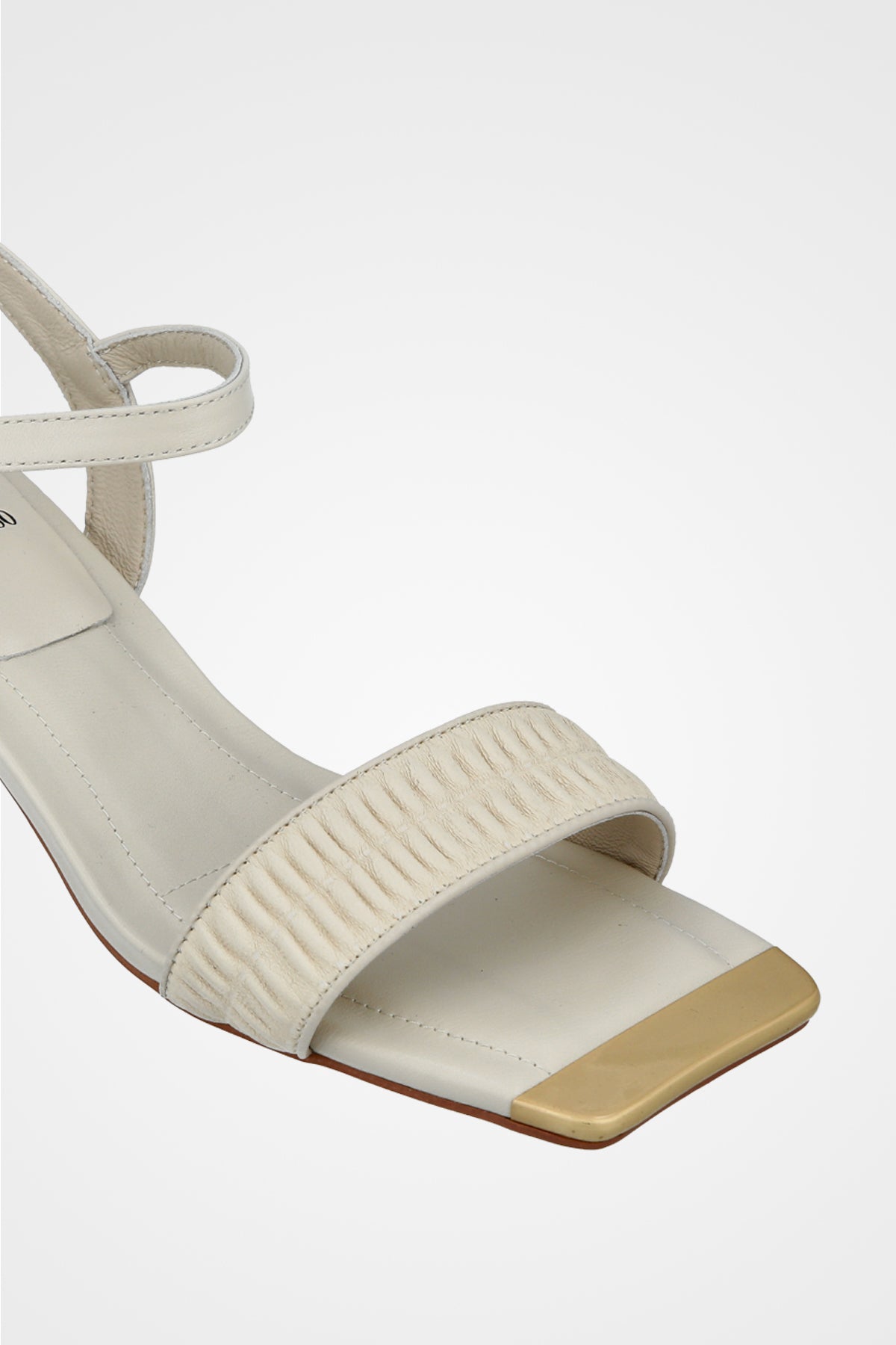 סנדל עקב לבן , עם רצועה בעלת כיווצים בחזית ועקב נמוך למראה קלאסי