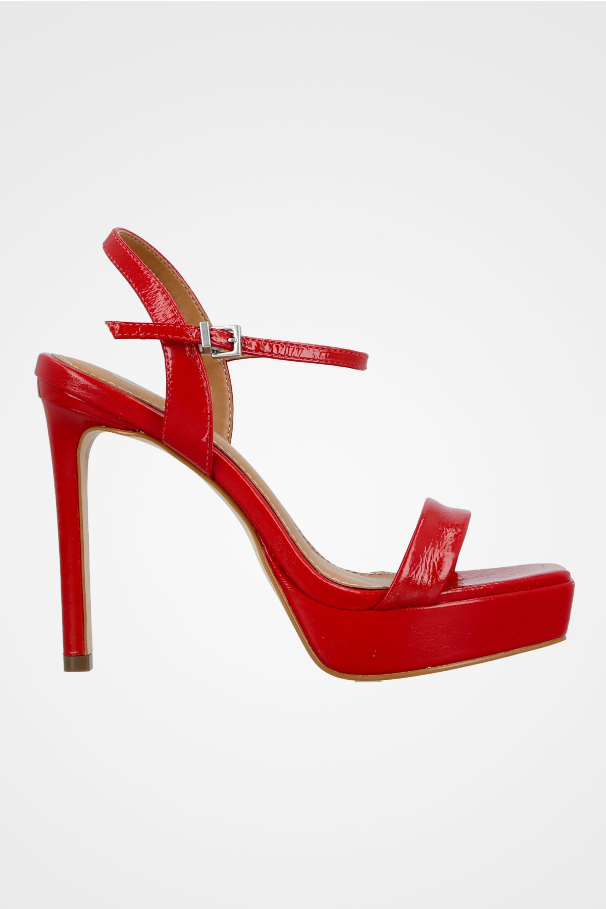 סנדל פלטפורמה בצבע אדום , עם עקב רחב, קידומת מרובעת ורצועת קרסול מתכווננת עם אבזם קטן