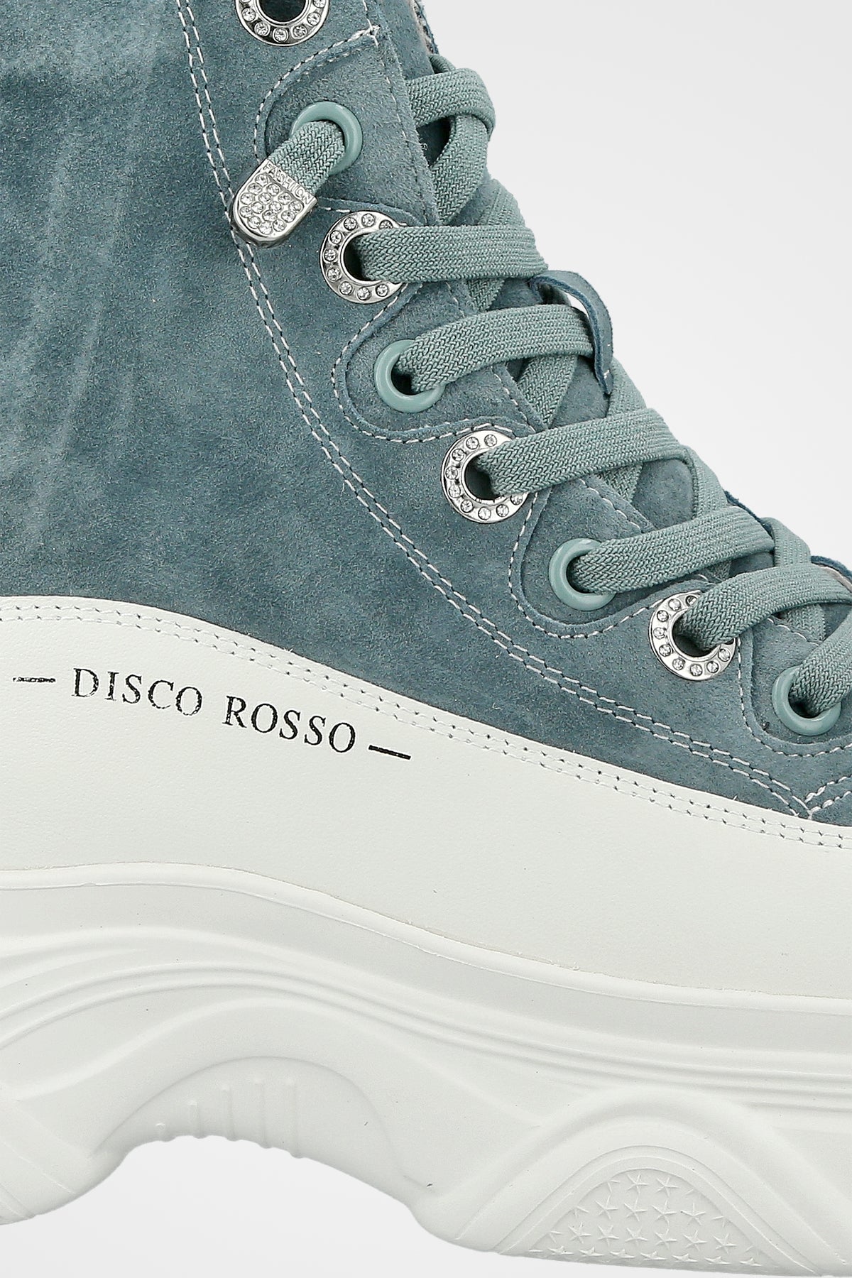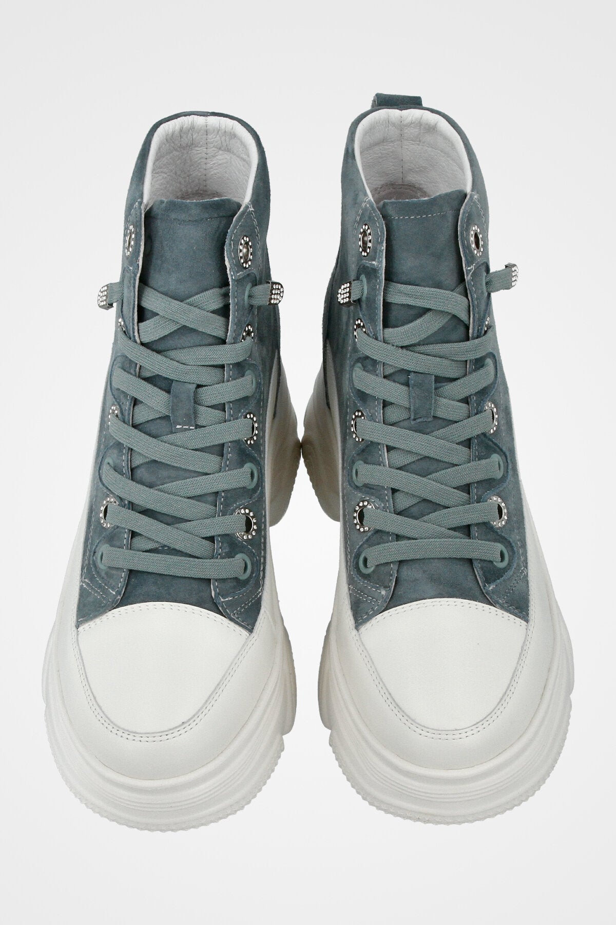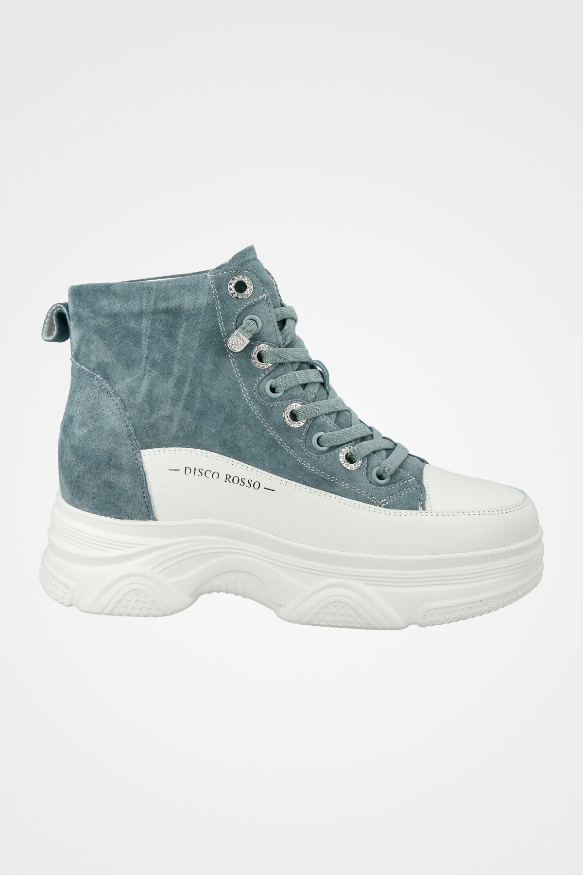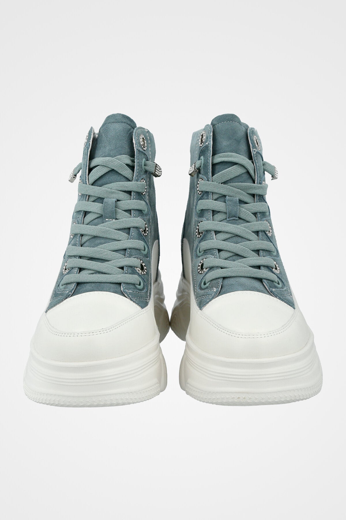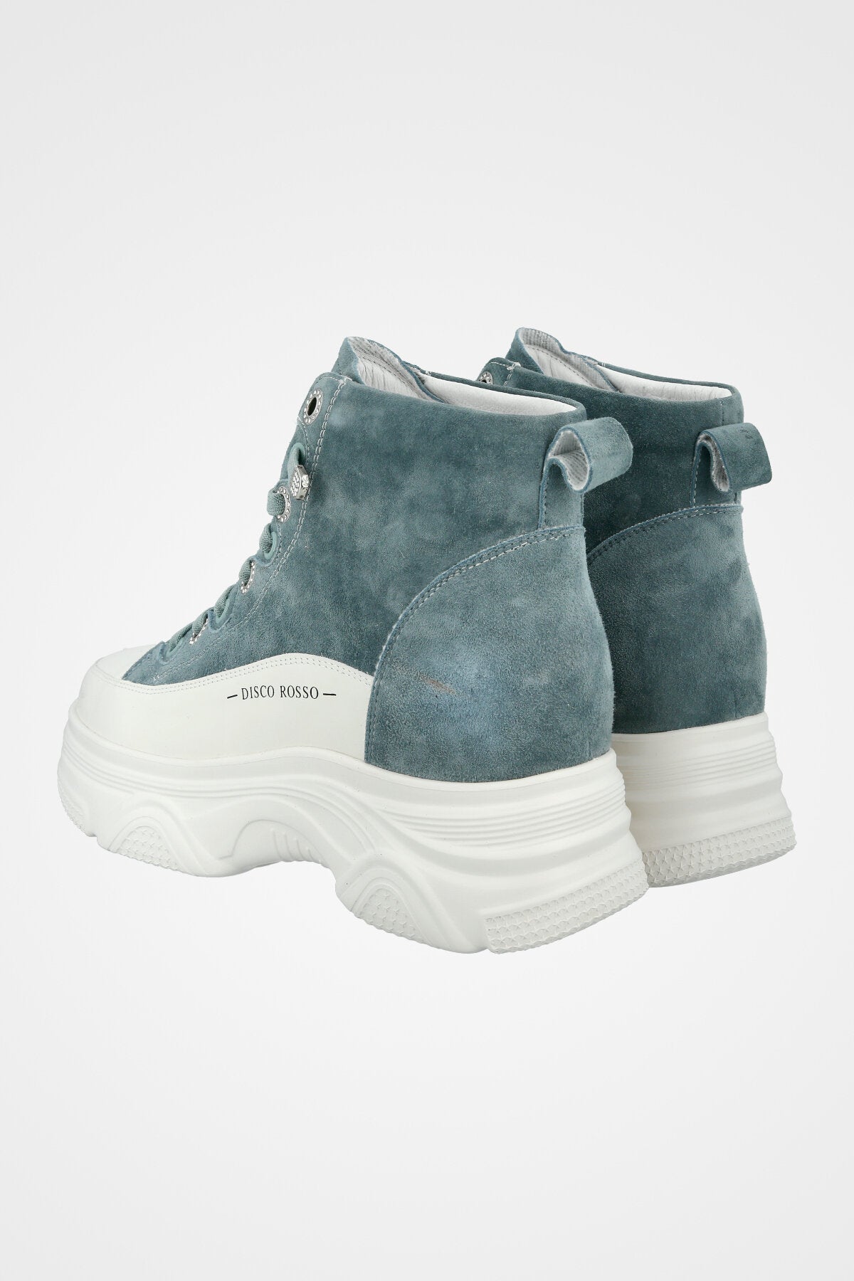 נעל סניקרס גבוהה בצבע כחול בעלת שרוכים מגומי, עיטורים בצידי הנעל וסוליה לבנה עבה ומחורצת