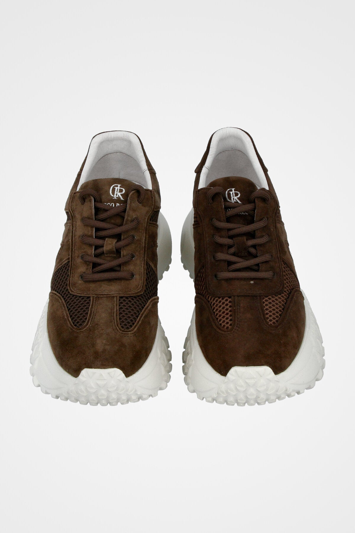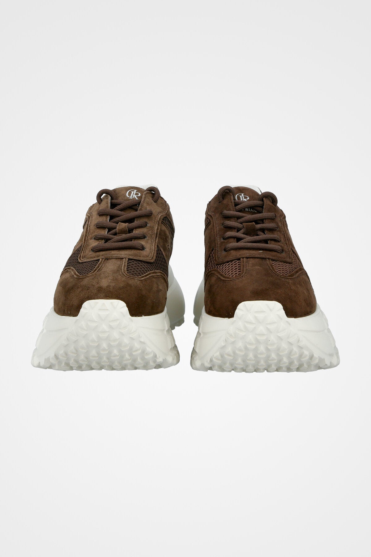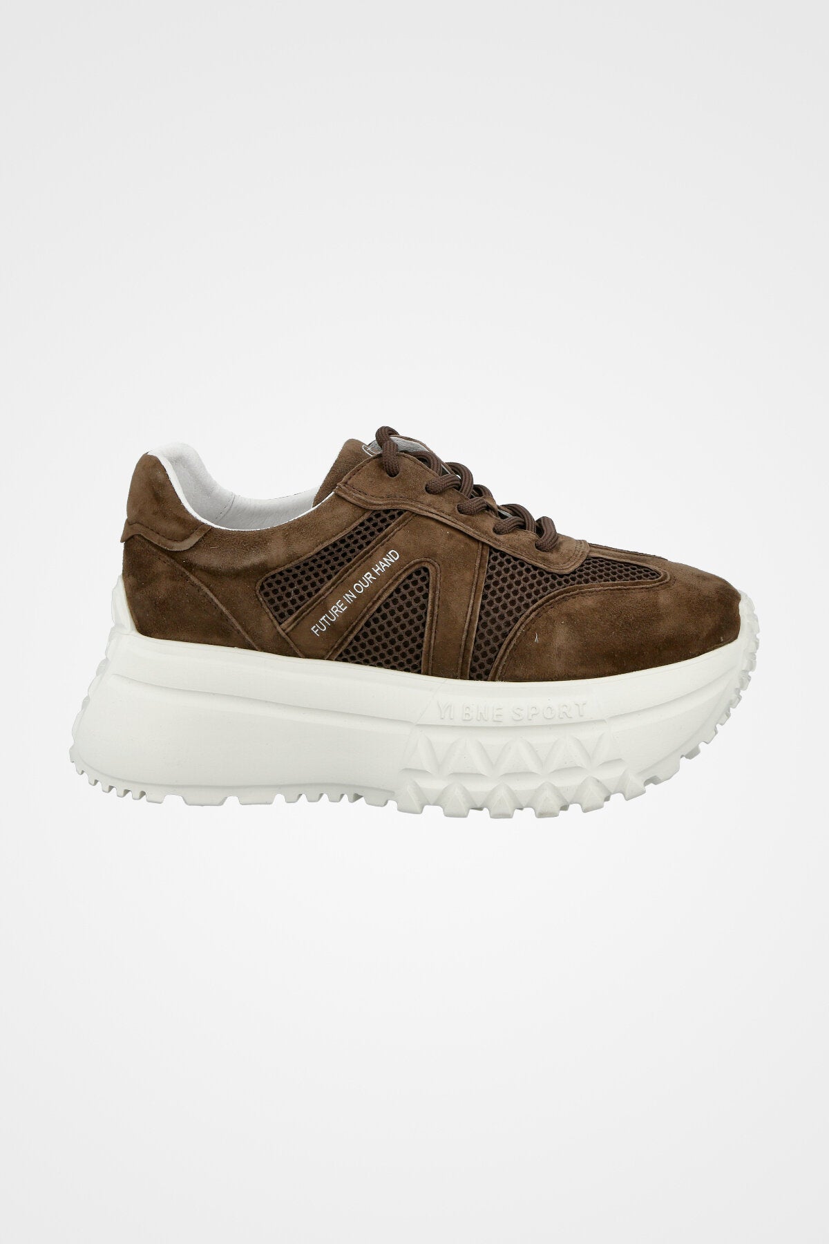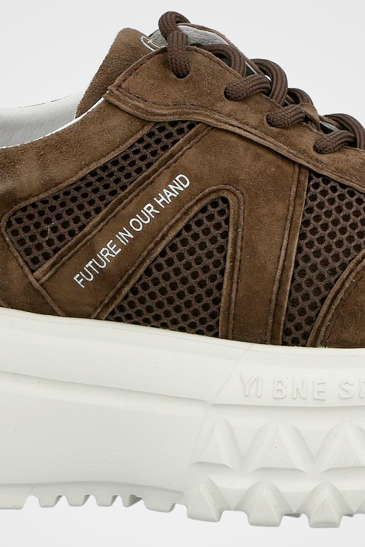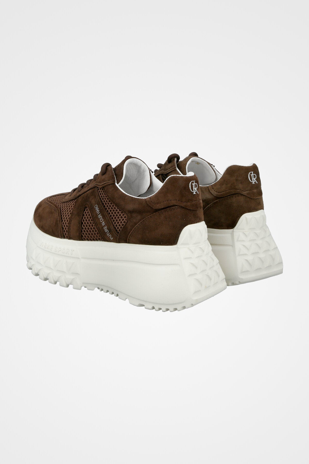 סניקרס זמש בצבע חום כהה עם סוליה עבה, עיטורי צד בצורת פס כפול,חלק עליון משולב רשת וזמש