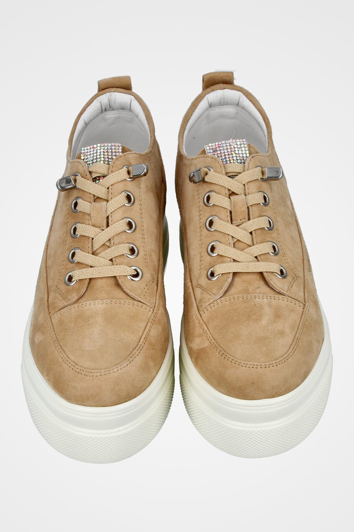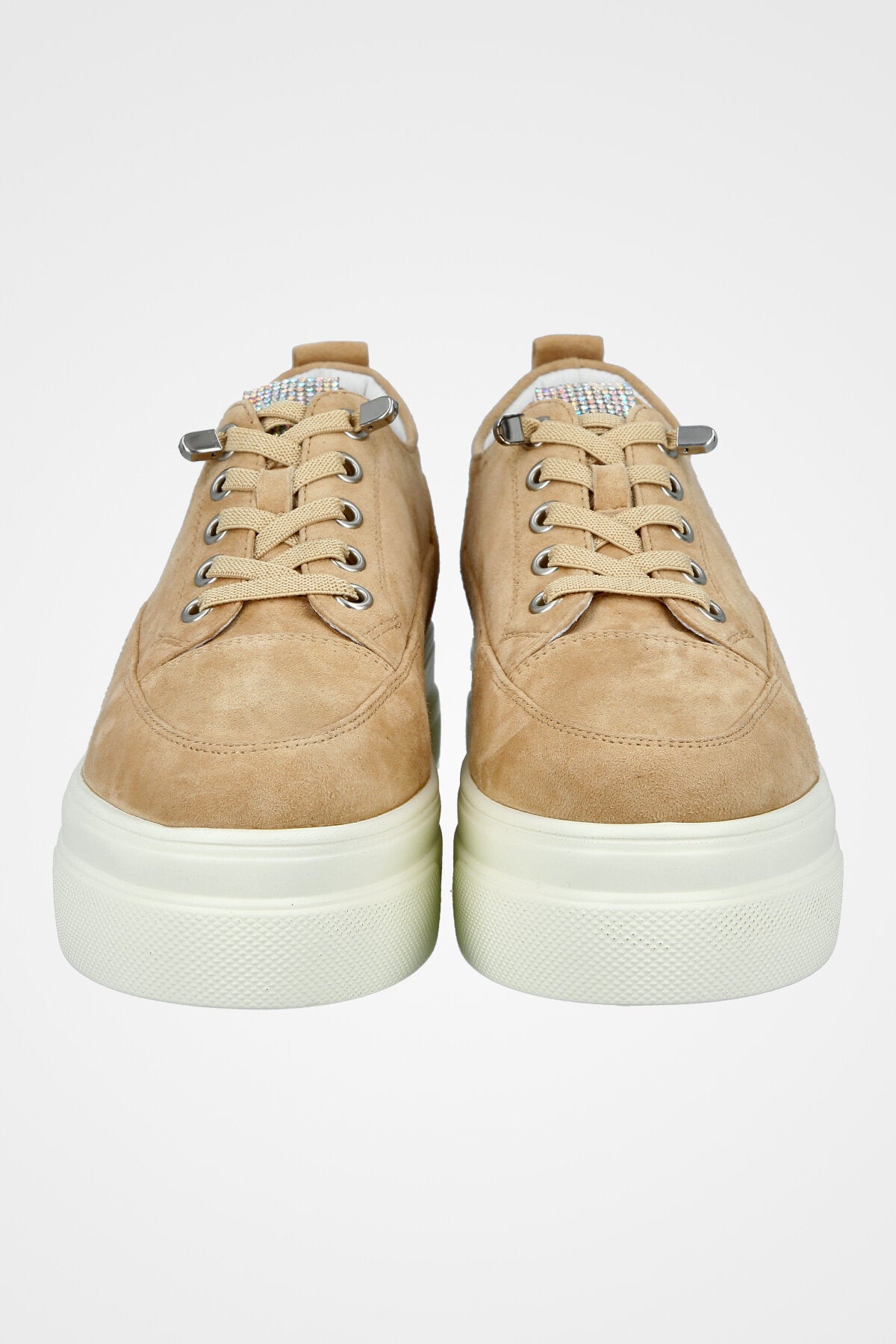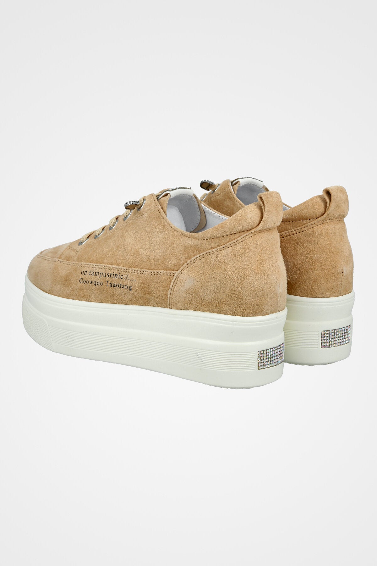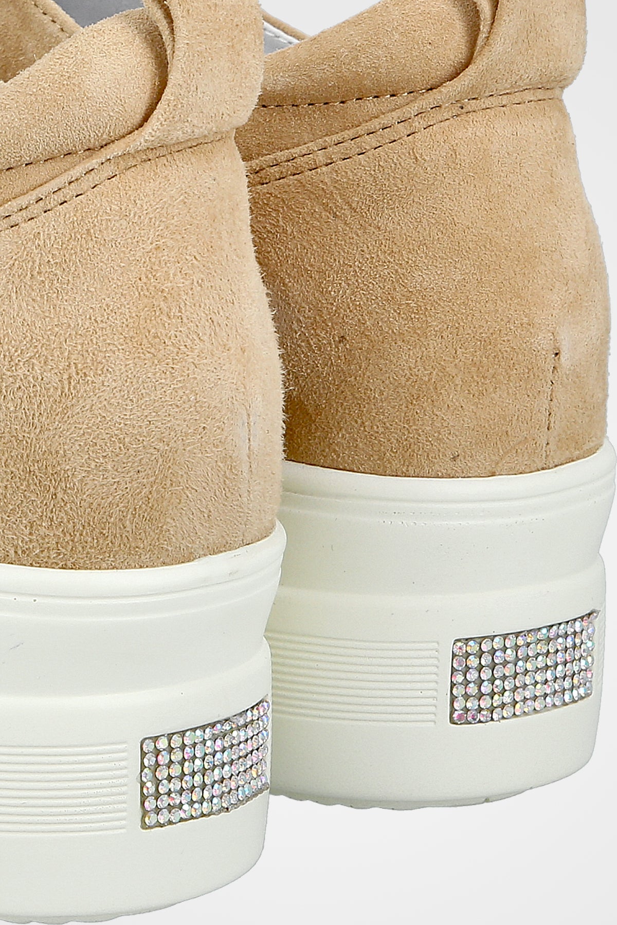 סניקרס זמש בצבע קאמל עם סוליה גבוהה לבנה, עקב פנימי, ולשון משובצת אבנים