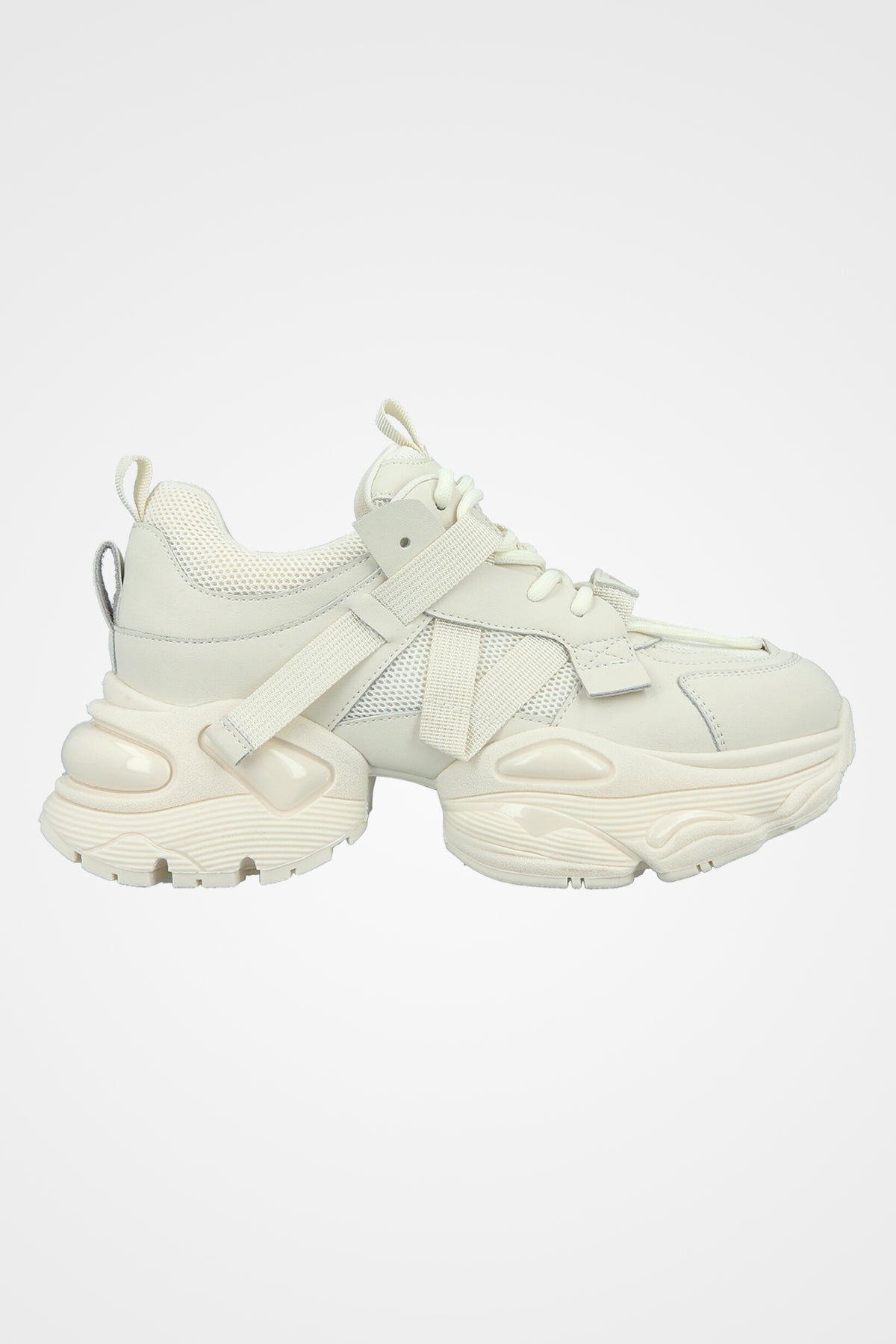 נעל סניקרס בצבע שמנת עם סולייה גבוהה ומחורצת, שילוב של רשת, בד ועור,רצועות חיצוניות ותיפורים מעוצבים