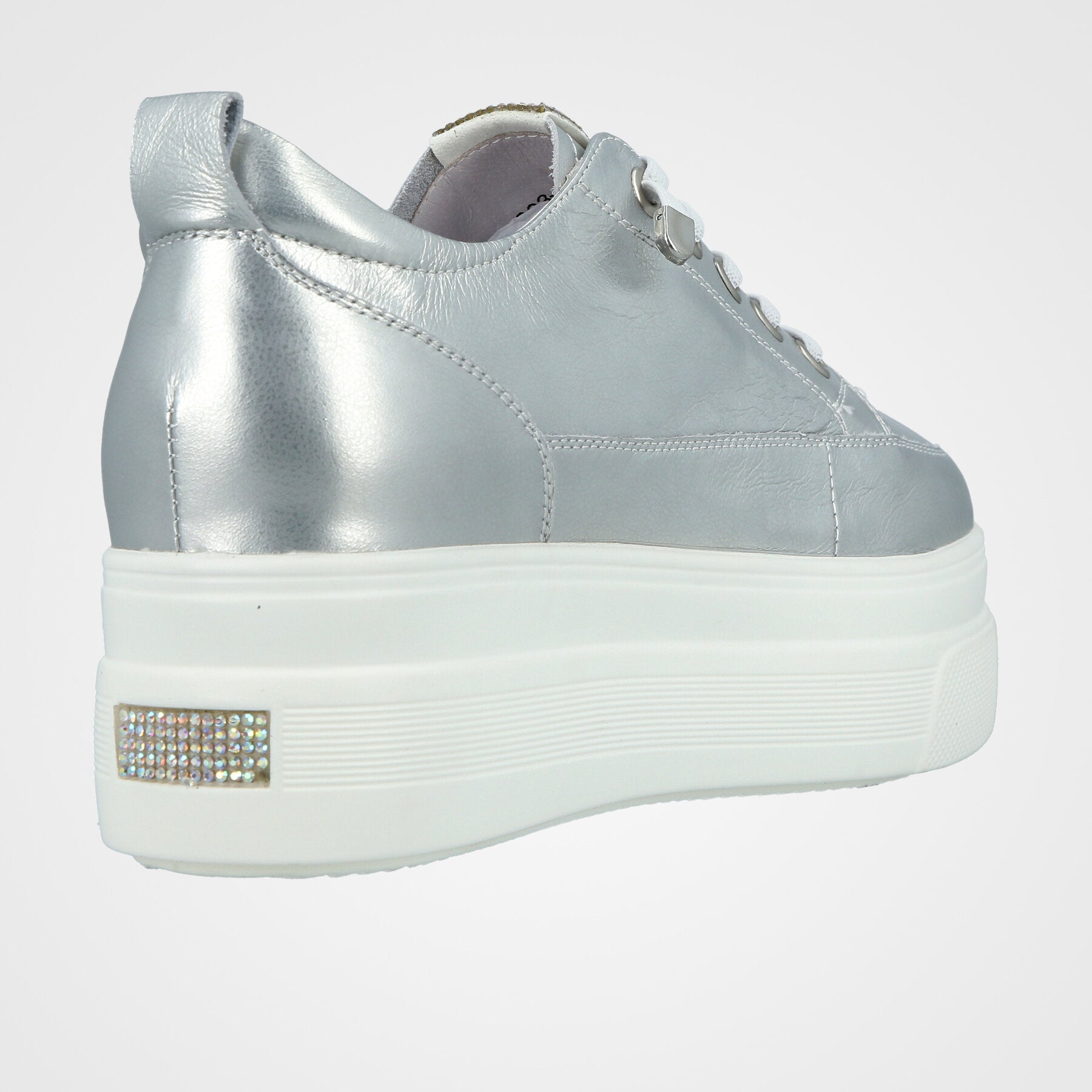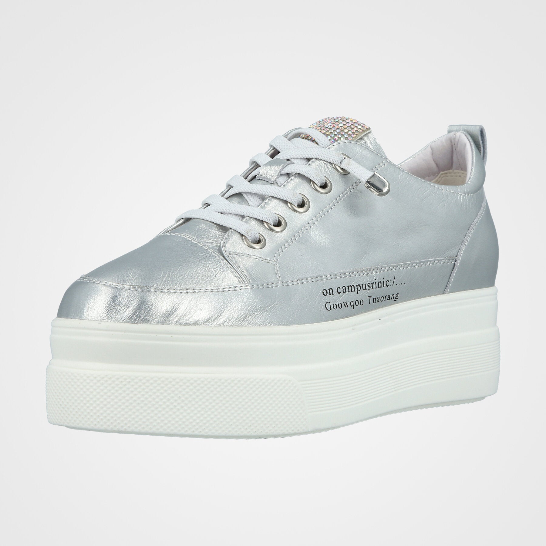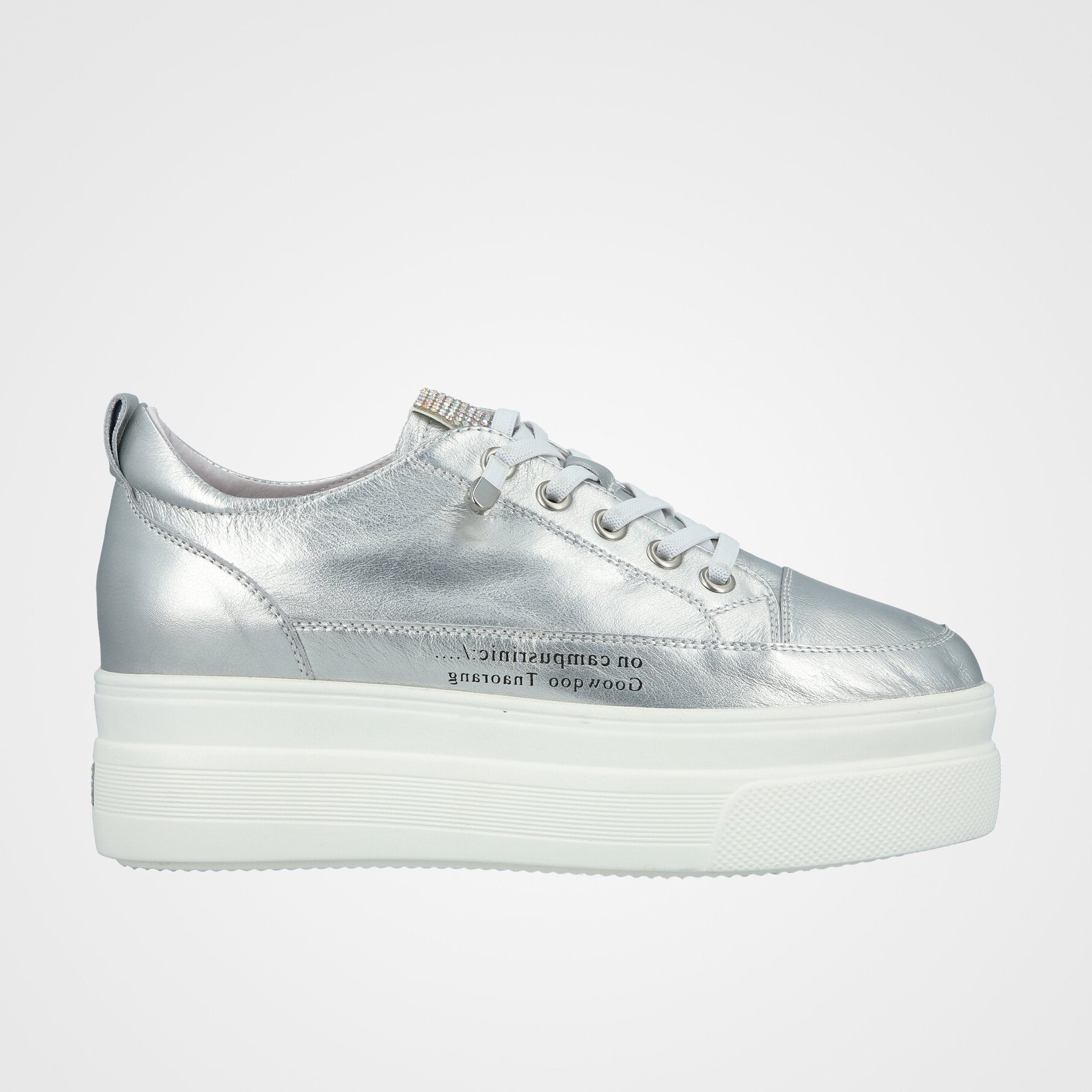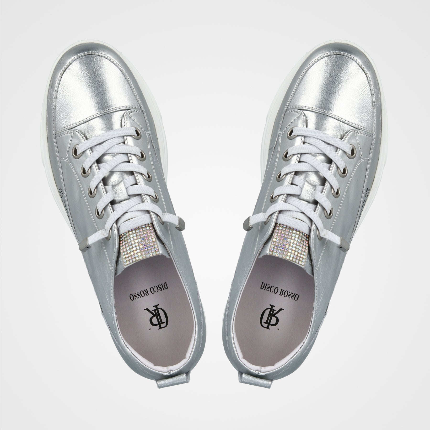 סניקרס עור כסופות עם סוליה גבוהה לבנה, עקב פנימי, ולשון משובצת אבנים