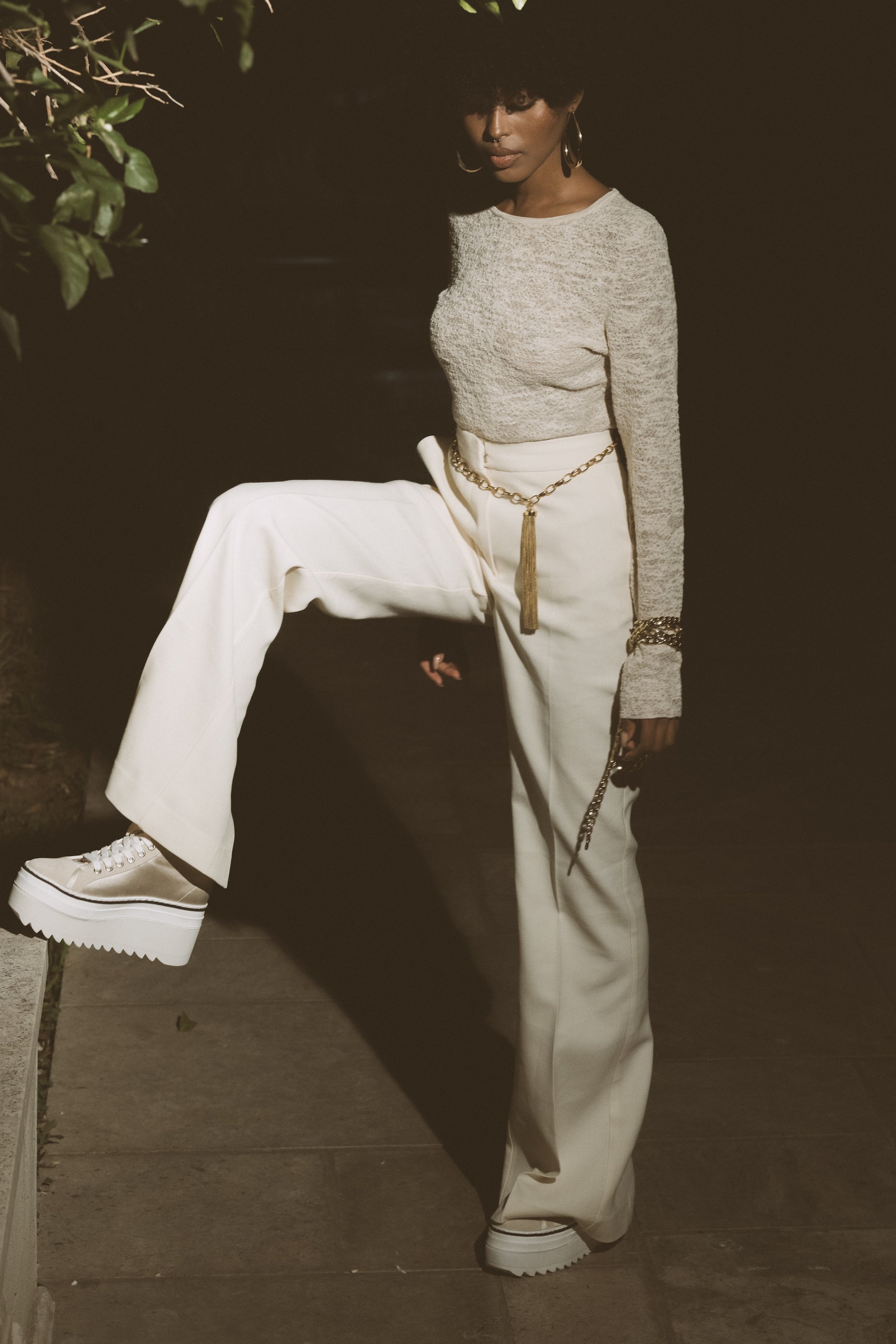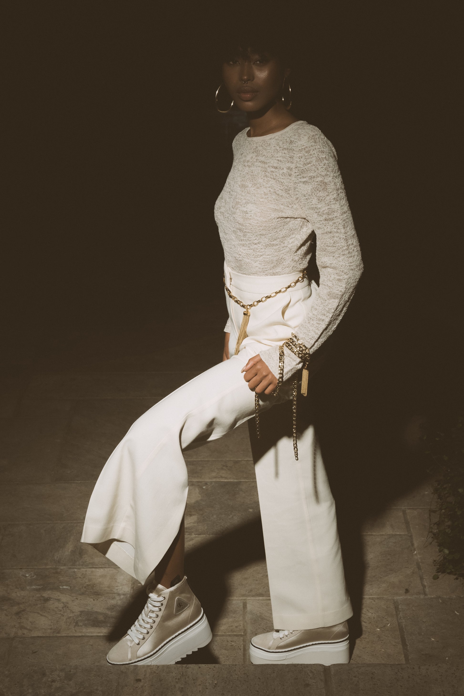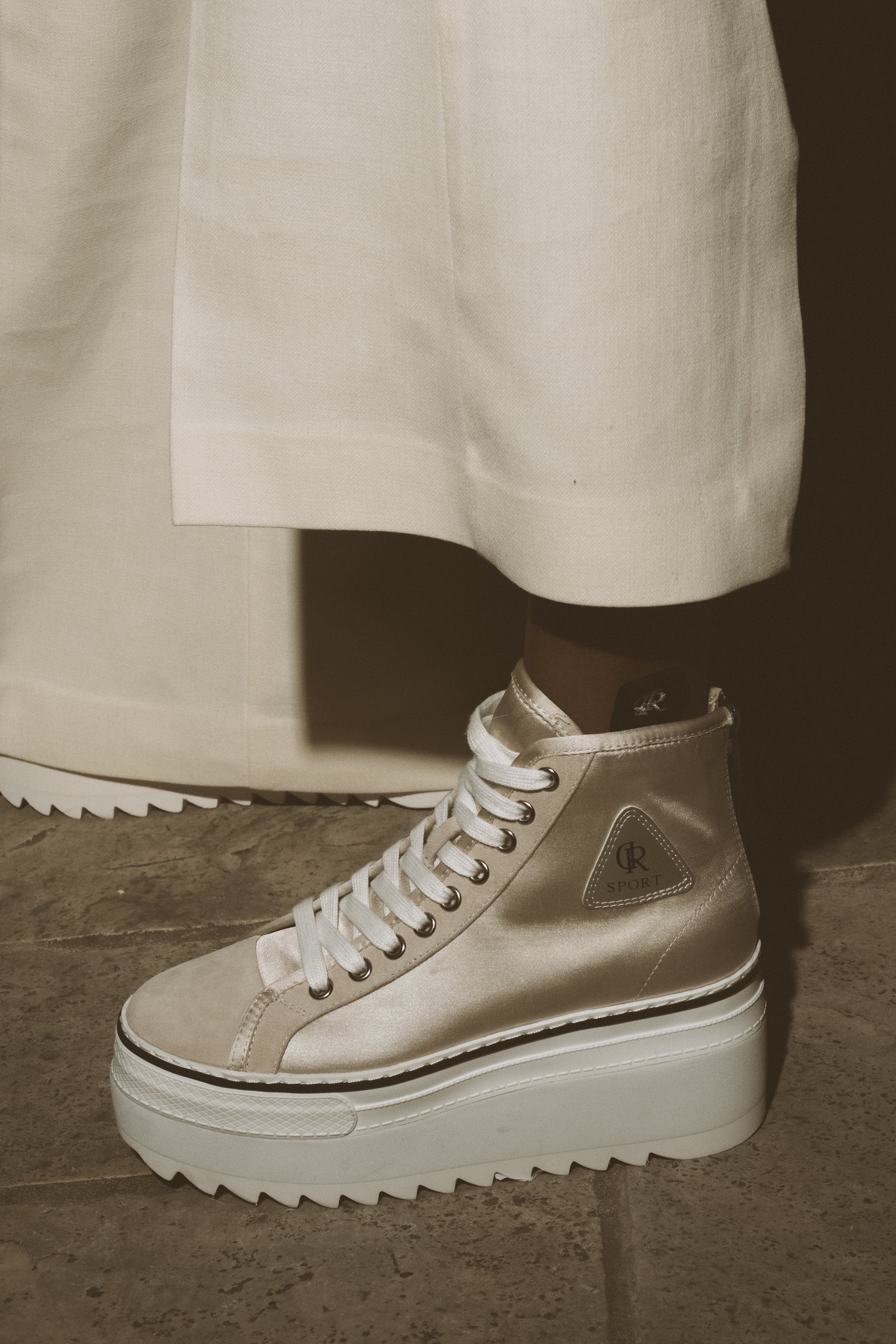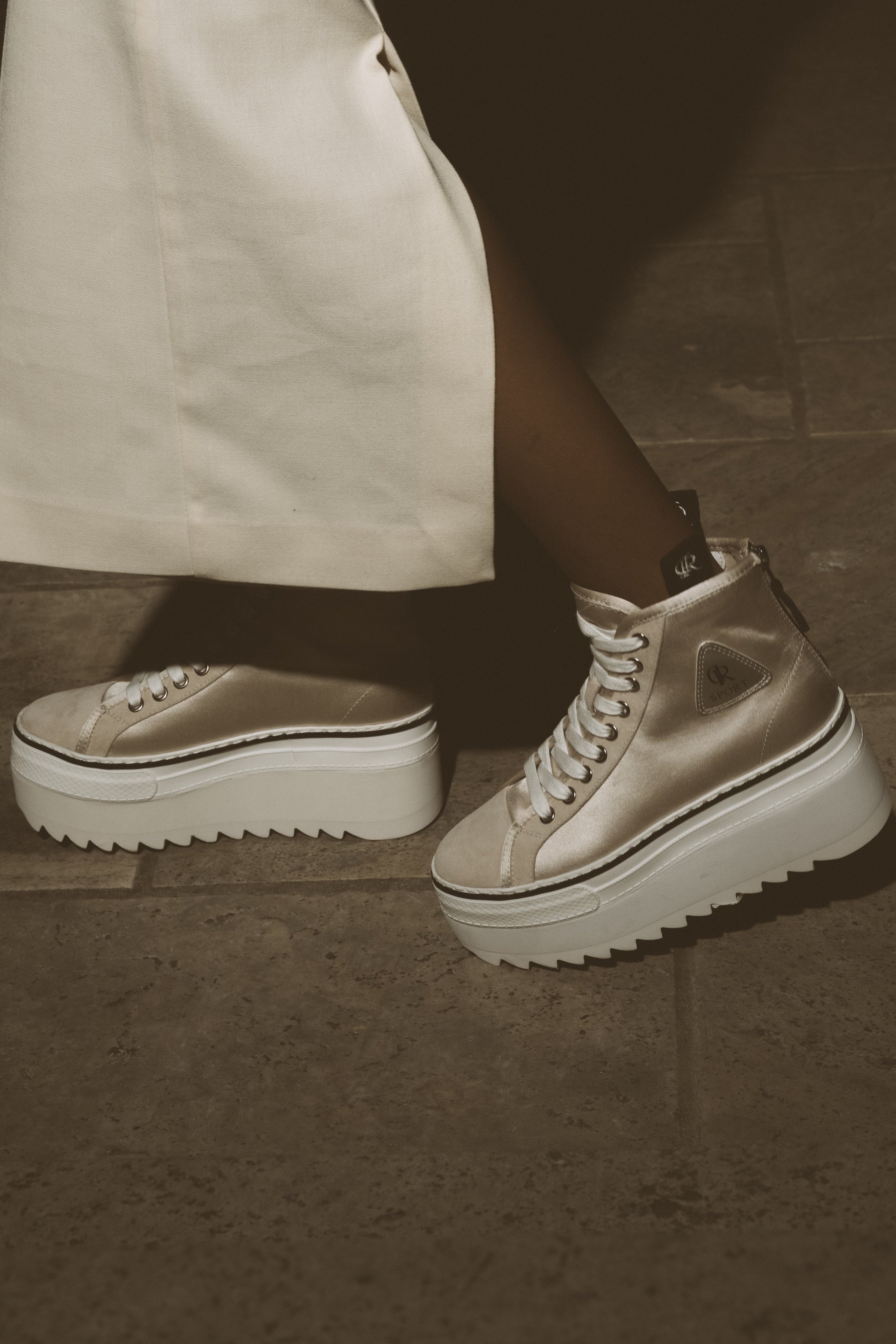 סניקרס גבוהות בצבע שמפנייה בשילוב זמש, עם סולייה עבה ומדורגת ורוכסן אחורי