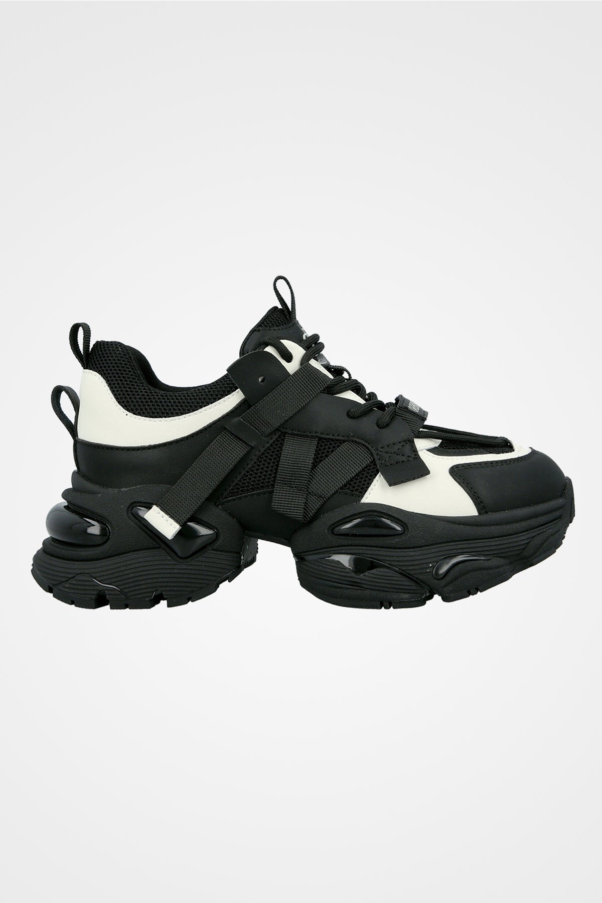 נעל סניקרס בשילוב צבעים של שחור ולבן עם סולייה גבוהה ומחורצת, שילוב של רשת, בד ועור,רצועות חיצוניות ותיפורים מעוצבים