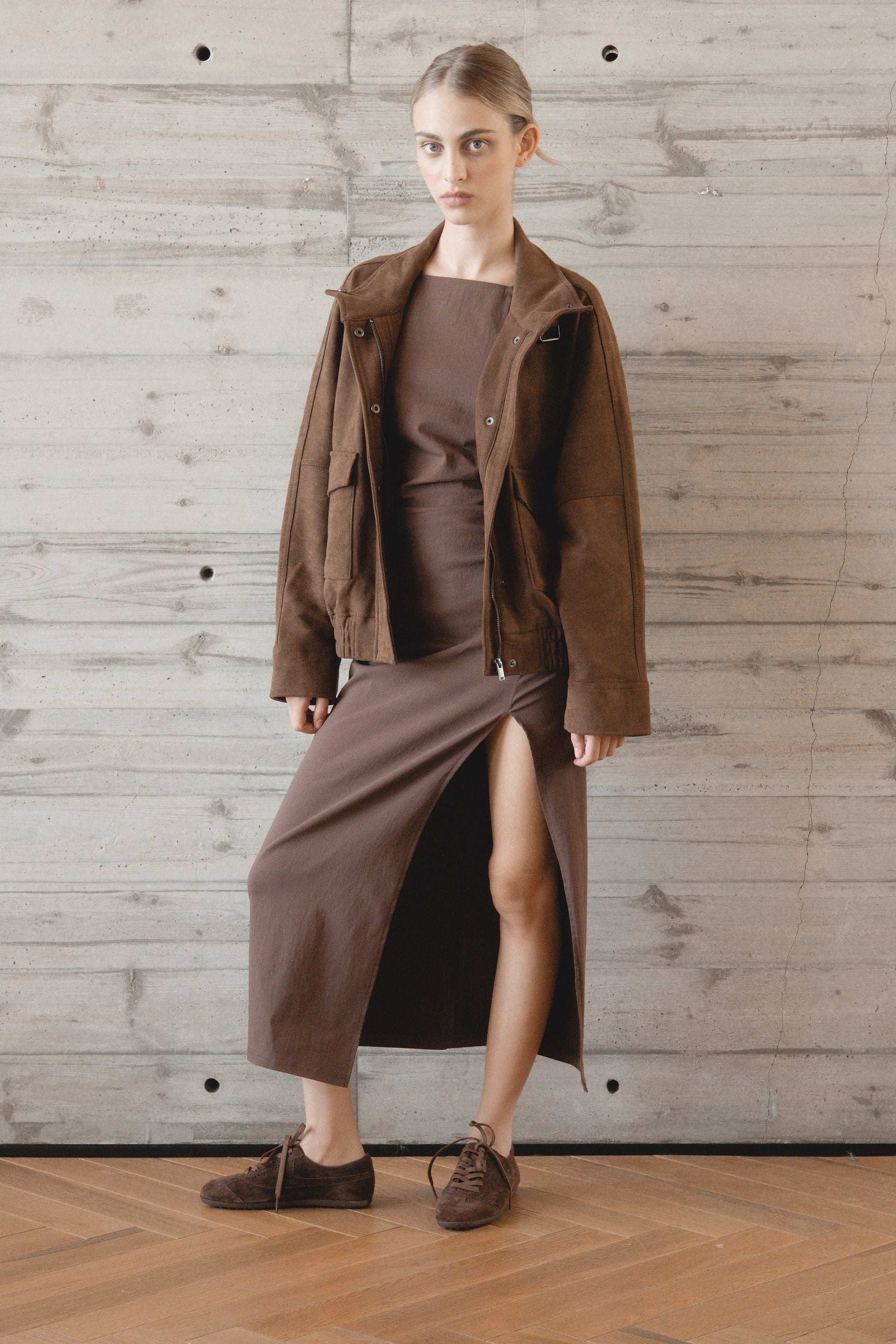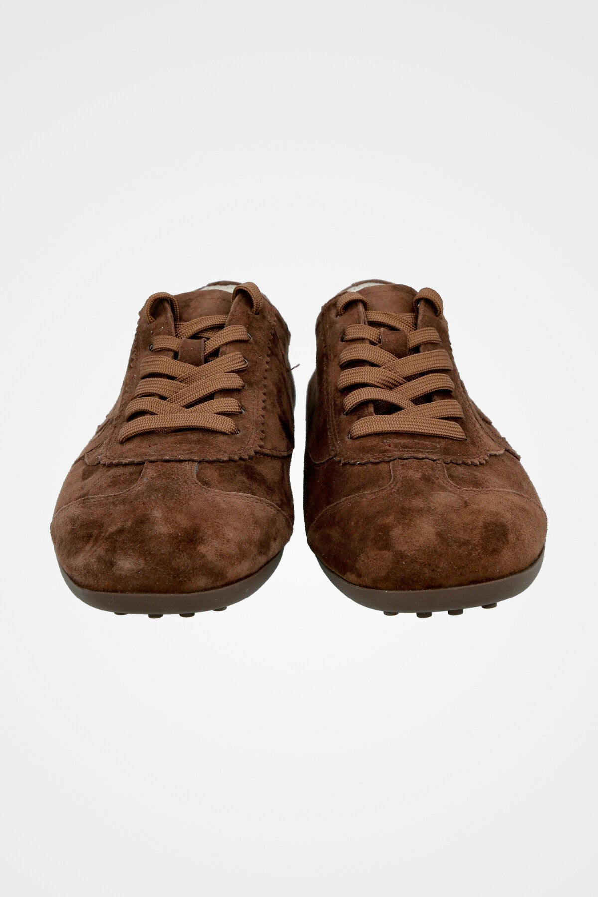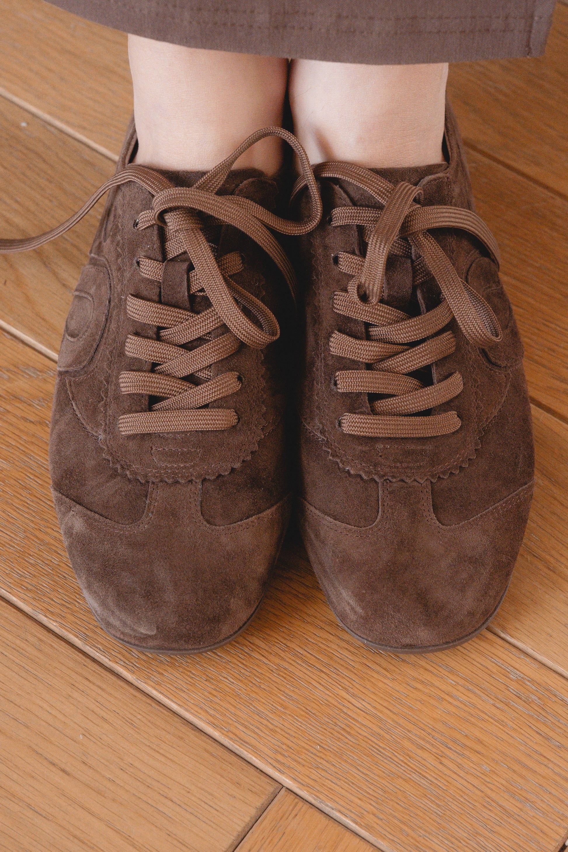נעל סניקרס נמוכה בצבע חום כהה זמש בעלות עיטורים בצד הנעל וסולייה דקה בצבע תואם