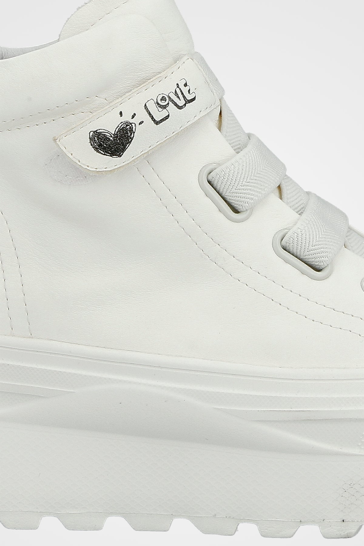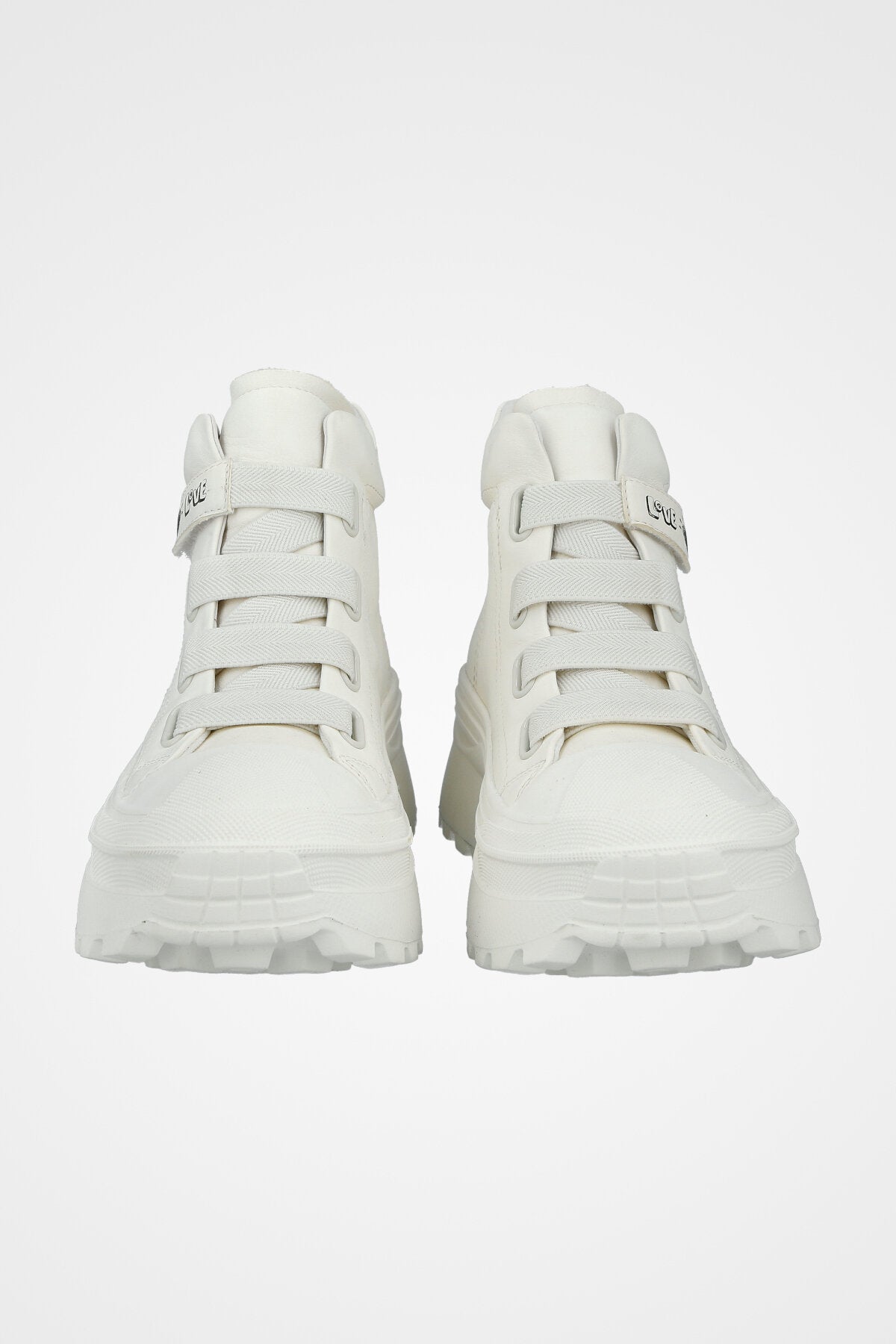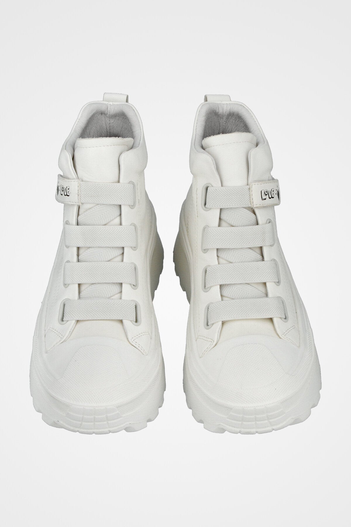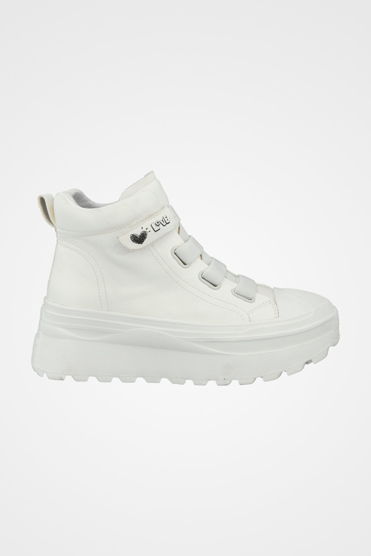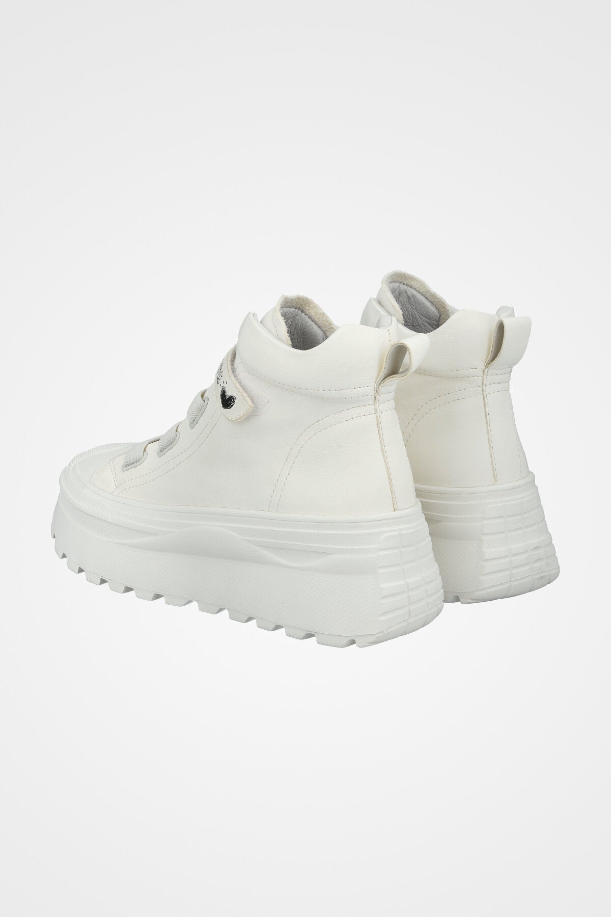 סניקרס גבוהות בצבע לבן, בעלות סולייה משומנת ושרוכי גומי בשילוב סגירת סקוץ׳ עם כיתוב