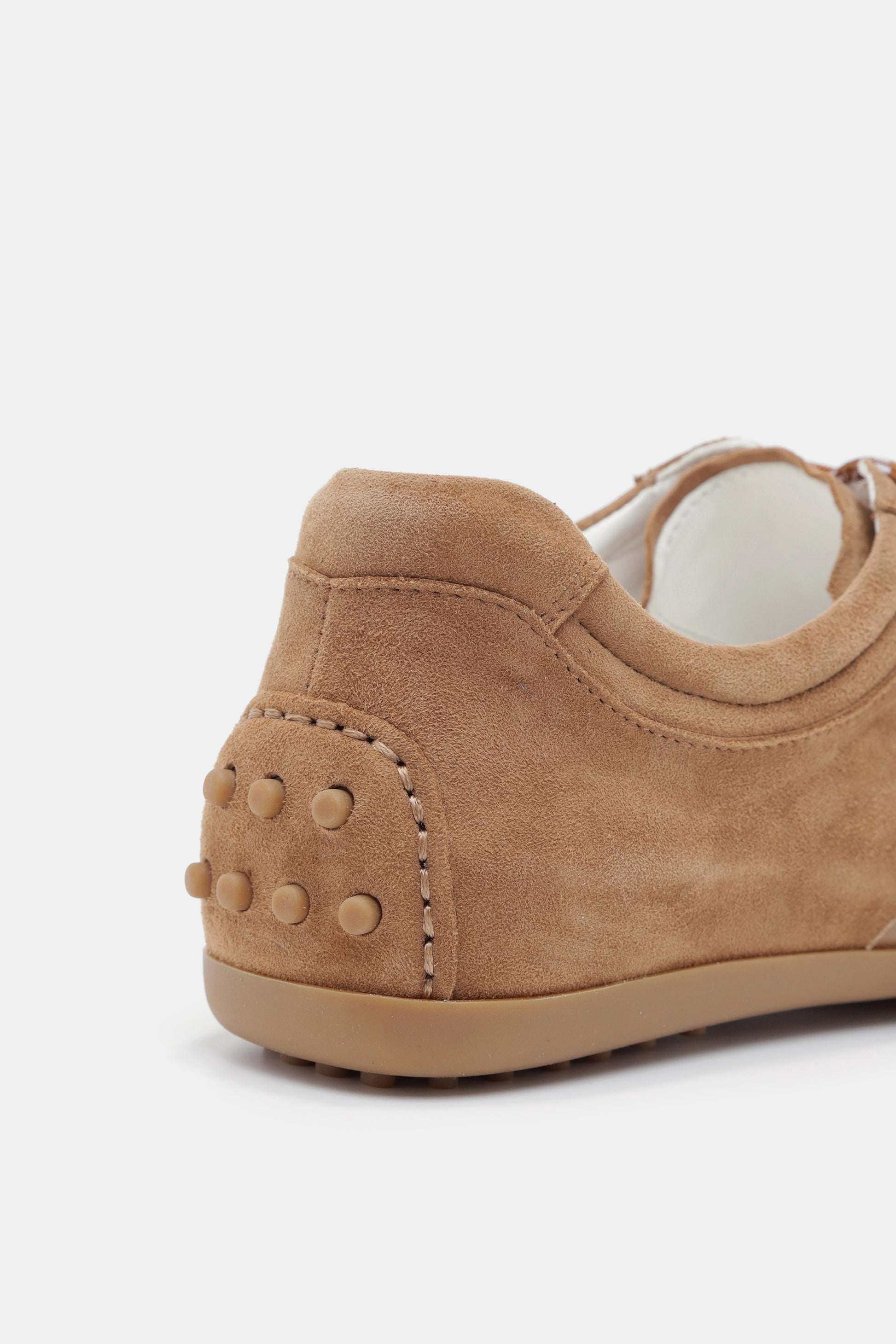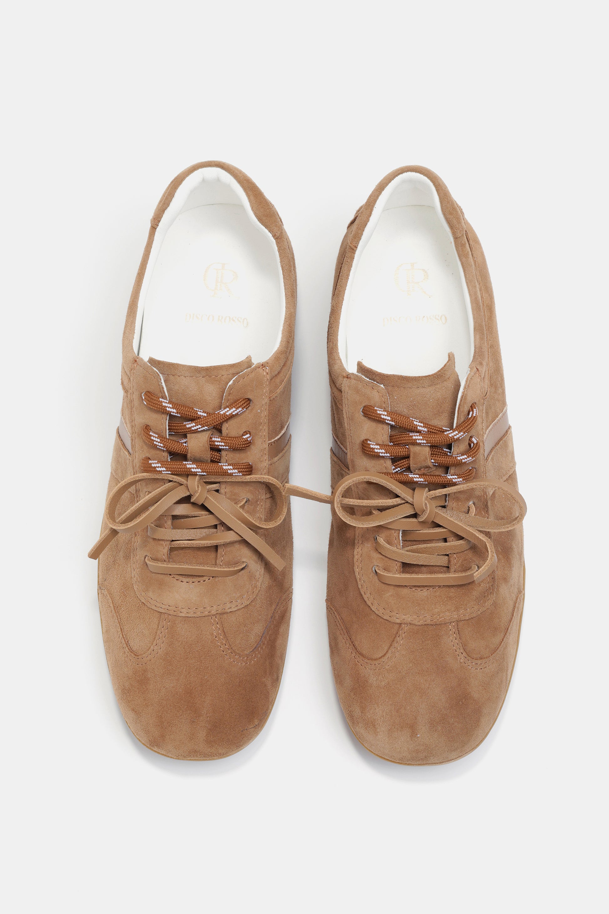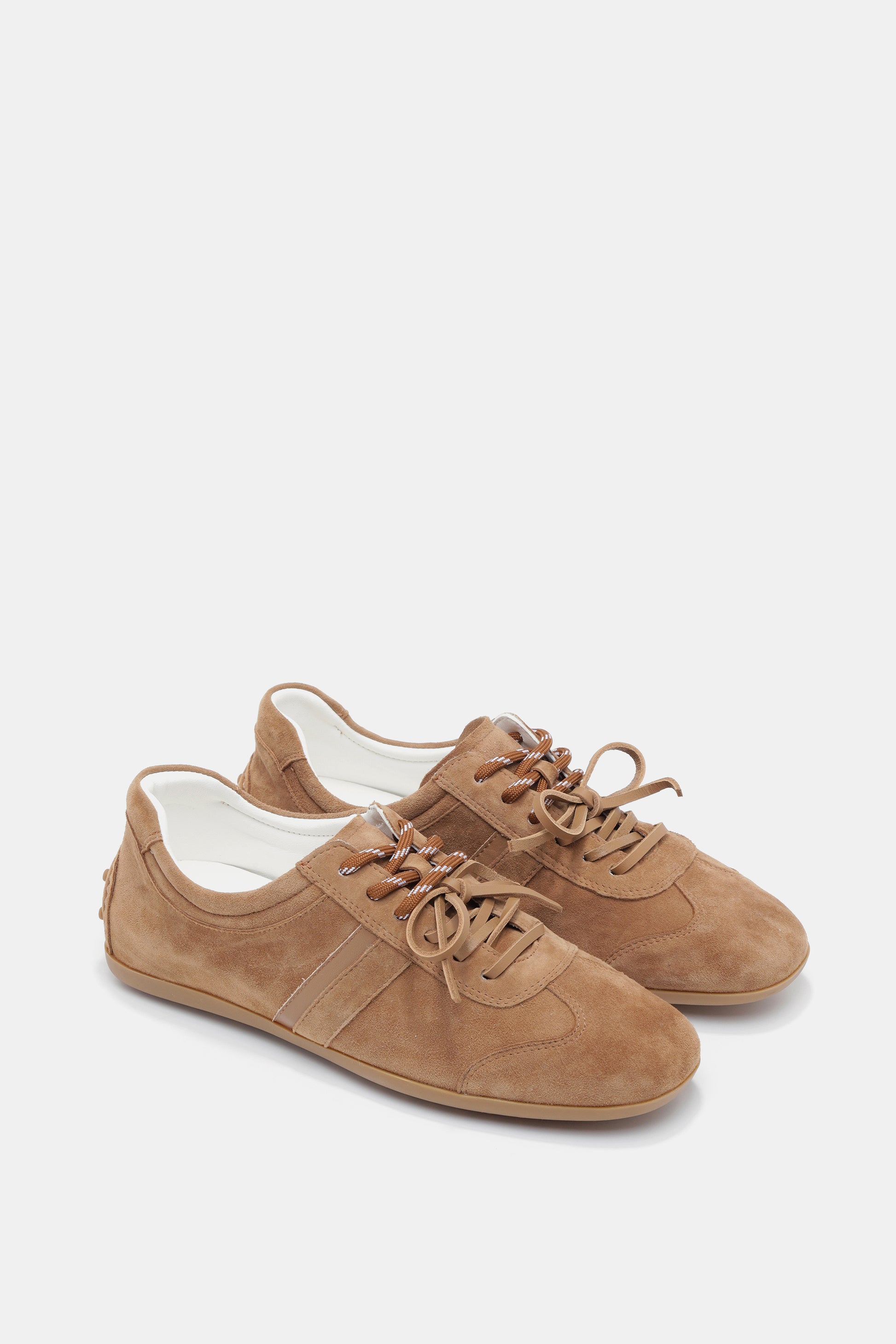 סניקרס בצבע חום זמש, קצה מעוגל, תפירה נקייה, שילוב שרוכים בצבע חום, סוליה שטוחה למראה קז'ואל ומלא סטייל