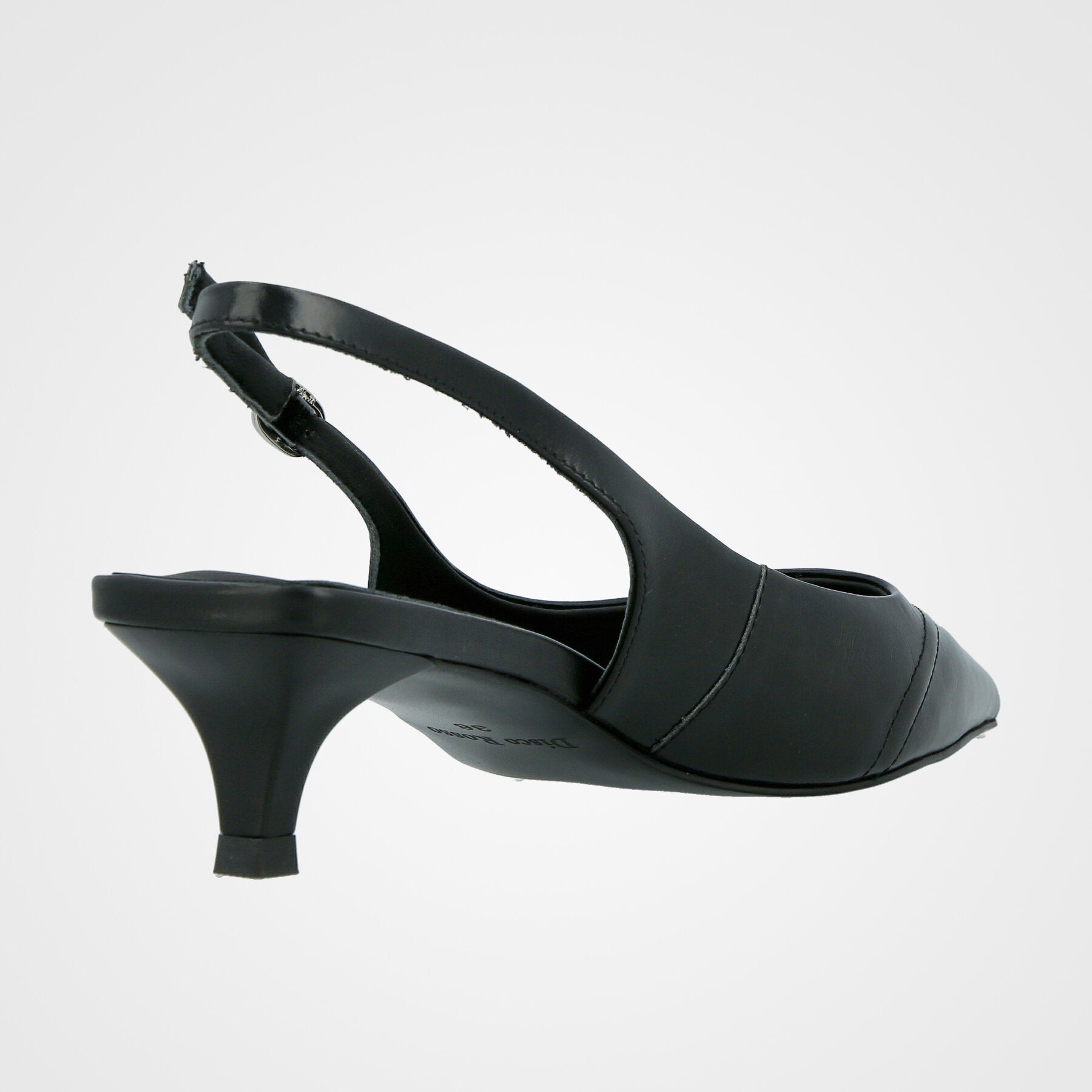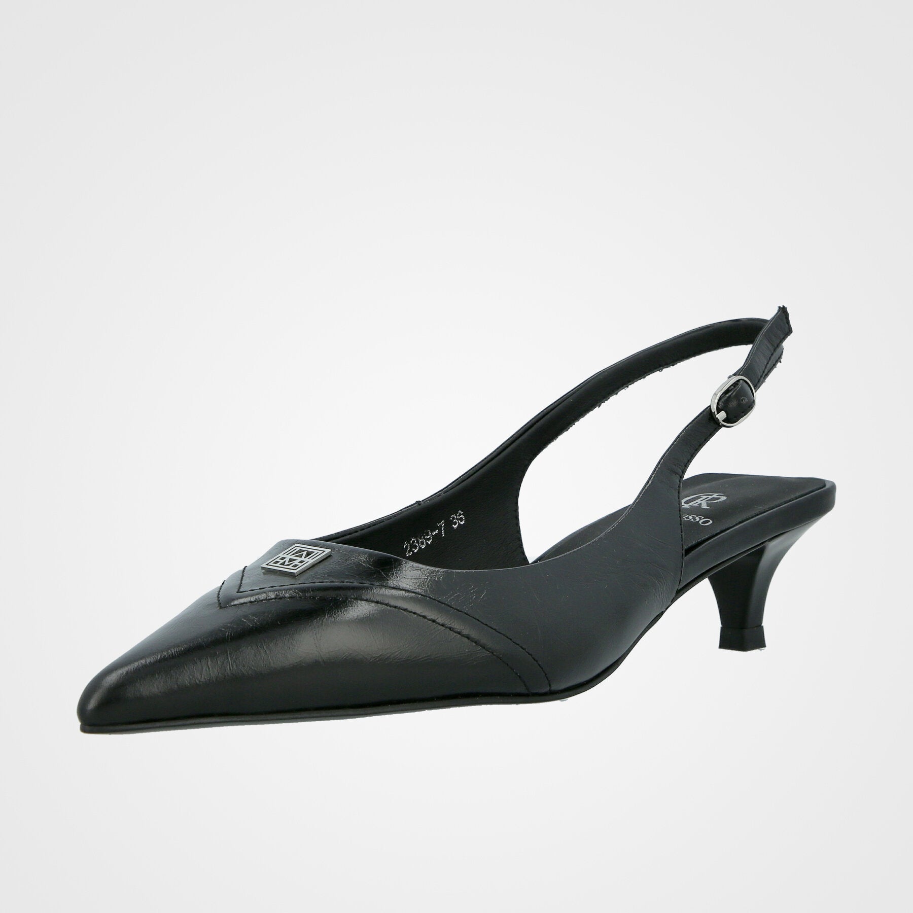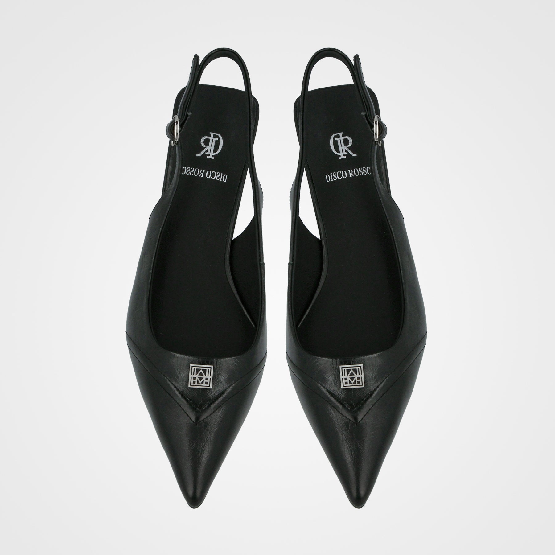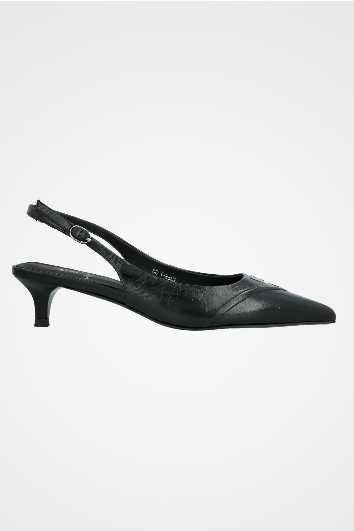 נעלי שפיץ שחורות מחודדות, עם סמל מתכתי קטן בחזית, רצועת עקב דקה וסגירת אבזם צדדית.