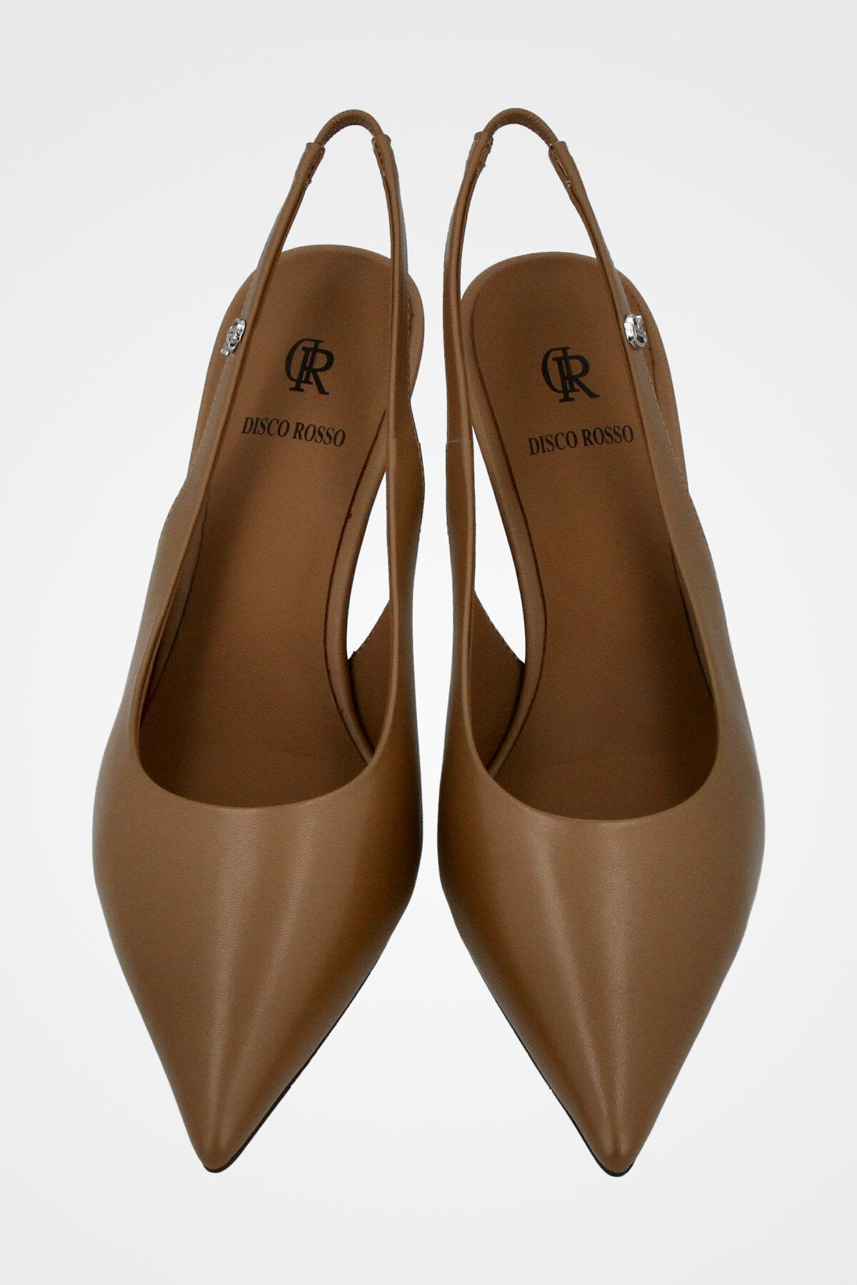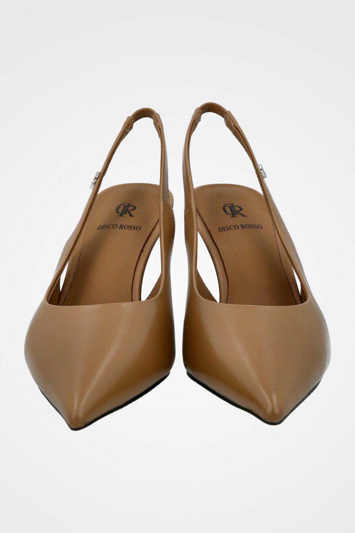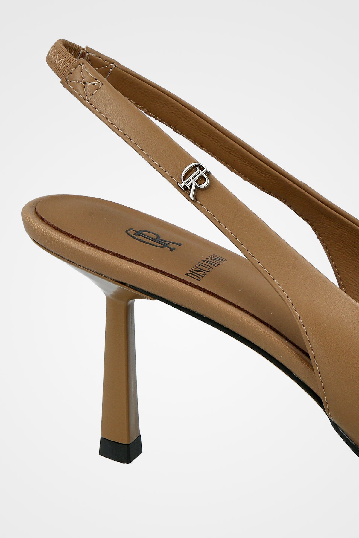 נעל עקב שפיץ בצבע קמל לק, עם רצועה דקה ועקב בנוני דק למראה אלגנטי.