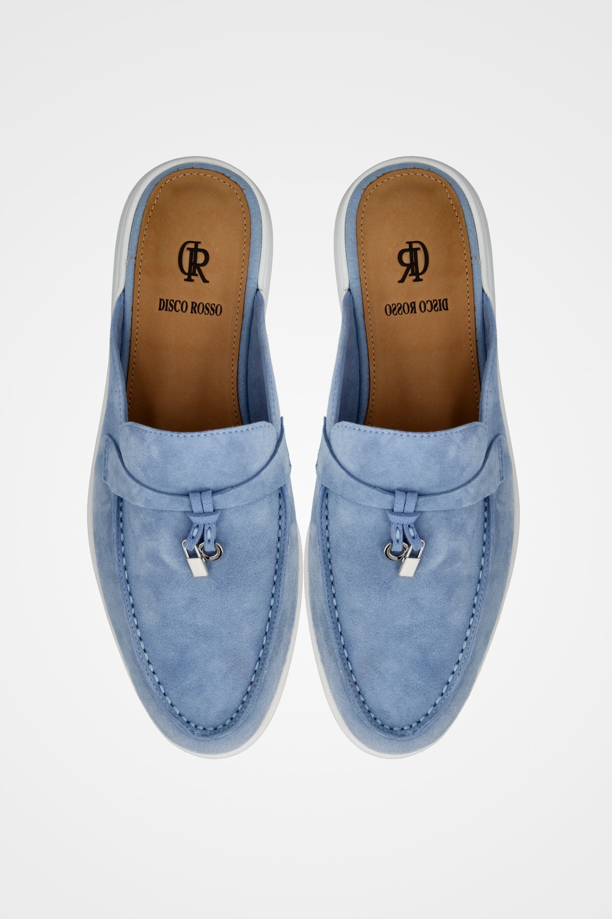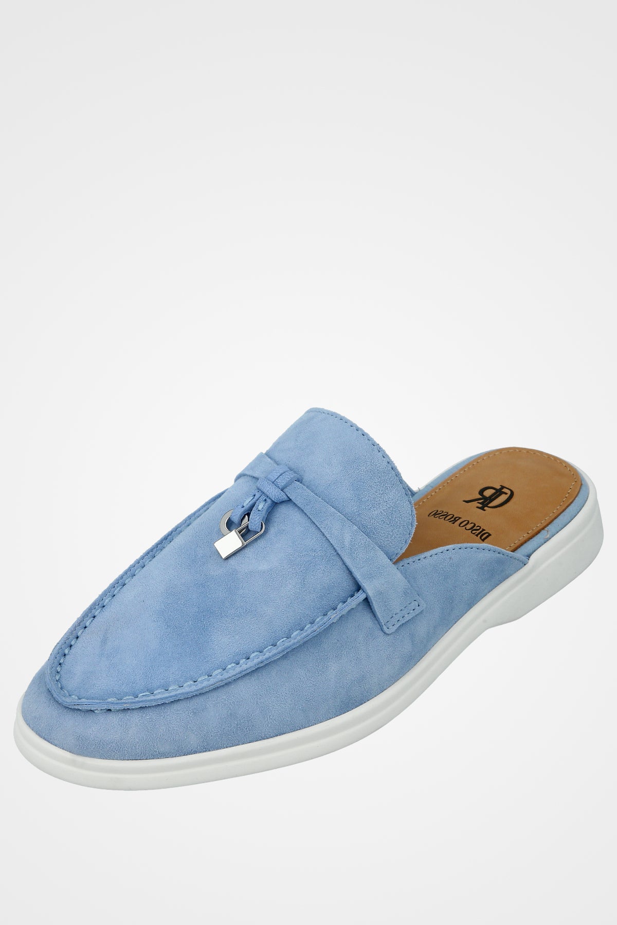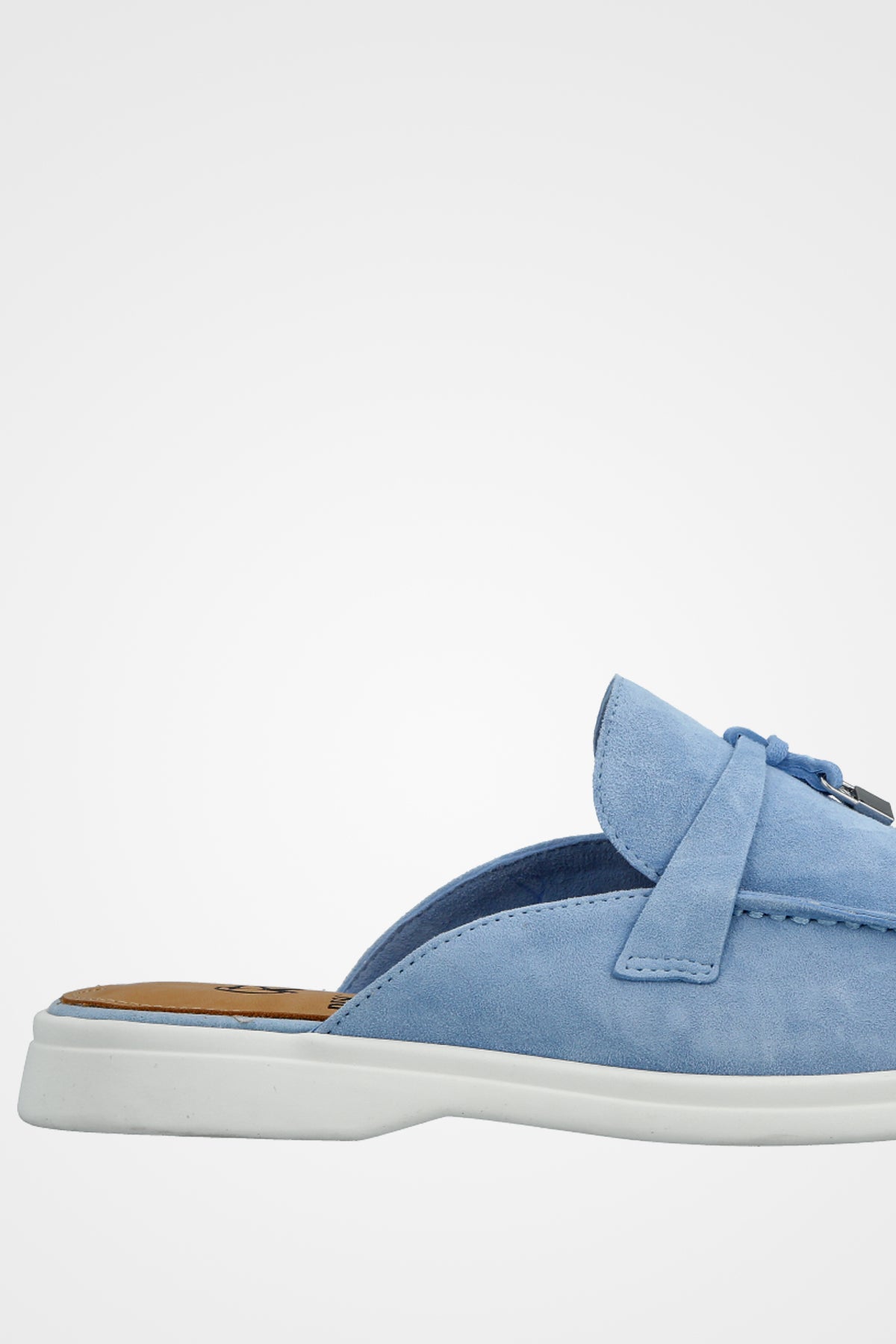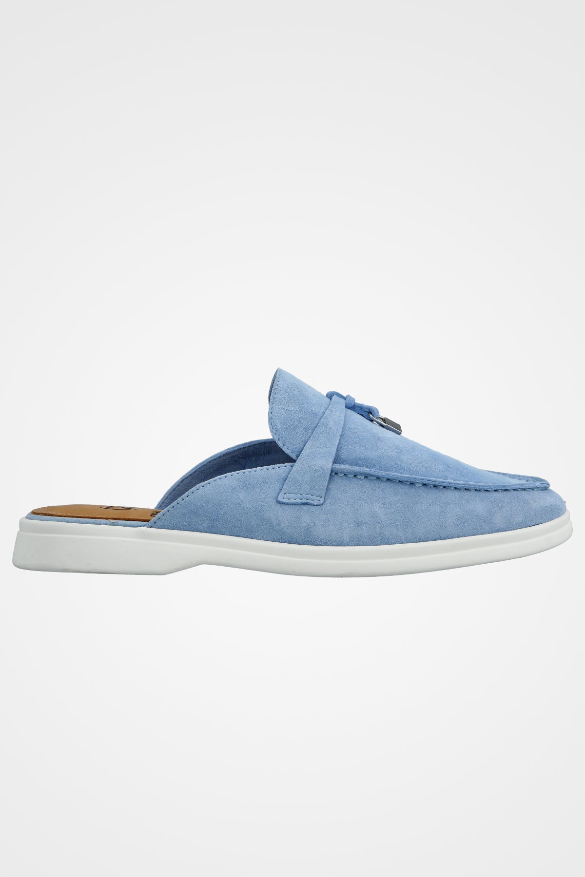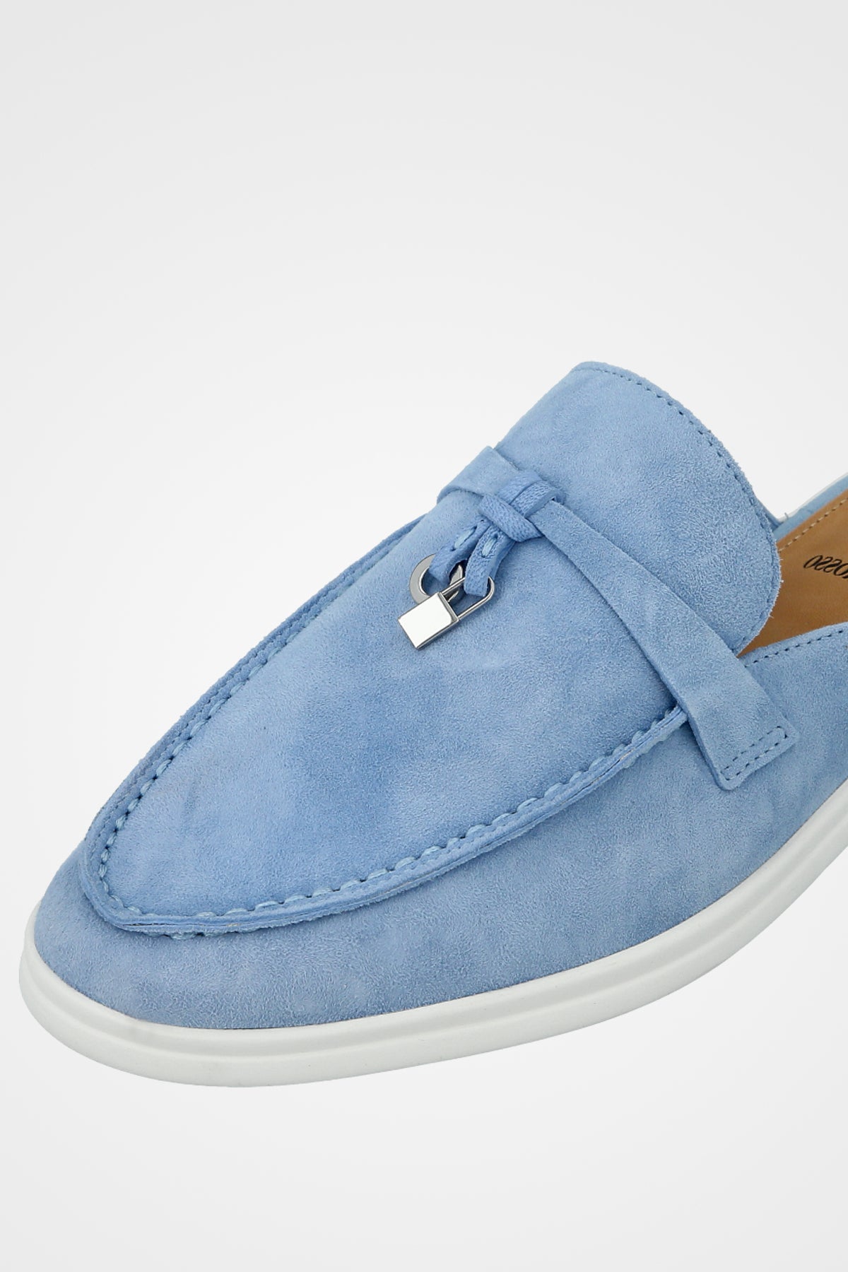 מוקסין כפכף בצבע כחול זמש, עם תפירה בולטת וקישוט מתכתי אלגנטי על העליונה