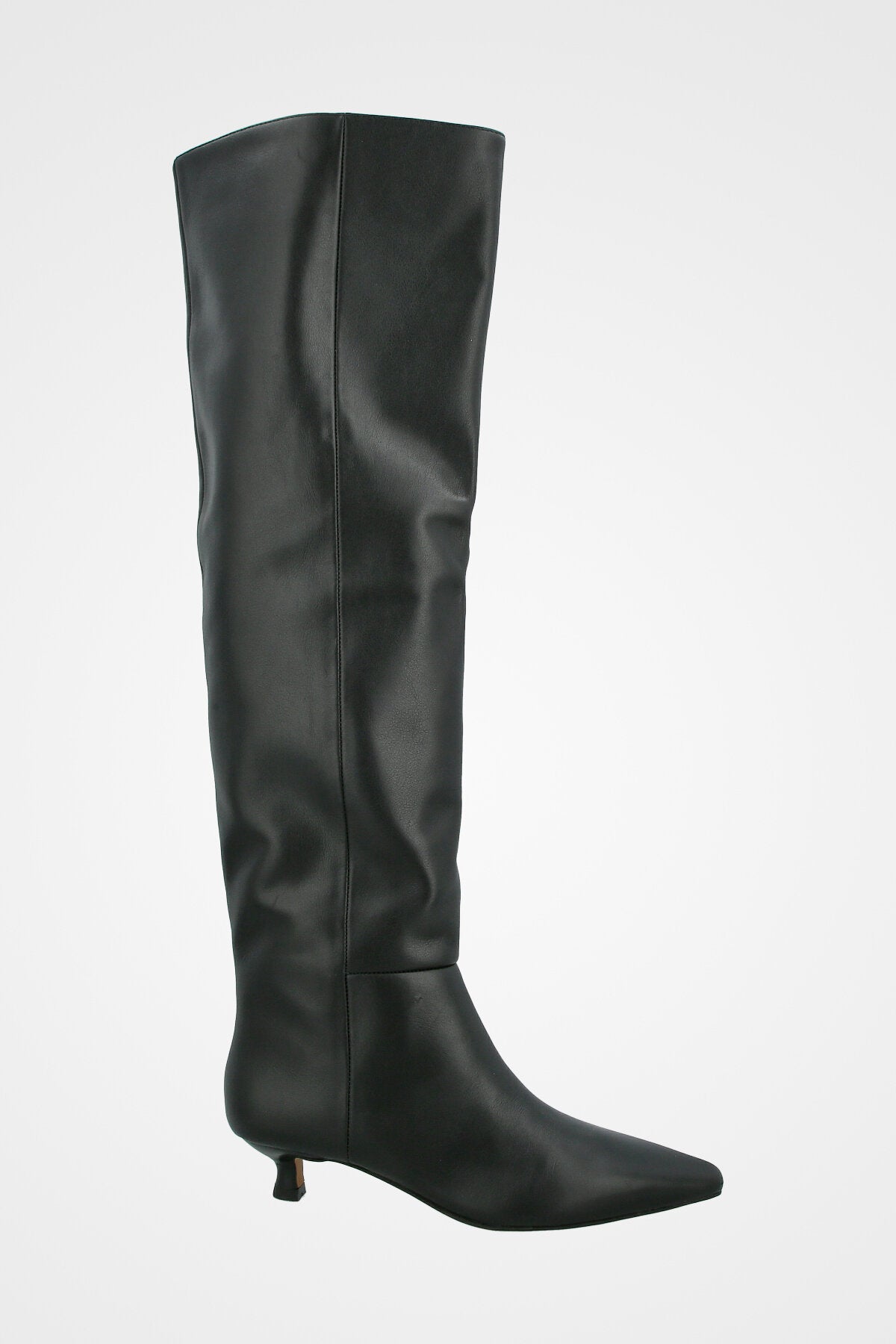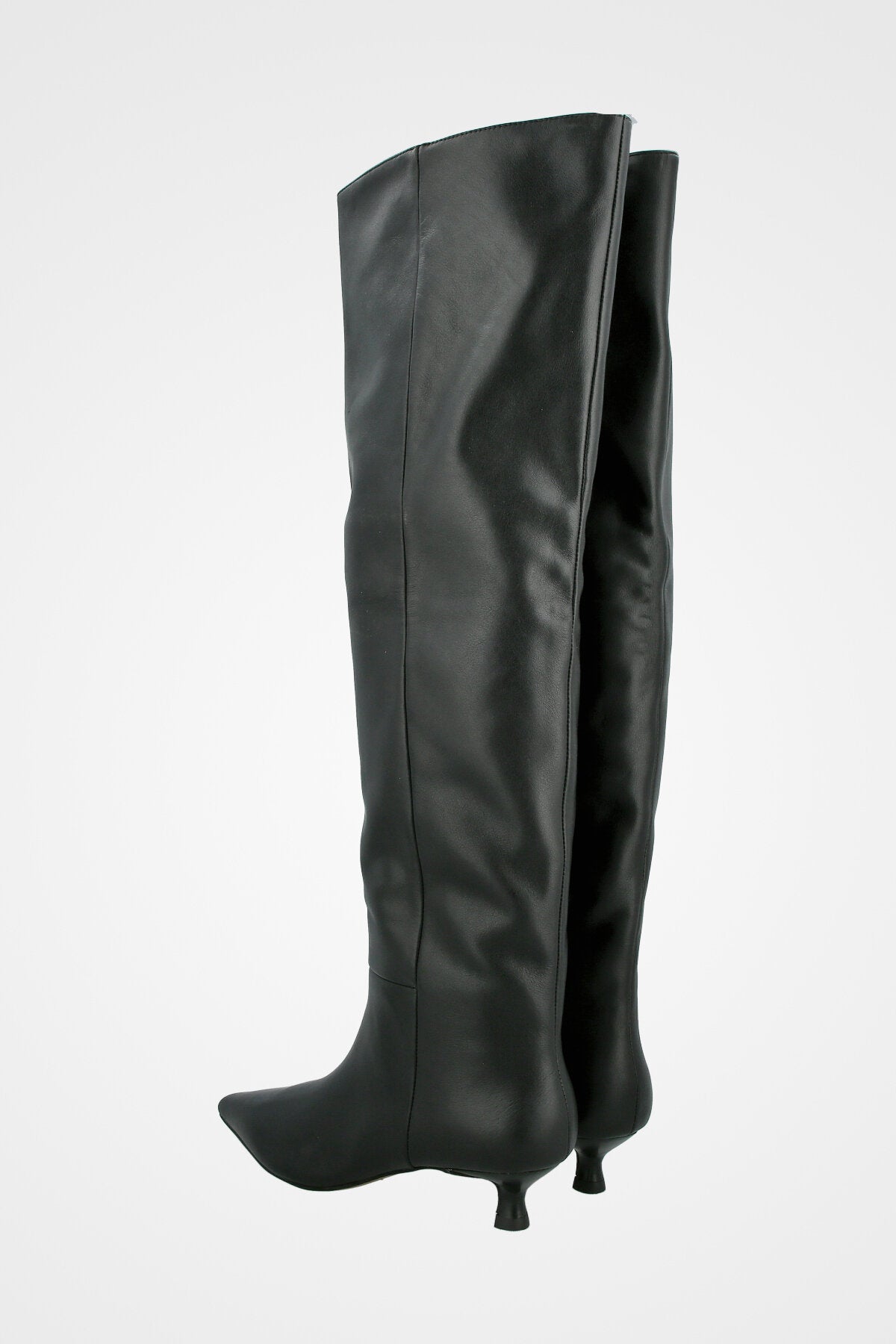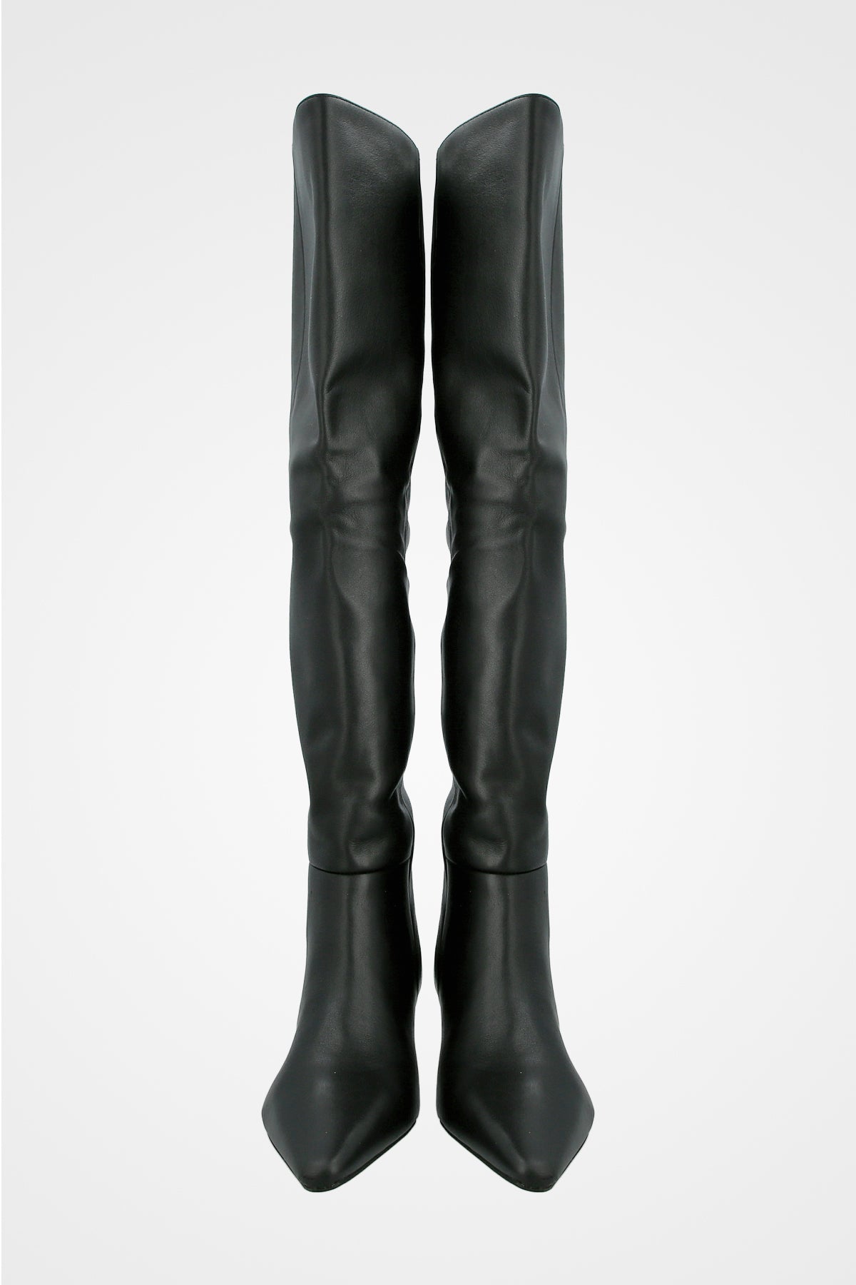 מגף שחור גבוה מעל הברך, בעל חרטום שפיץ ועקב דק נמוך בעיצוב אלגנטי