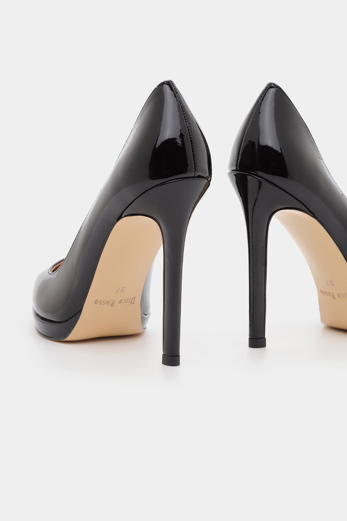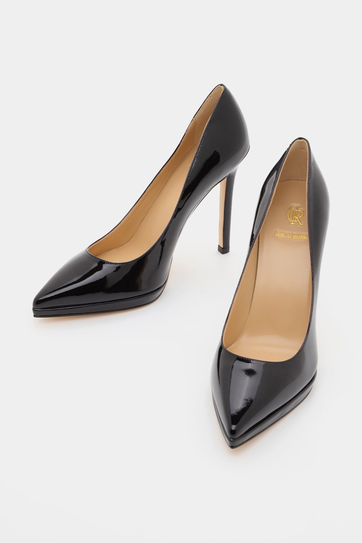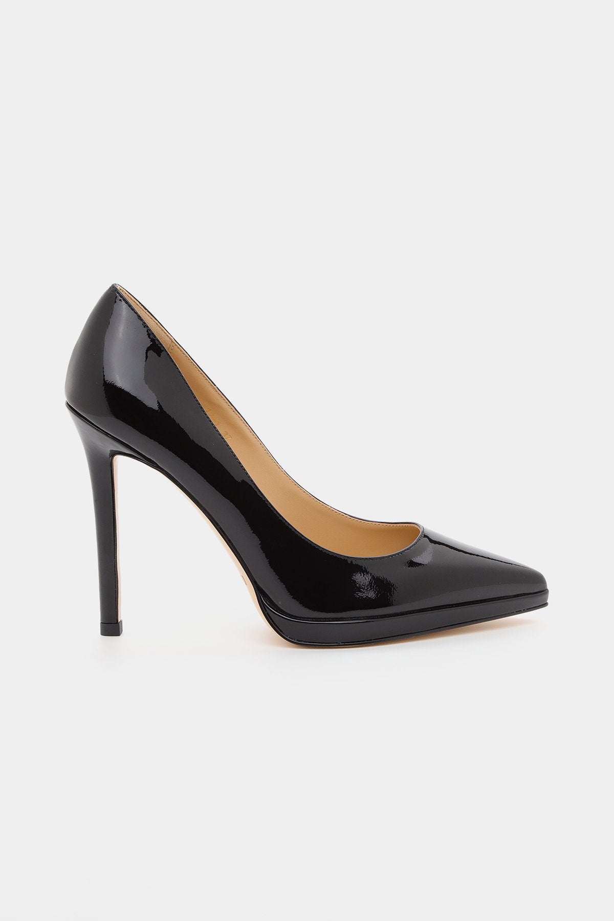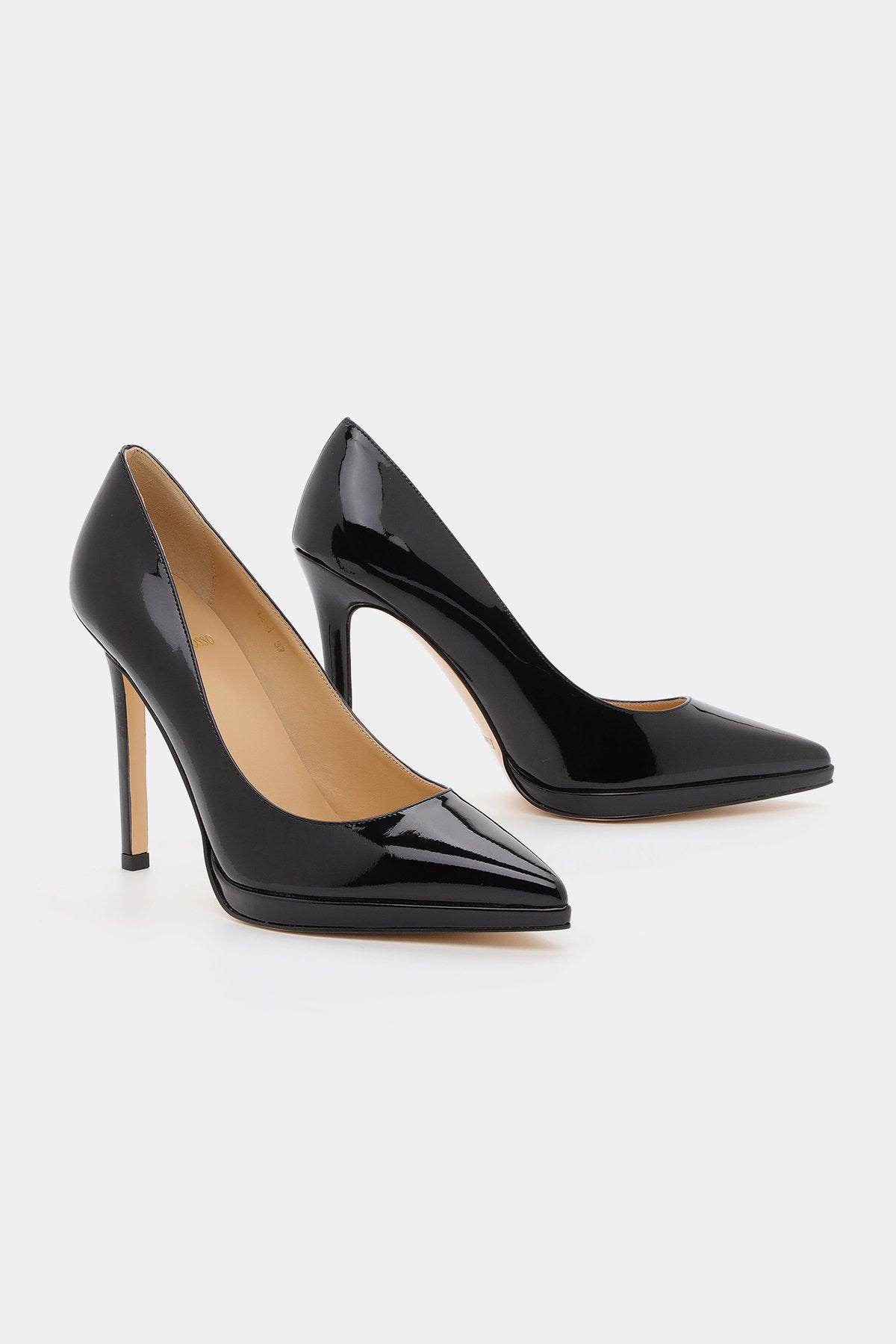 נעל שפיץ בצבע שחור מבריק, סגורה מאחורה ועקב גבוה למראה אלגנטי.