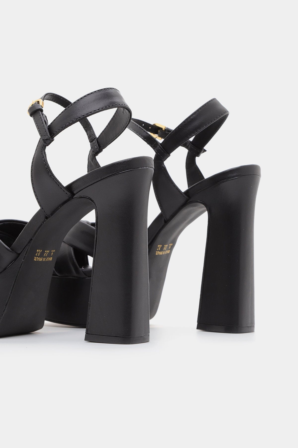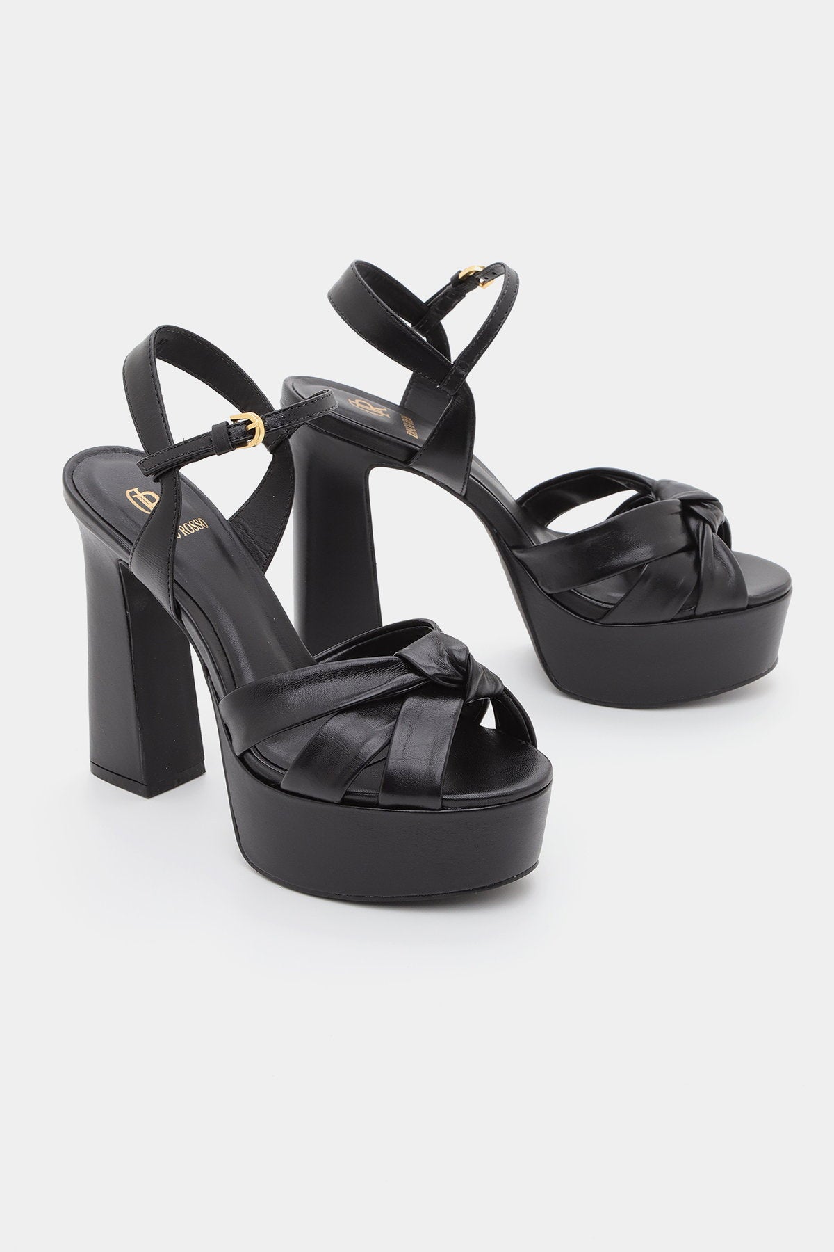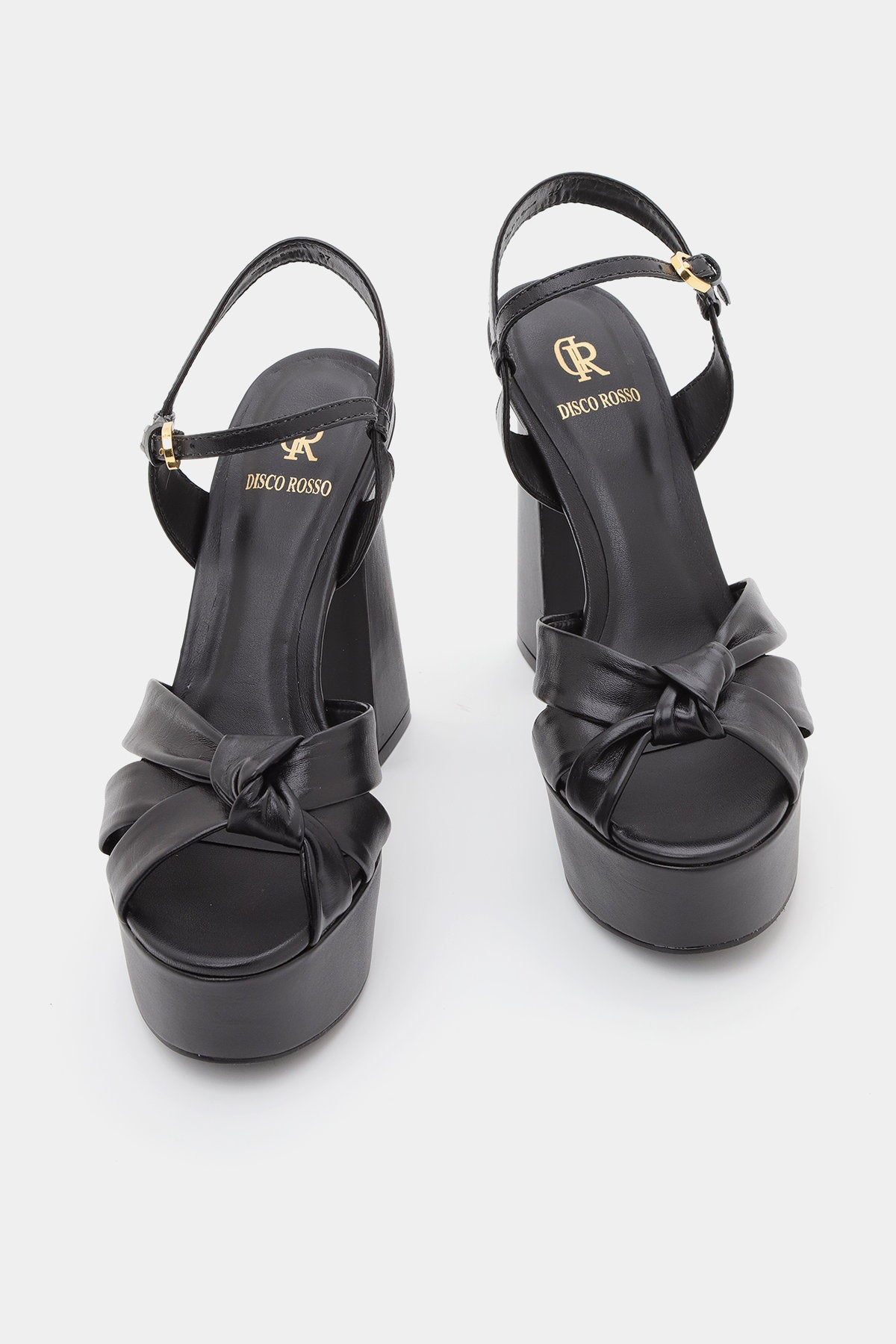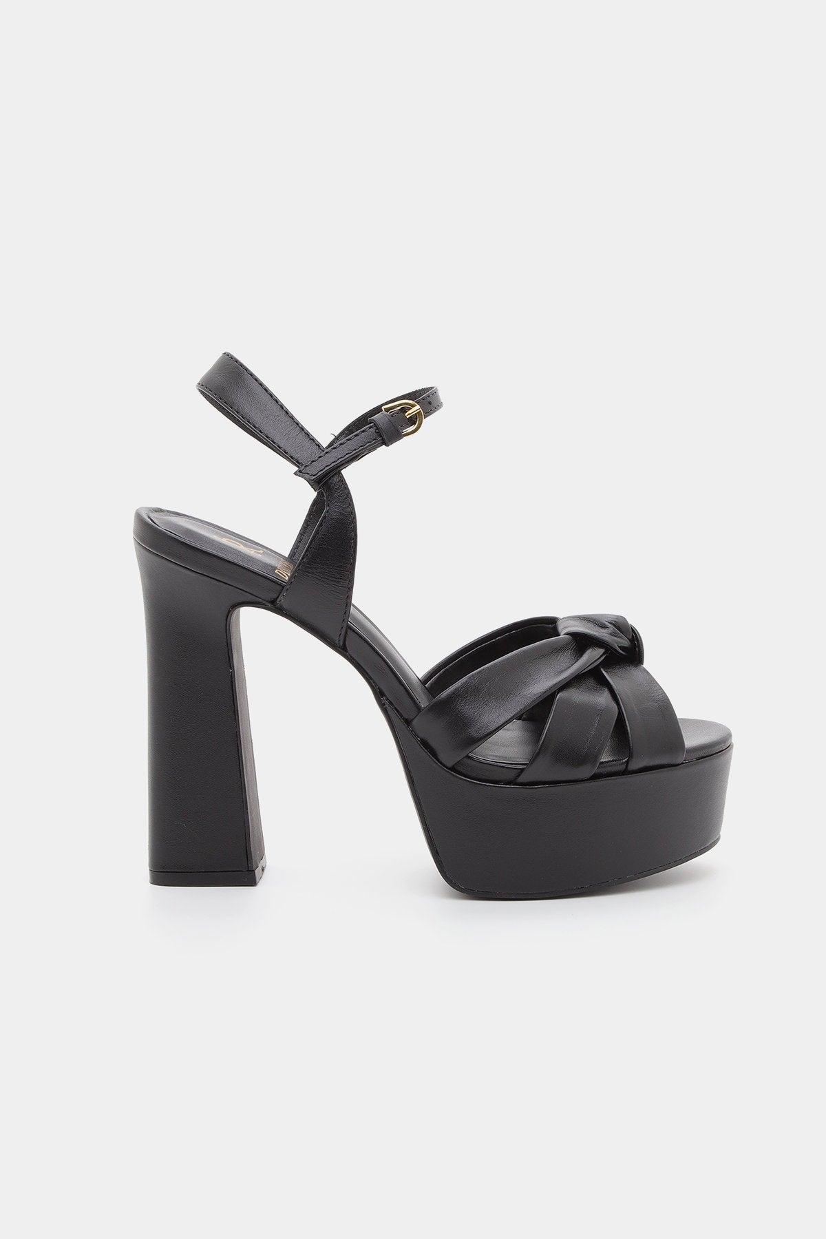 סנדל עקב שחור עם רצועת קרסול, עקב פלטפורמה גבוה ורצועת עור קשר מקדימה