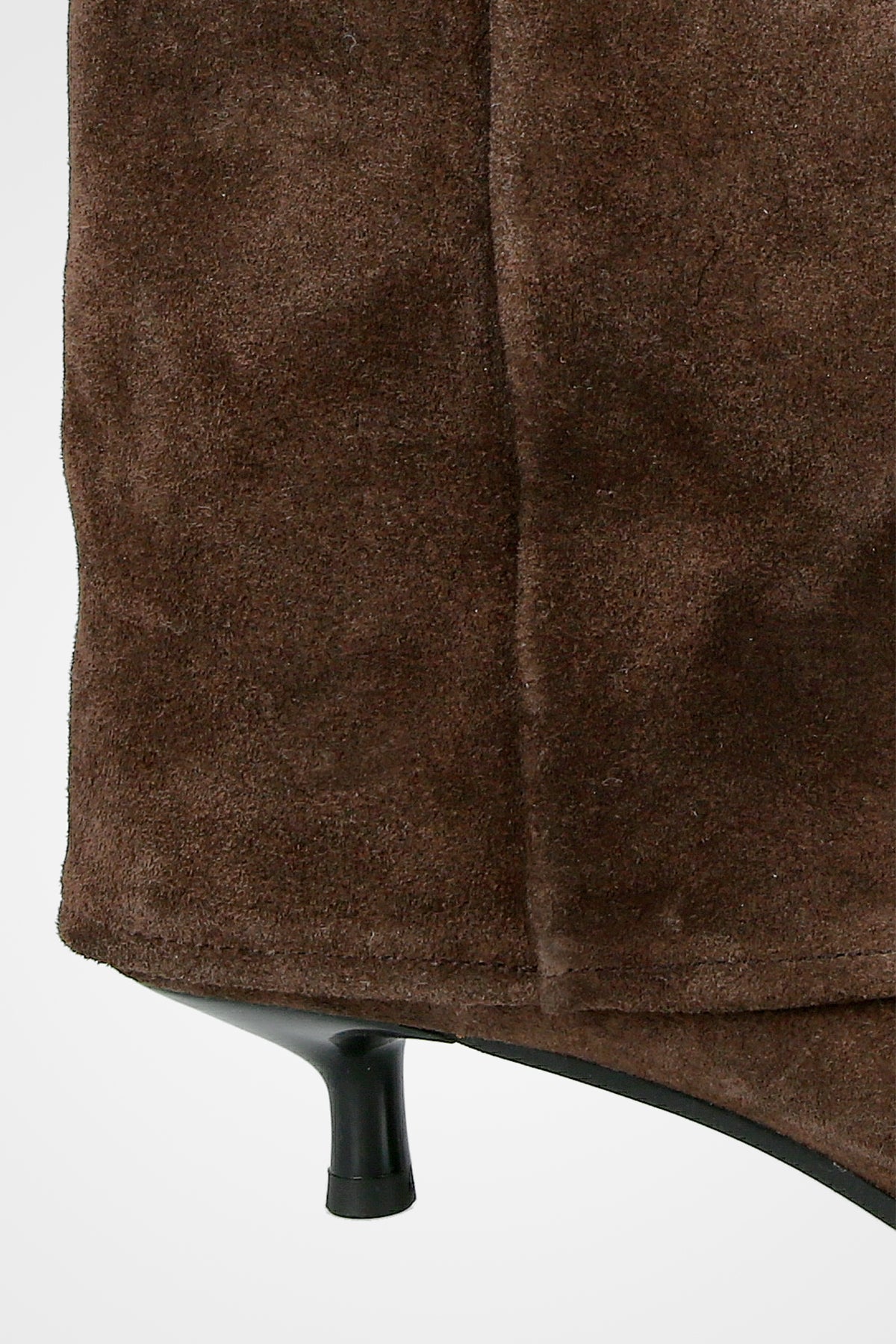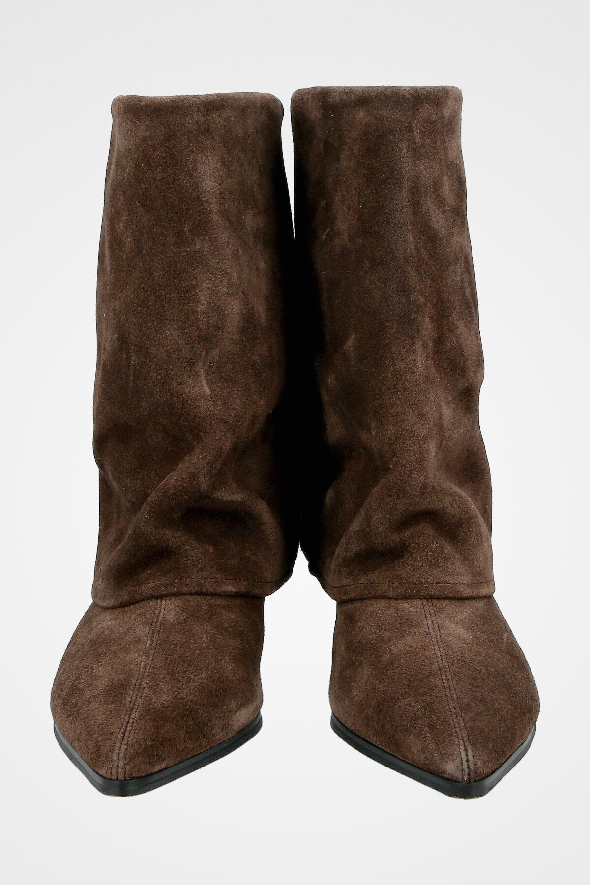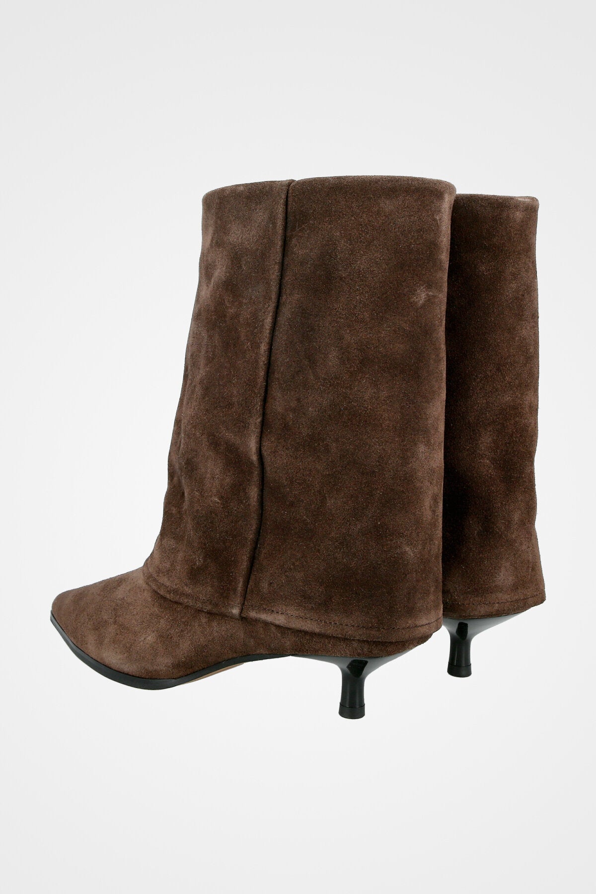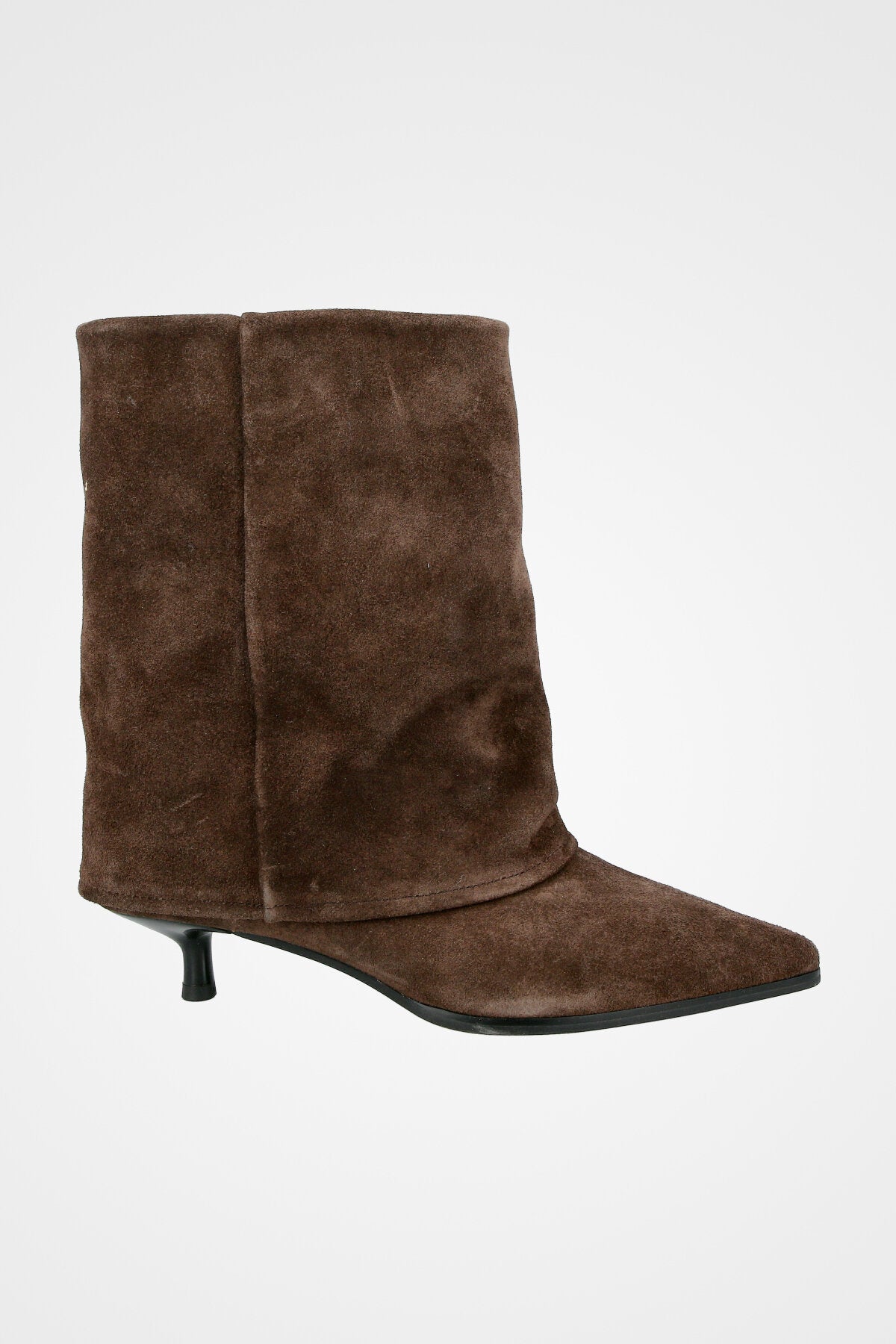 מגפון שפיץ מקופל עשוי מעור זמש בצבע חום, עקב דק נמוך