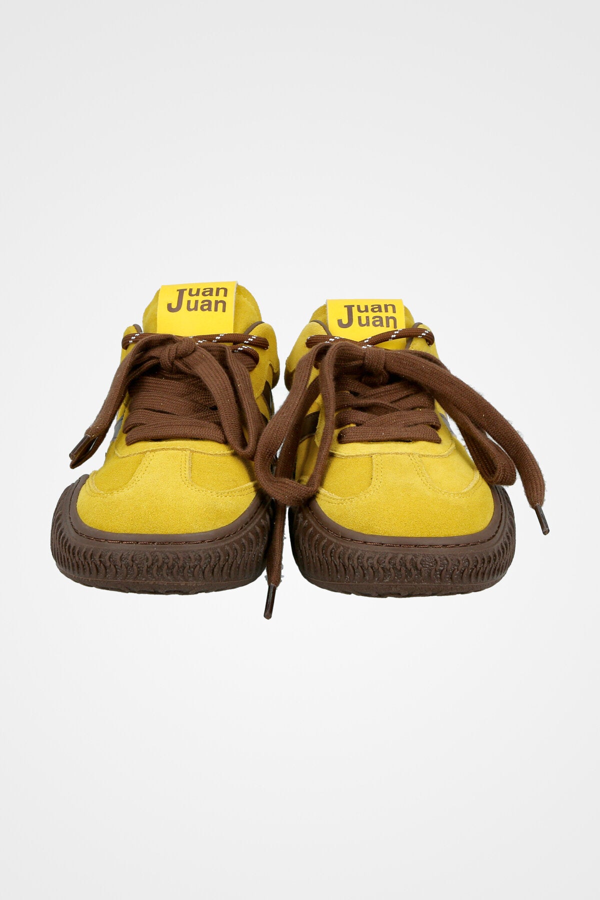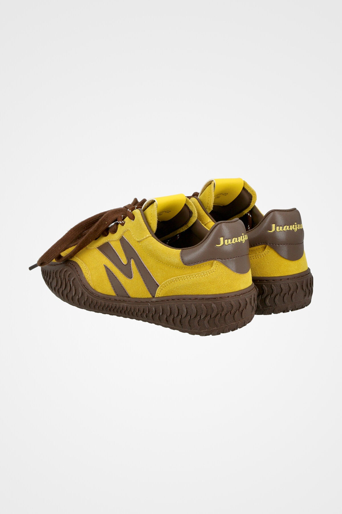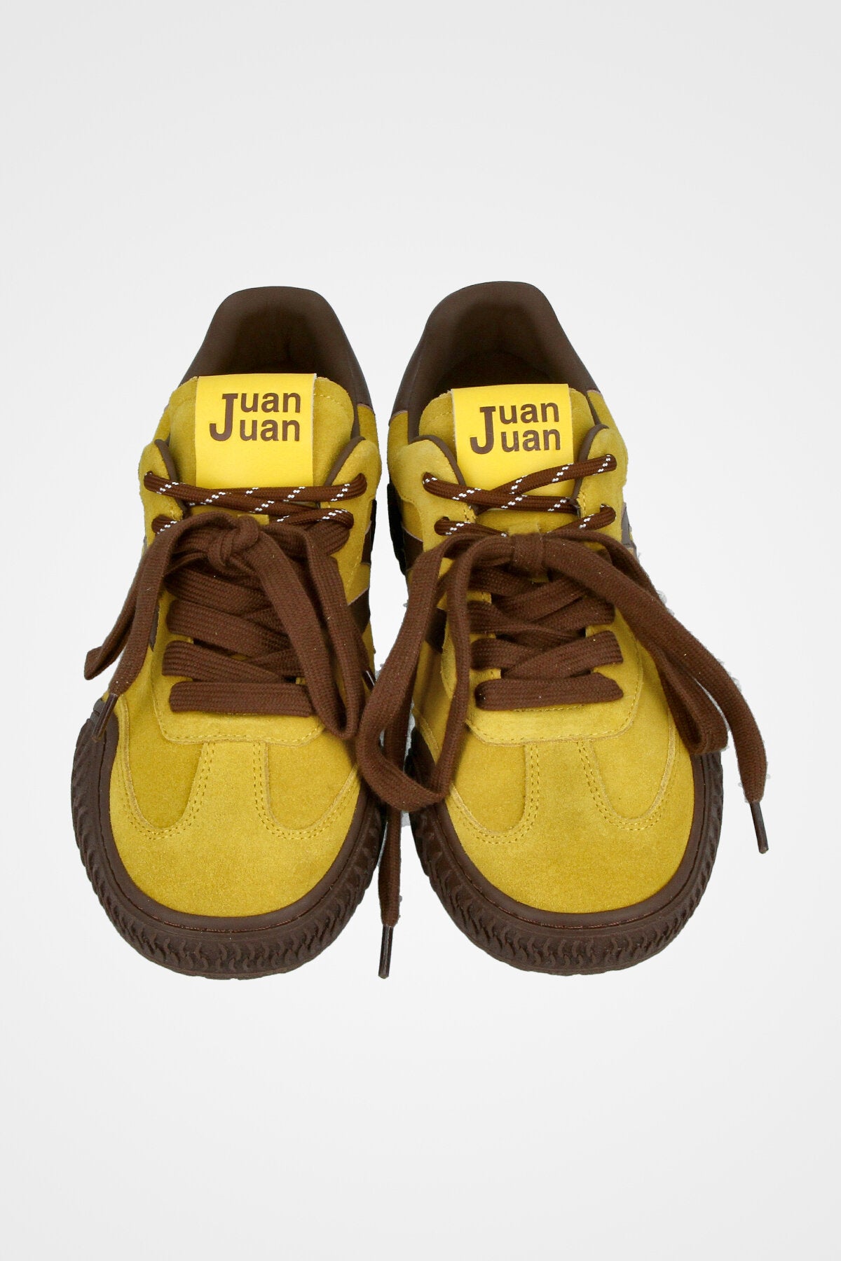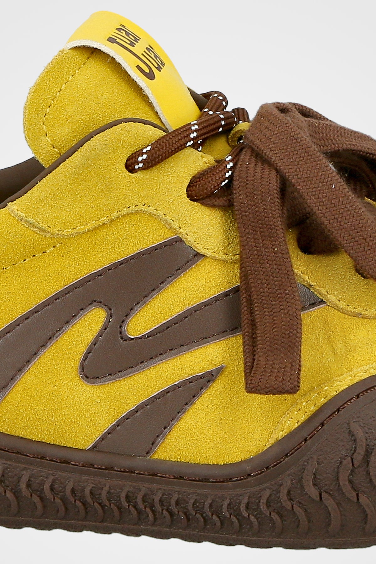 סניקרס זמש בצבע צהוב בשילוב עיטורים בצבע חום כהה, סולייה עבה ומעוצבת ושרוכים עבים