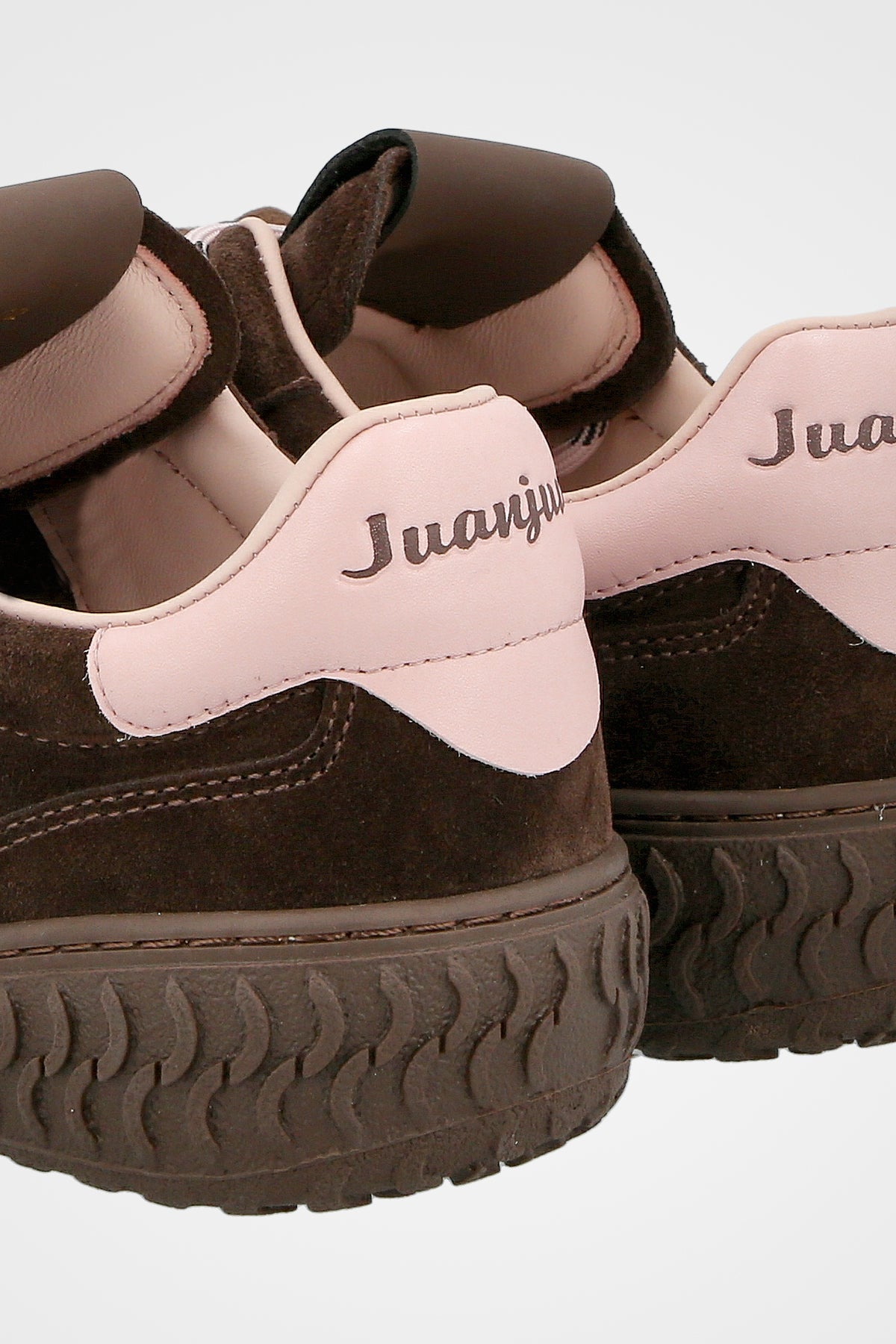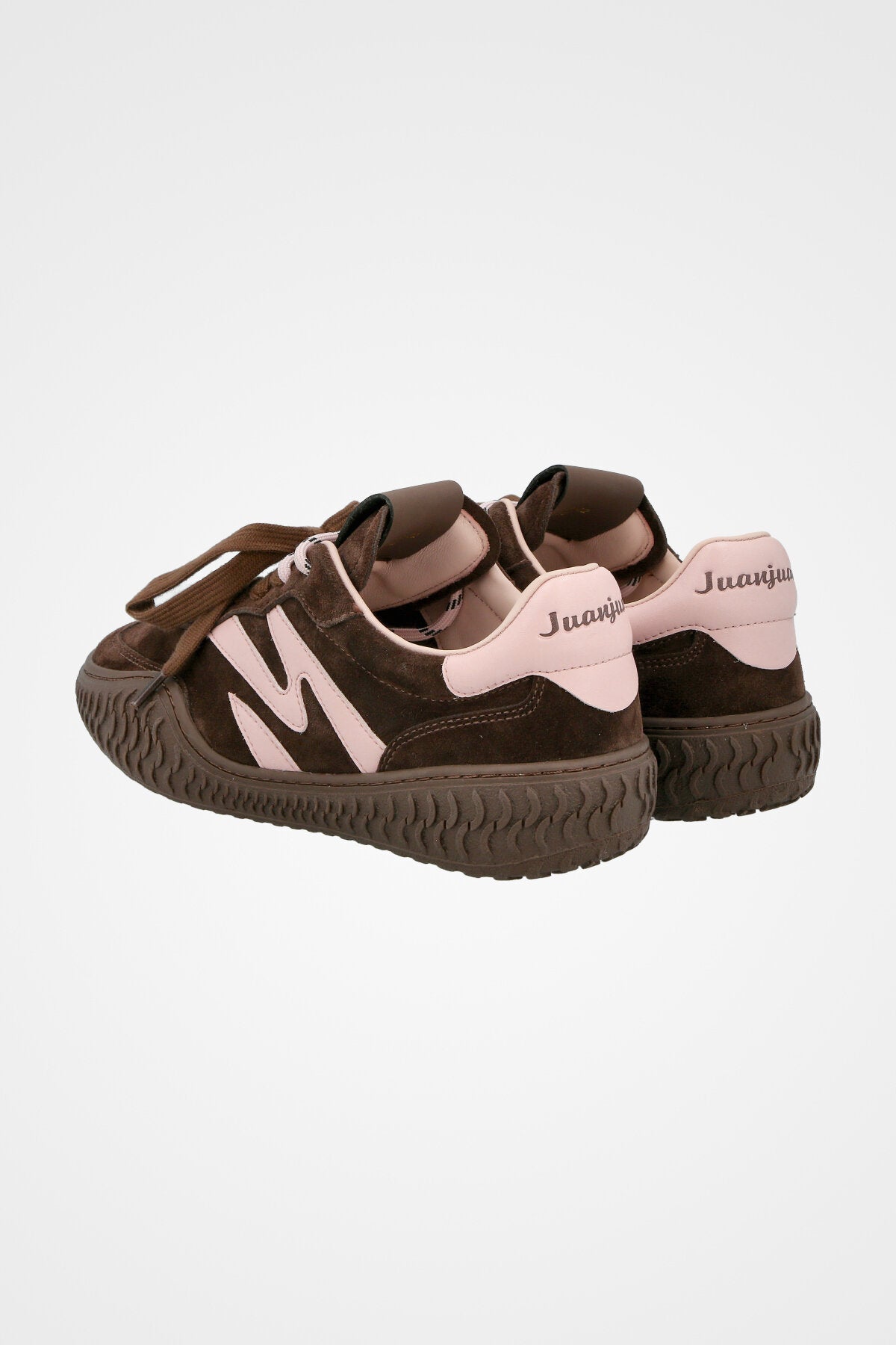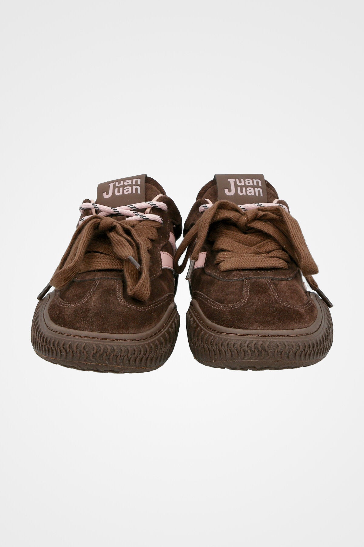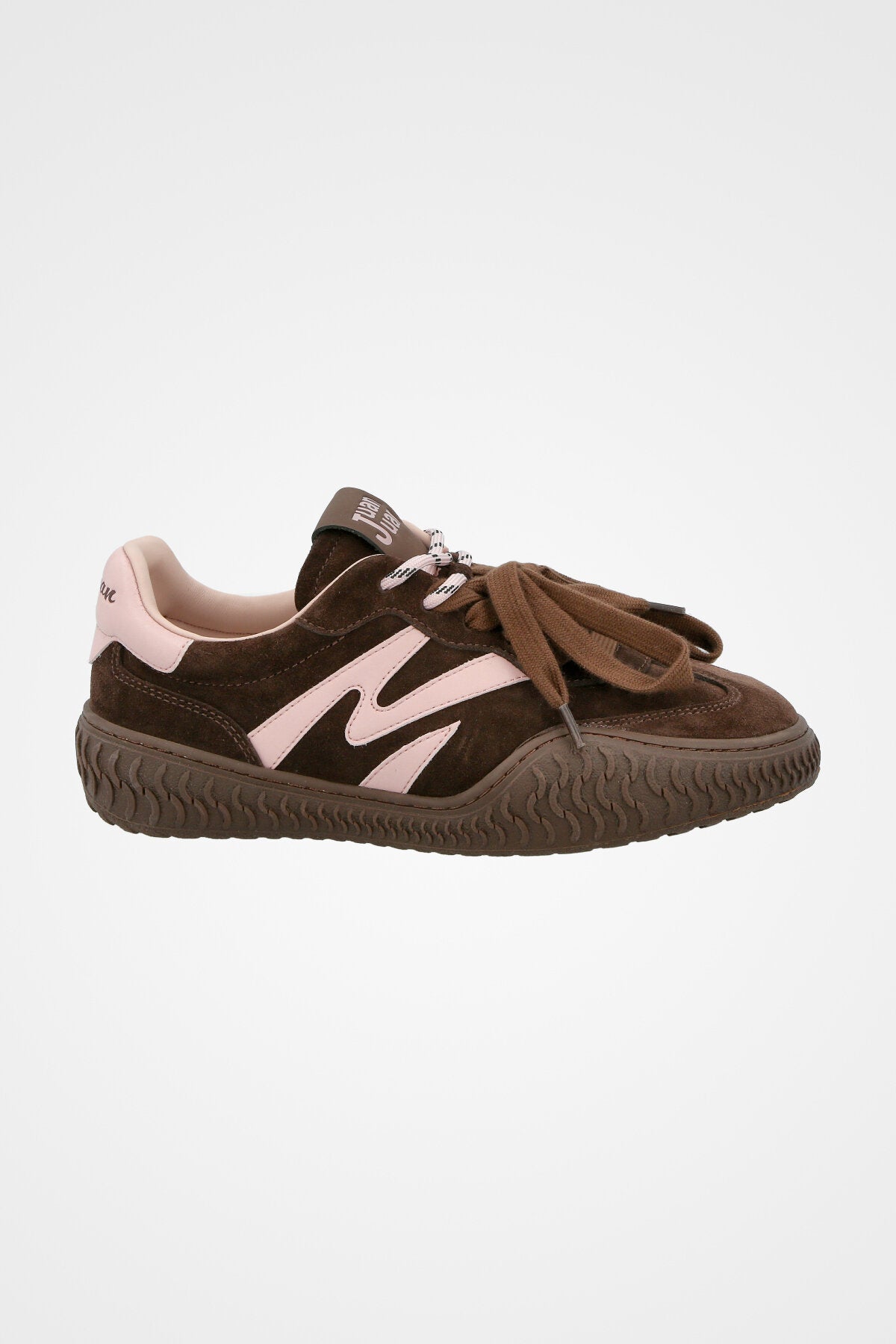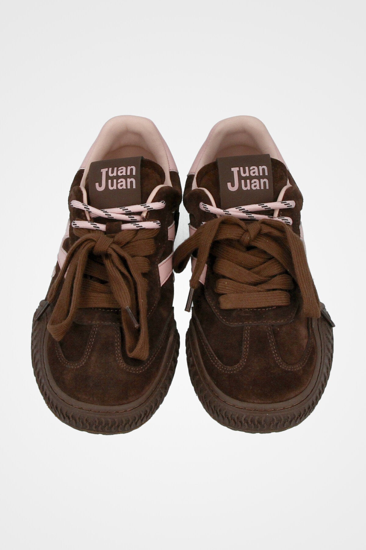 סניקרס זמש בצבע חום כהה בשילוב עיטורים בצבע ורוד, סולייה עבה ומעוצבת ושרוכים עבים