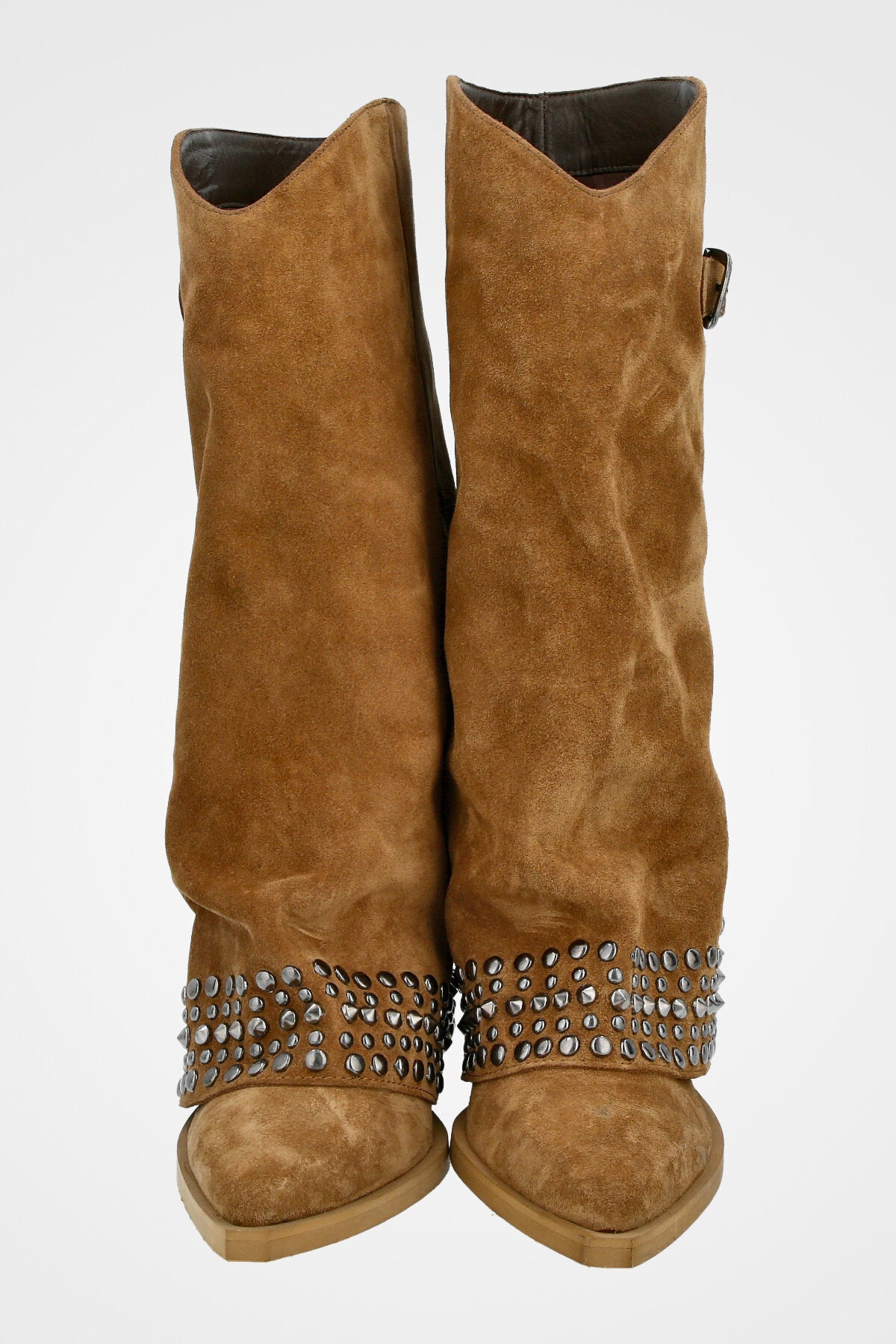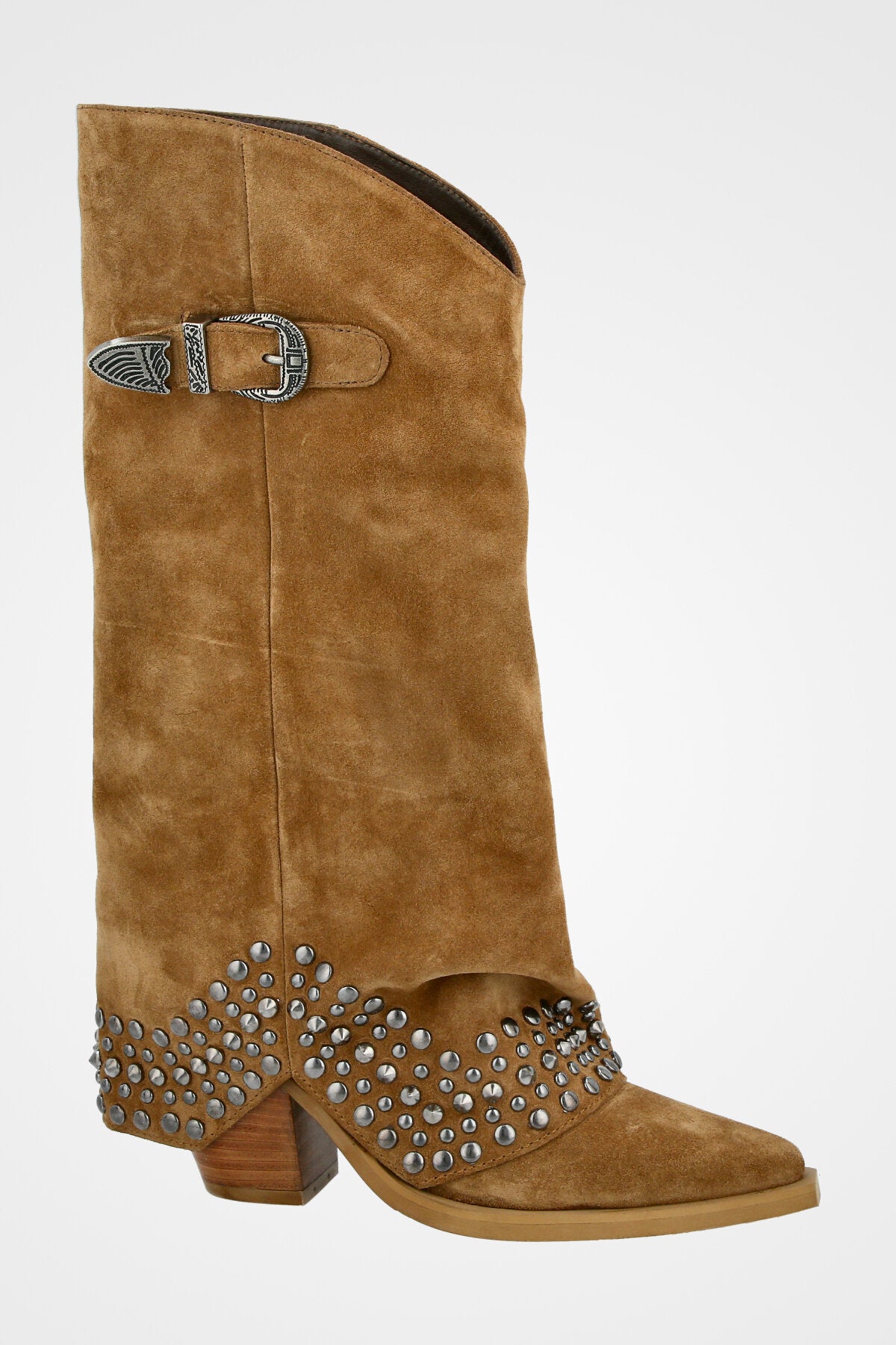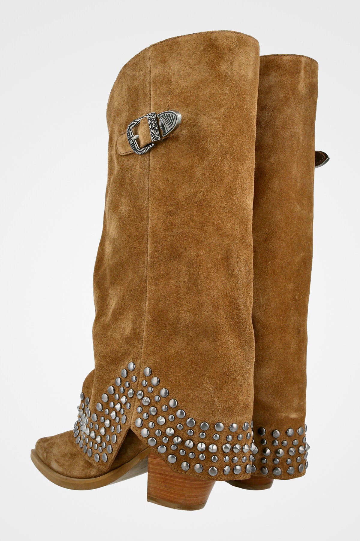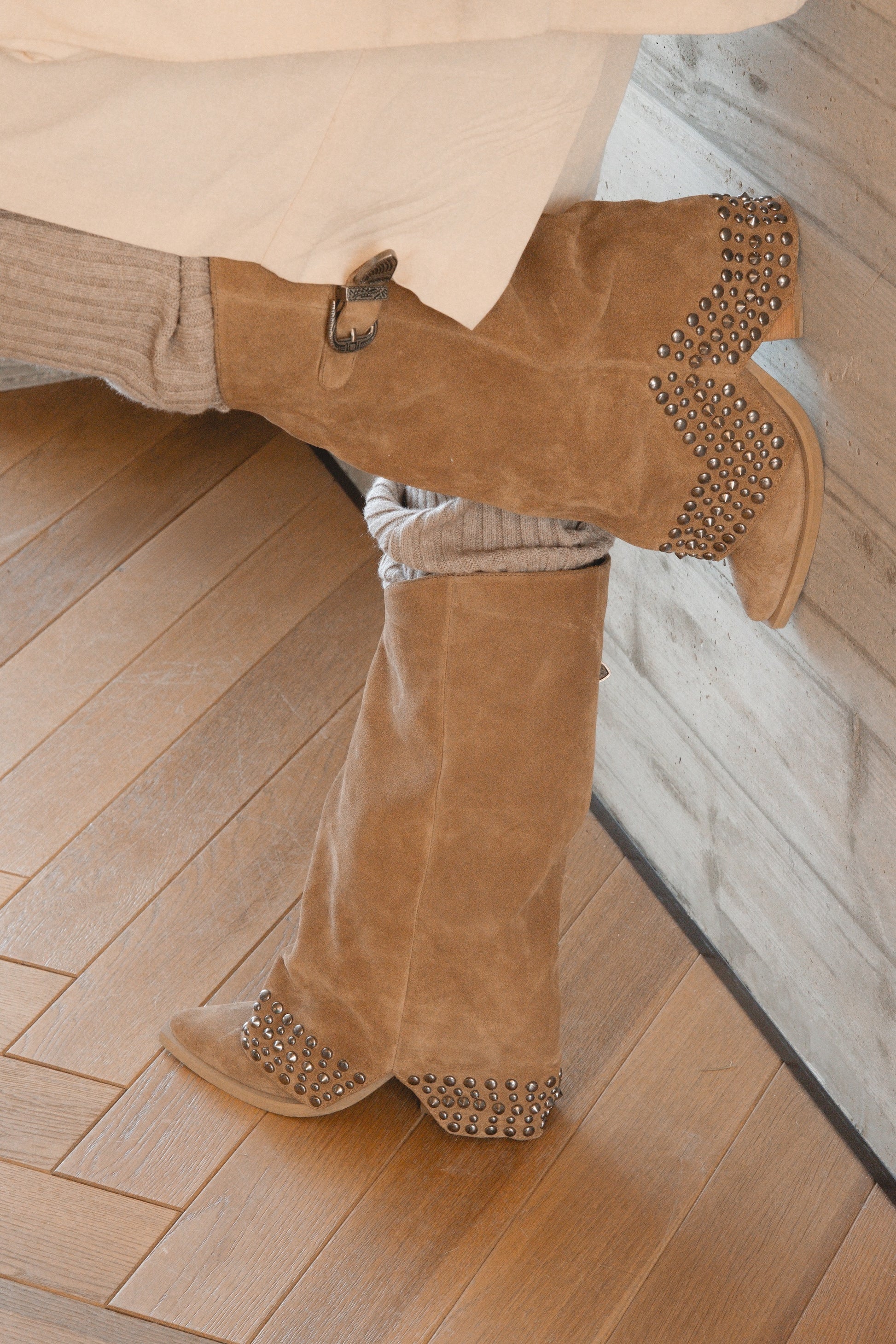 מגף חום גבוה עם גזרה רכה, חזית מחודדת, עקב בינוני רחב וקישוט ניטים מתכתיים סביב הקרסול