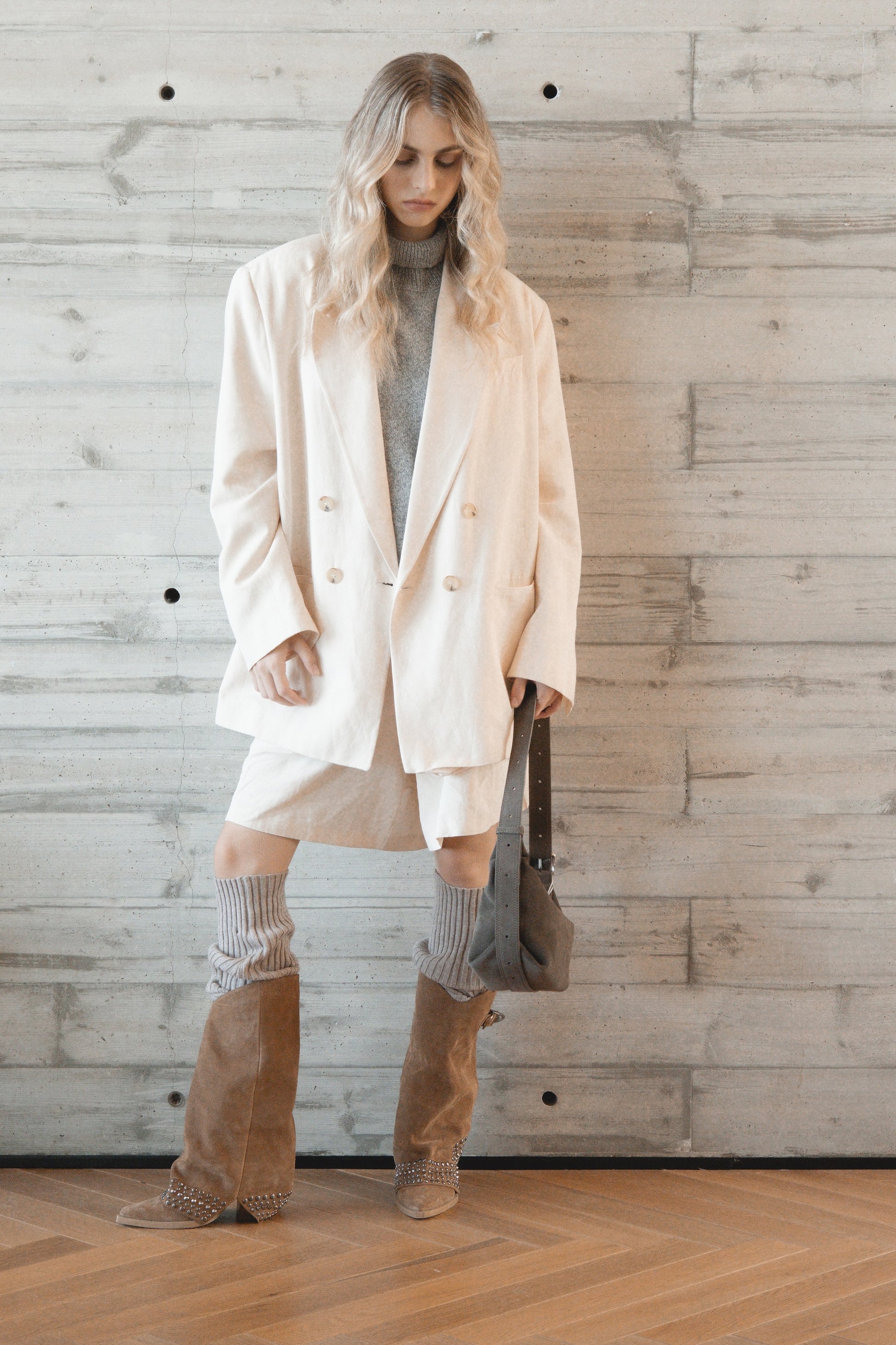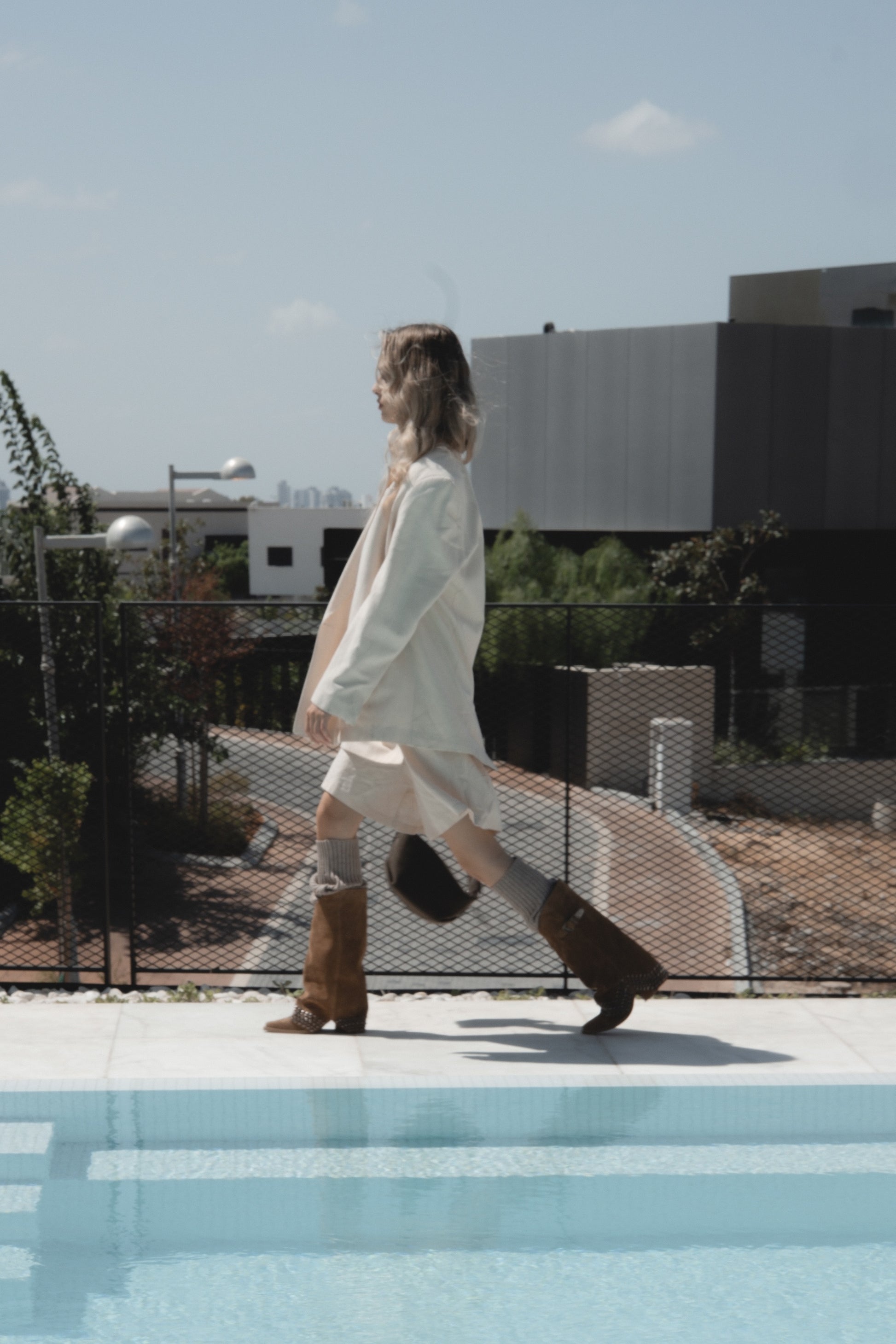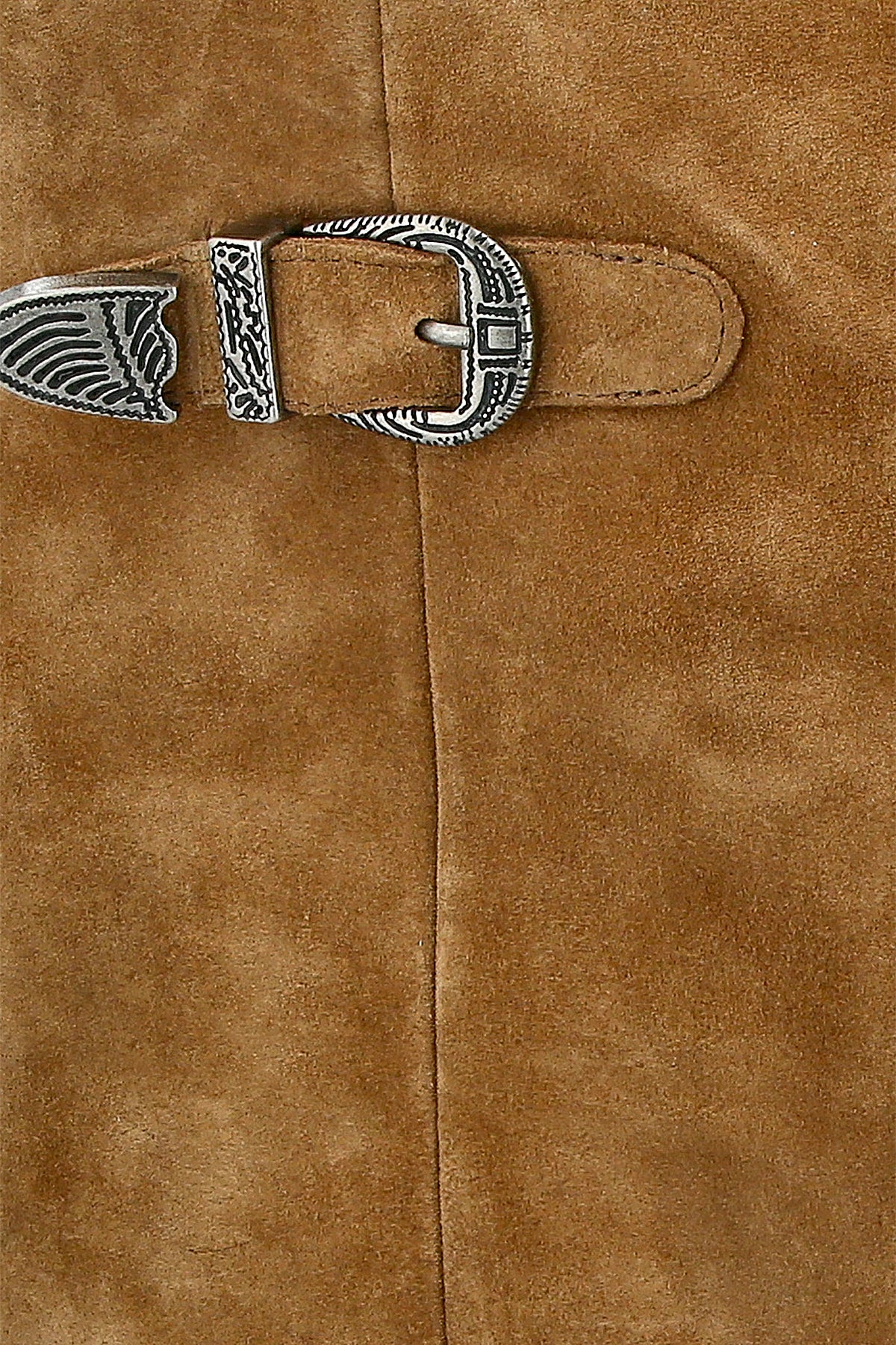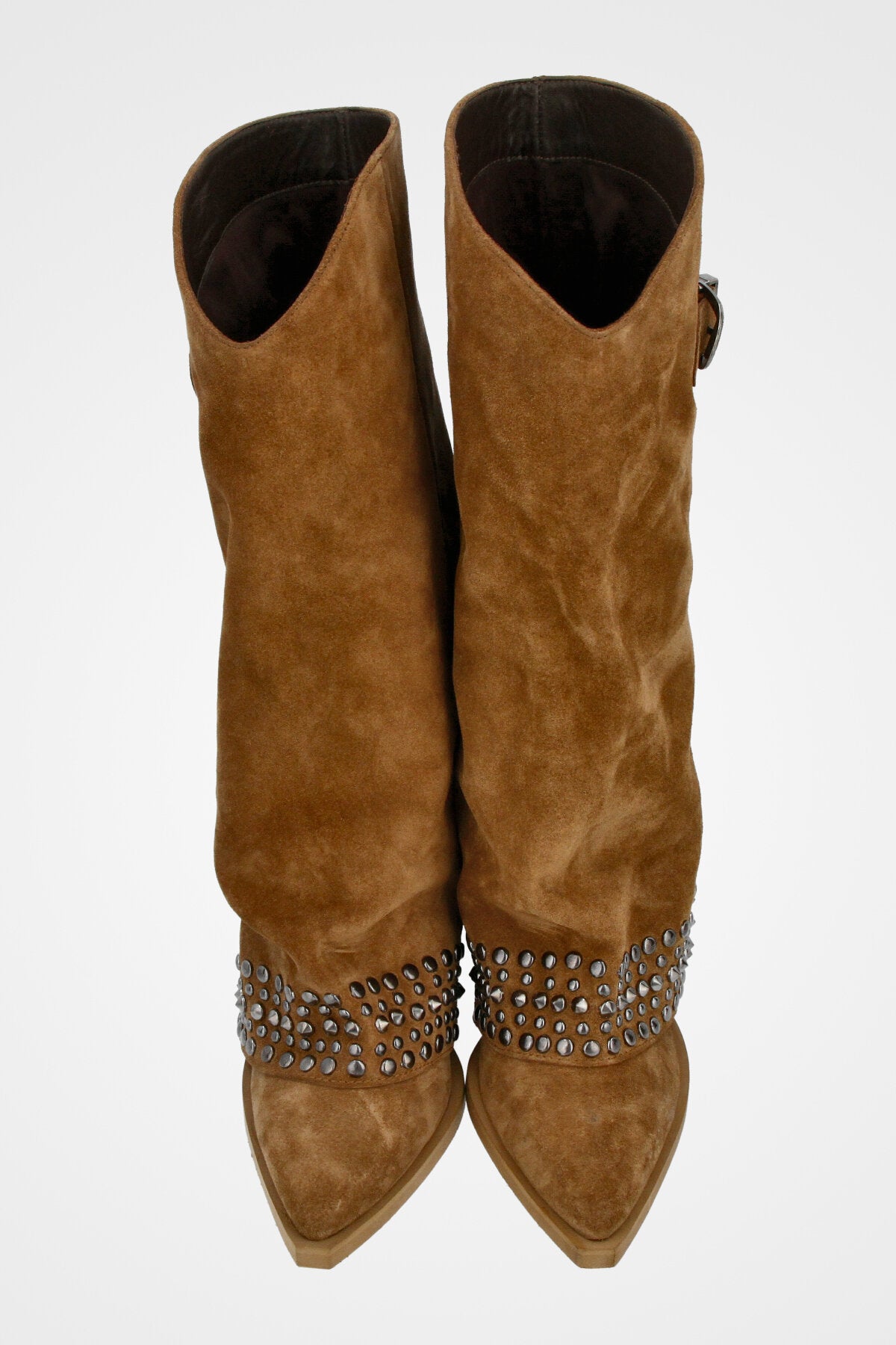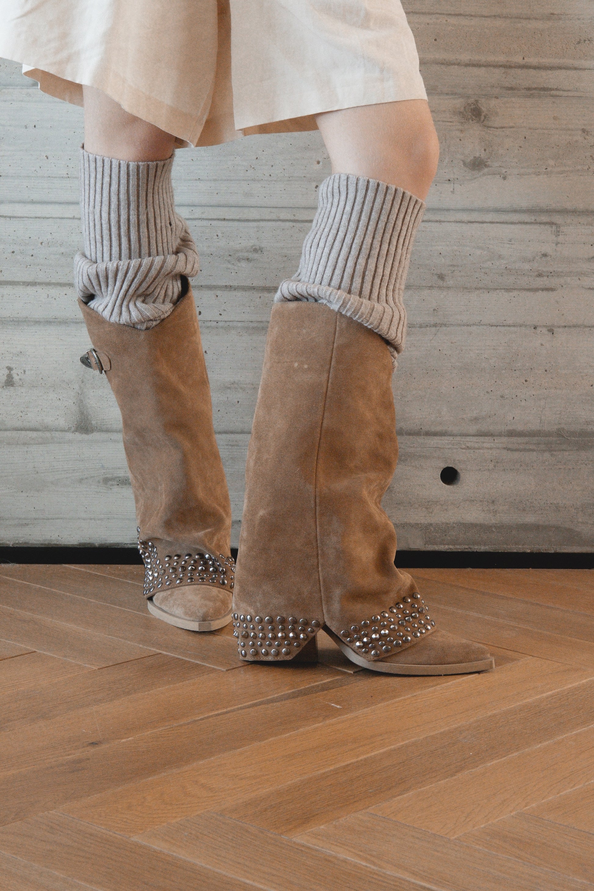 מגף חום גבוה עם גזרה רכה, חזית מחודדת, עקב בינוני רחב וקישוט ניטים מתכתיים סביב הקרסול