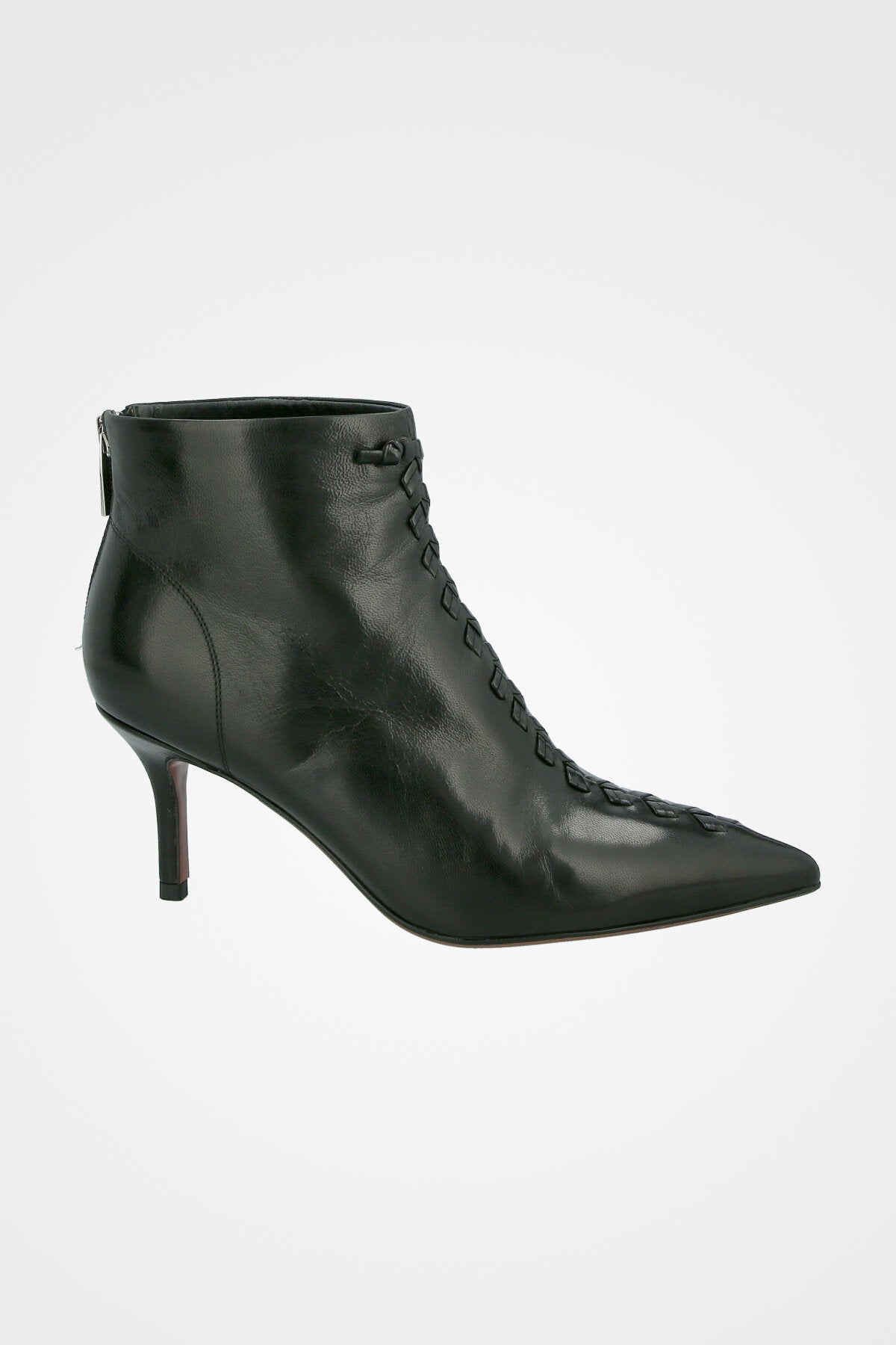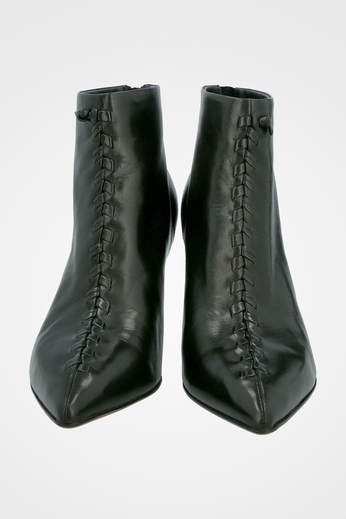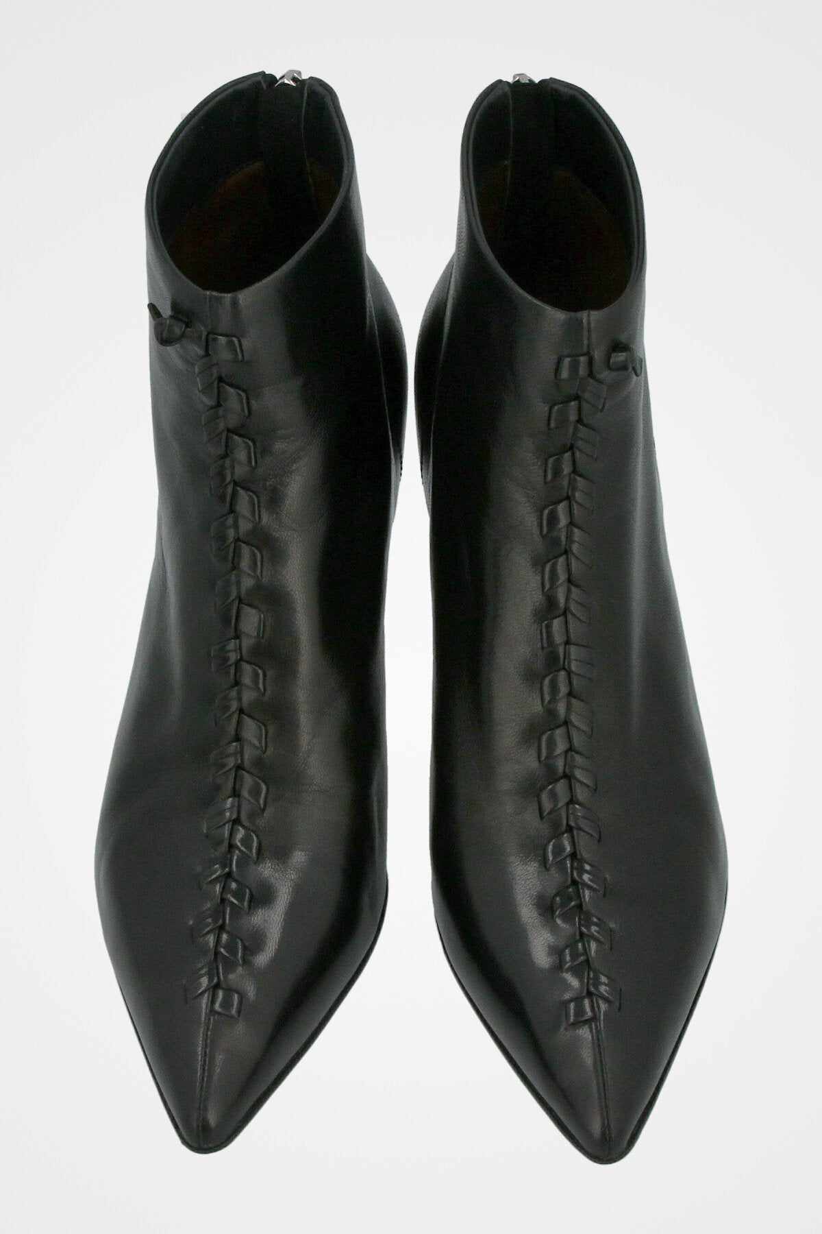מגפון שפיץ שחור מעור, עם עקב בינוני דק, וסגירת רכסן אחורית ותפרים עדינים דקורטיבים בחזית