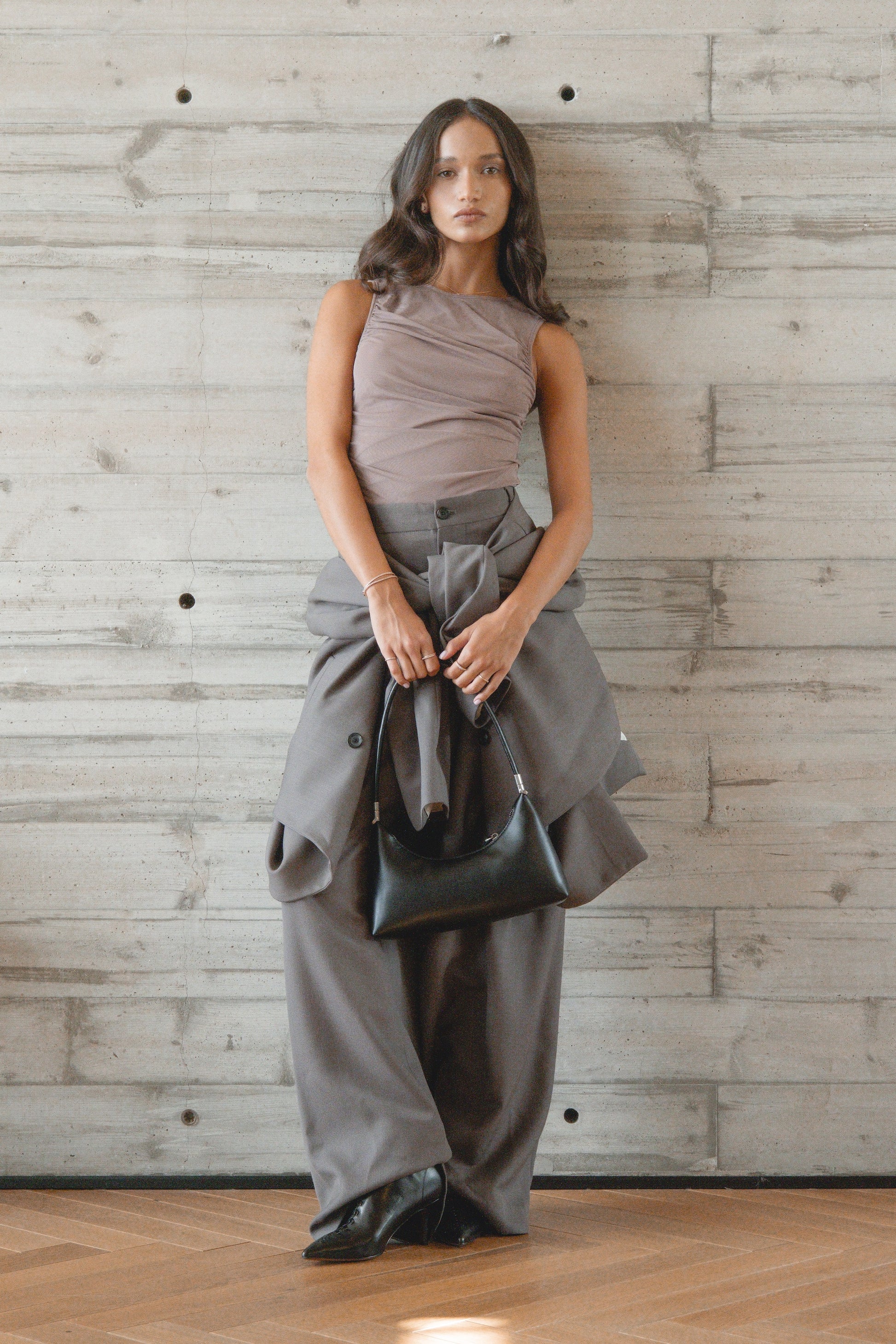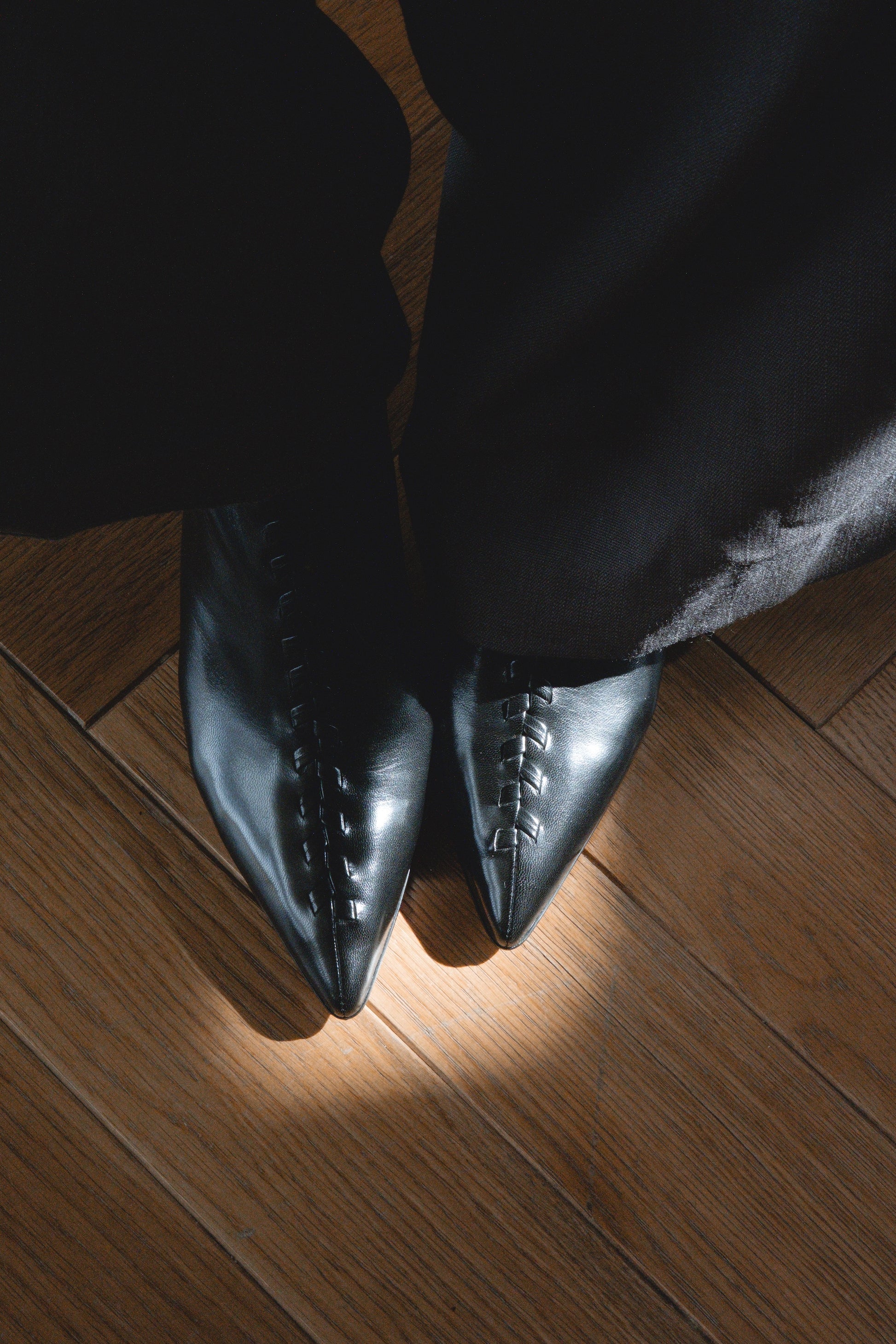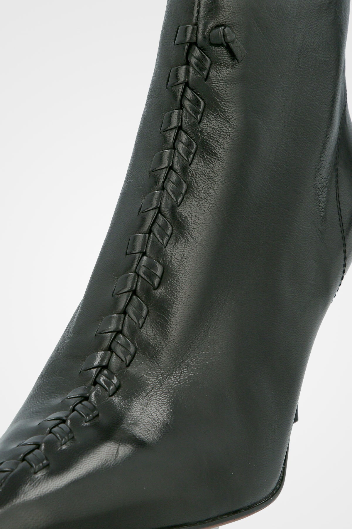 מגפון שפיץ שחור מעור, עם עקב בינוני דק, וסגירת רכסן אחורית ותפרים עדינים דקורטיבים בחזית