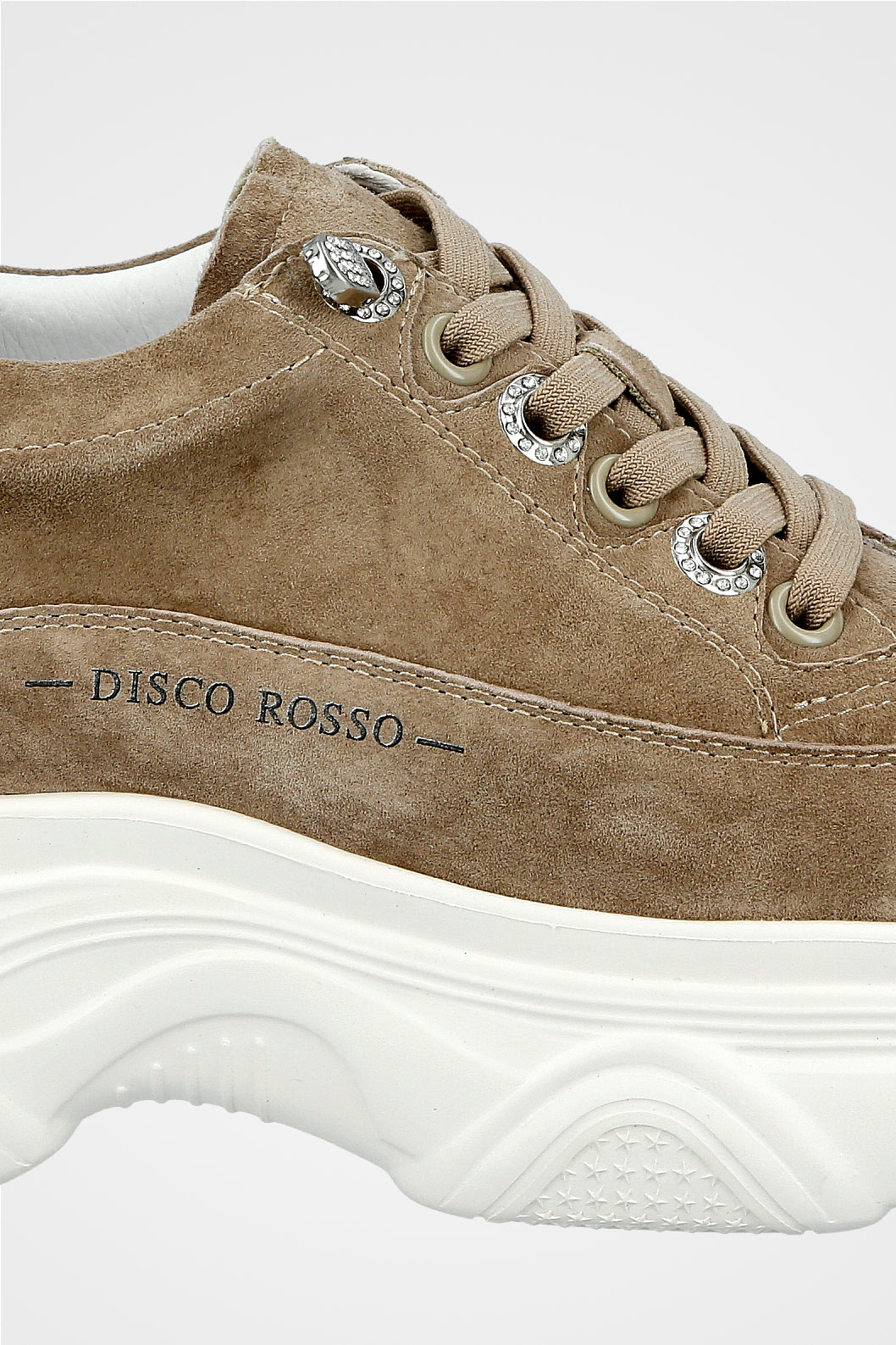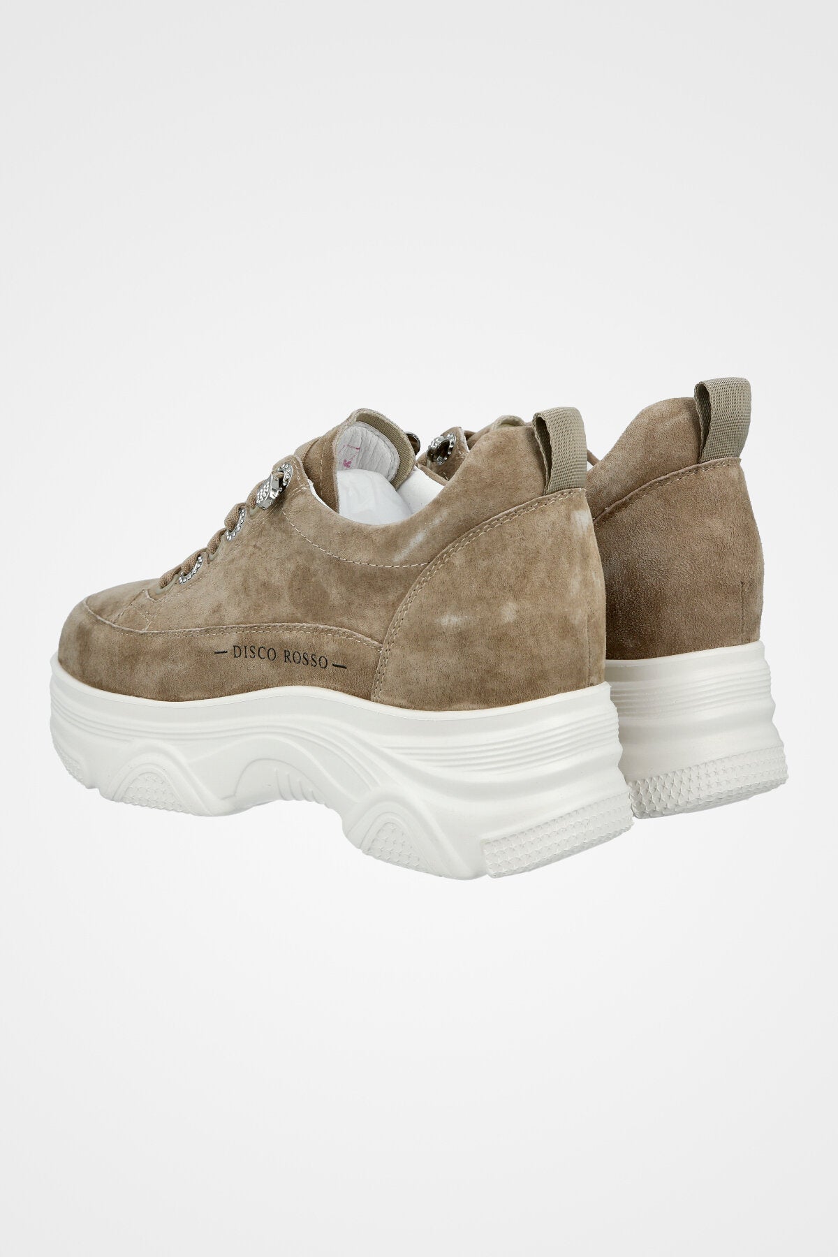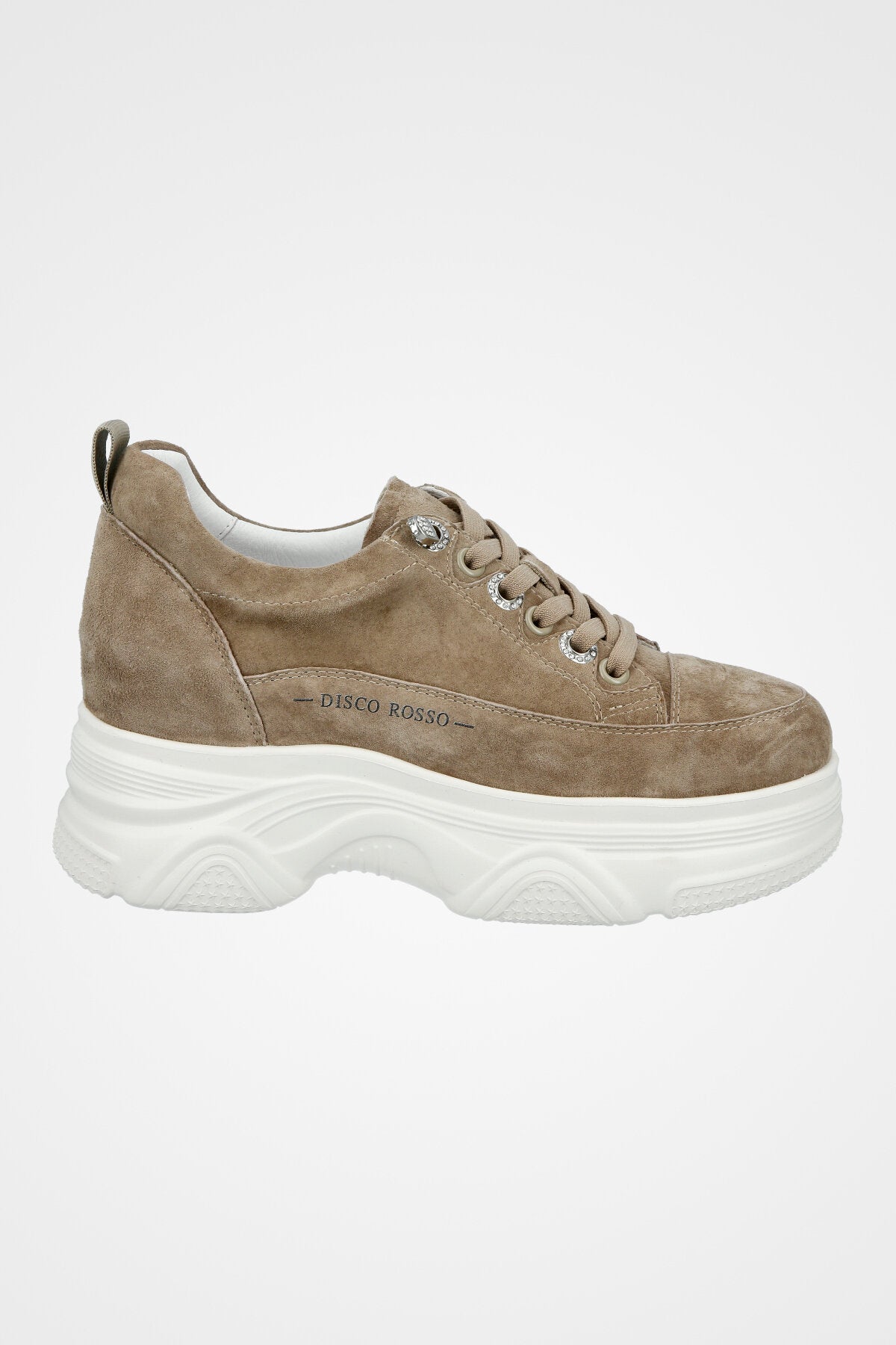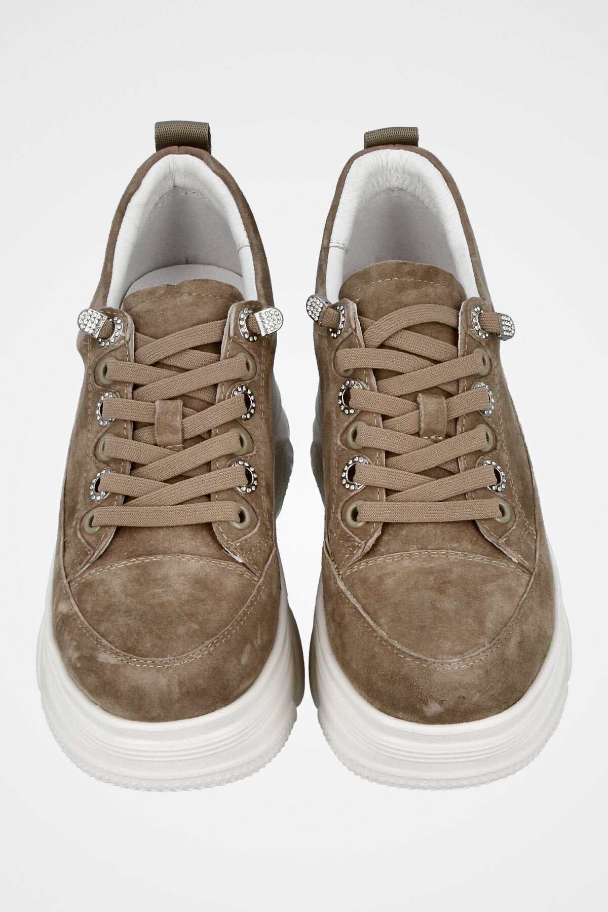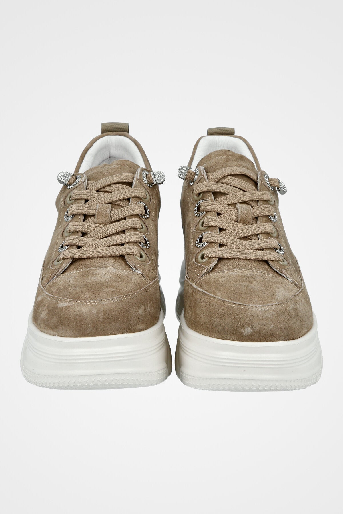נעל סניקרס זמש נמוכה בצבע קאמל, שרוכים עבים מגומי, וסוליה לבנה עבה מחורצת