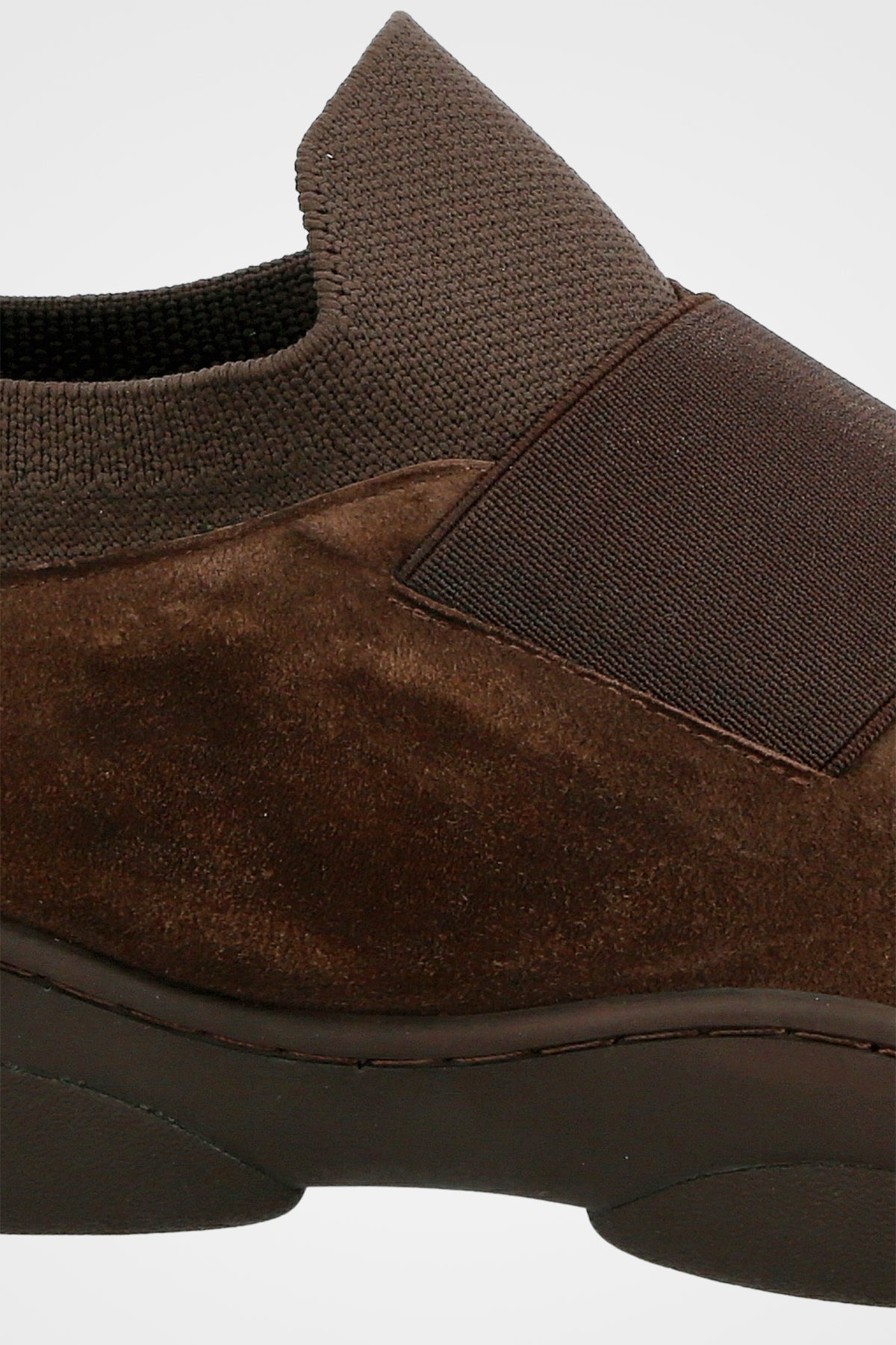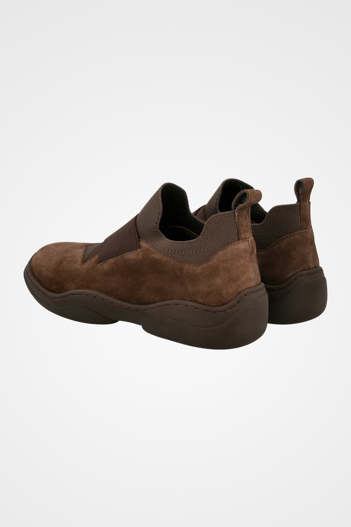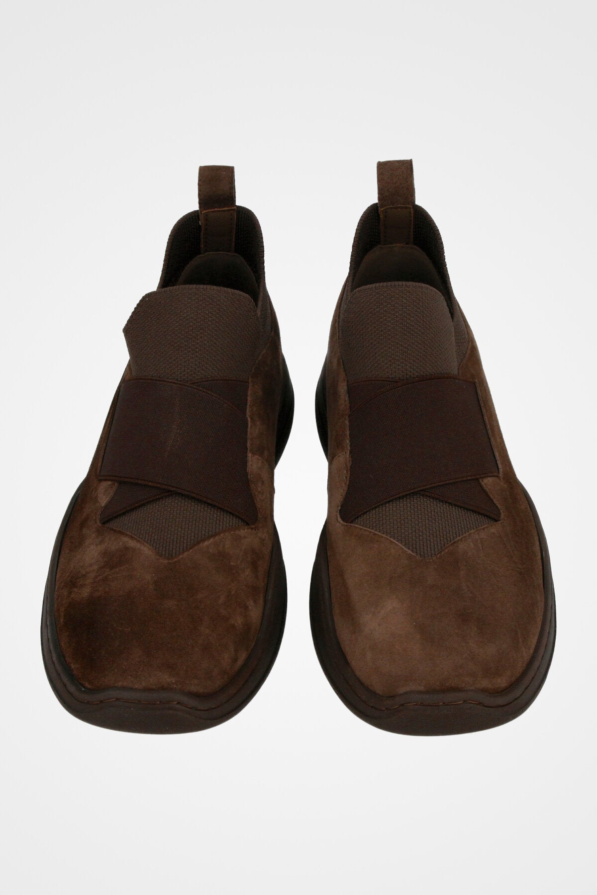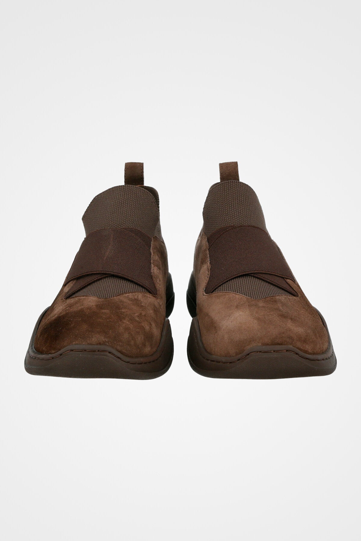 נעל חומה עם מרקם קטיפתי, סוליה חומה עבה, רצועות אלסטיות מוצלבות ופטנט אחורי למשיכה.
