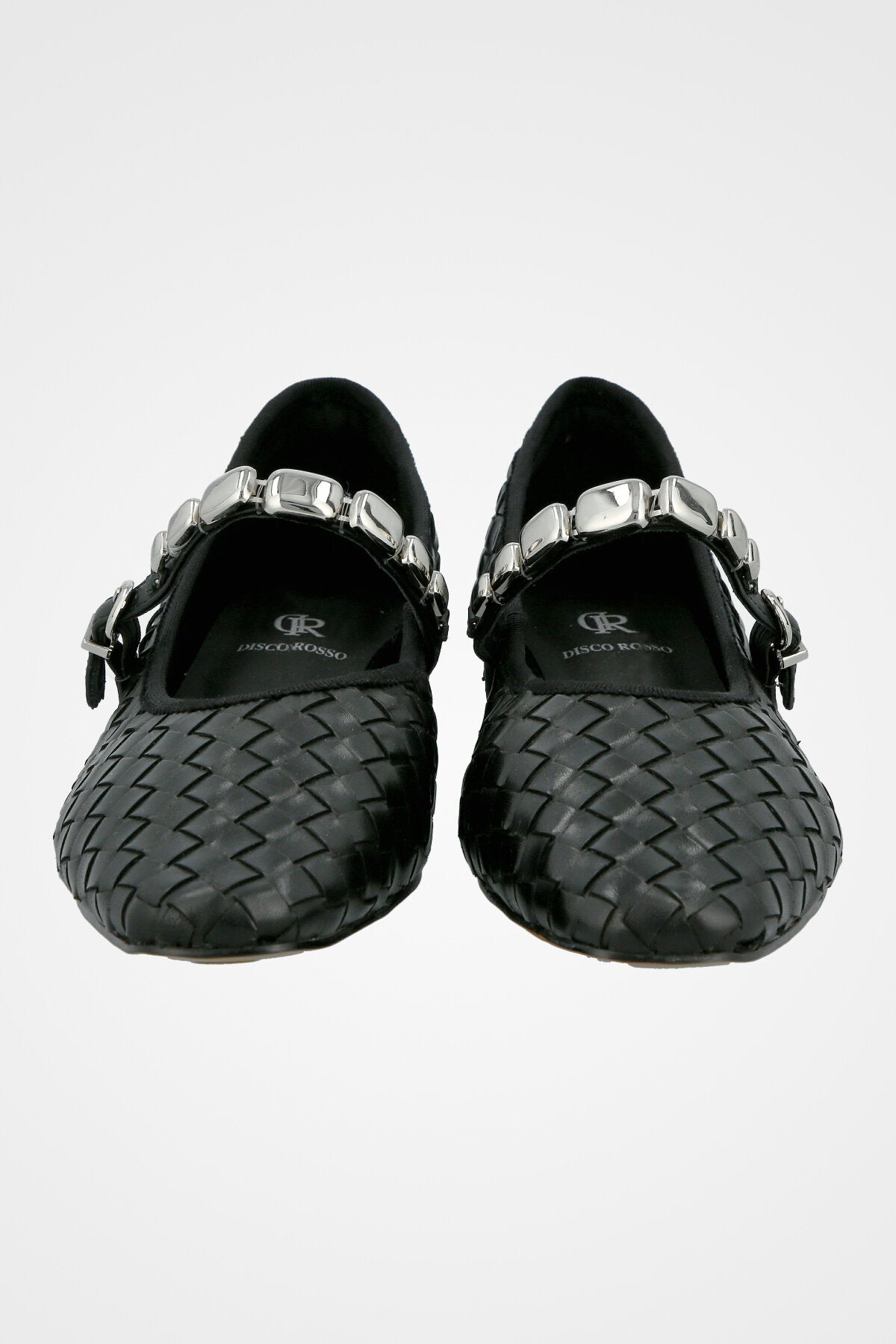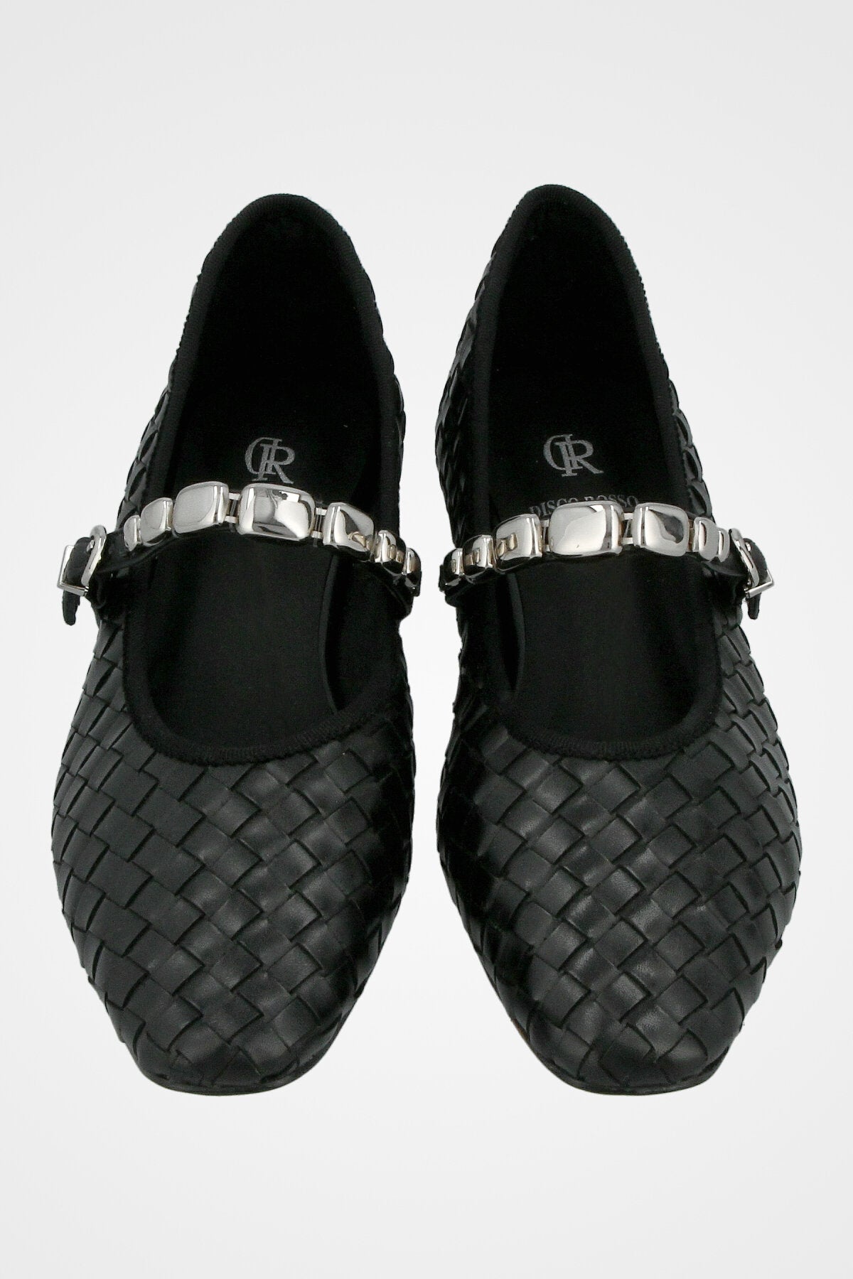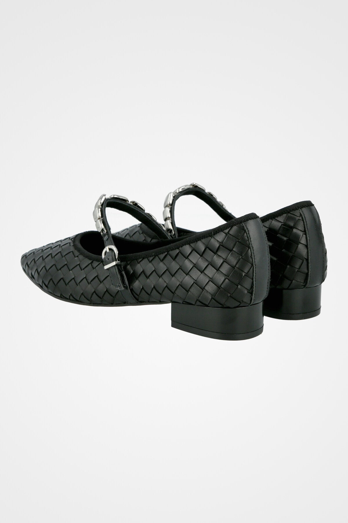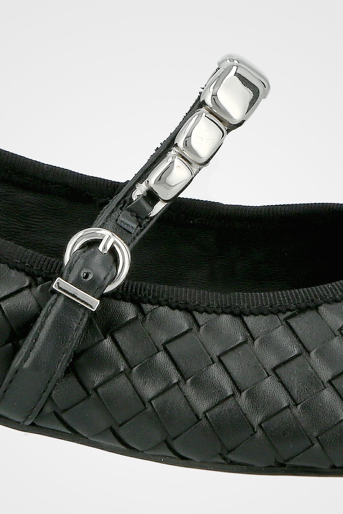 נעל בובה שחורה קלועה עם חרטום מחודד, רצועת עור דקה עם אבזמי מתכת כסופים וסויה שטוחה נמוכה